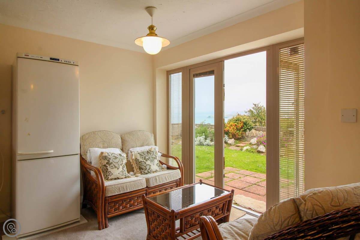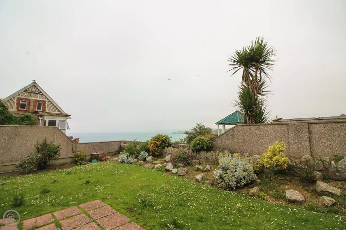 The views are good. You can see out over the water towards Lusty Glaze and Mawgan Porth. There's an enclosed garden with a table, chairs, and a barbecue. It gets the evening sun.