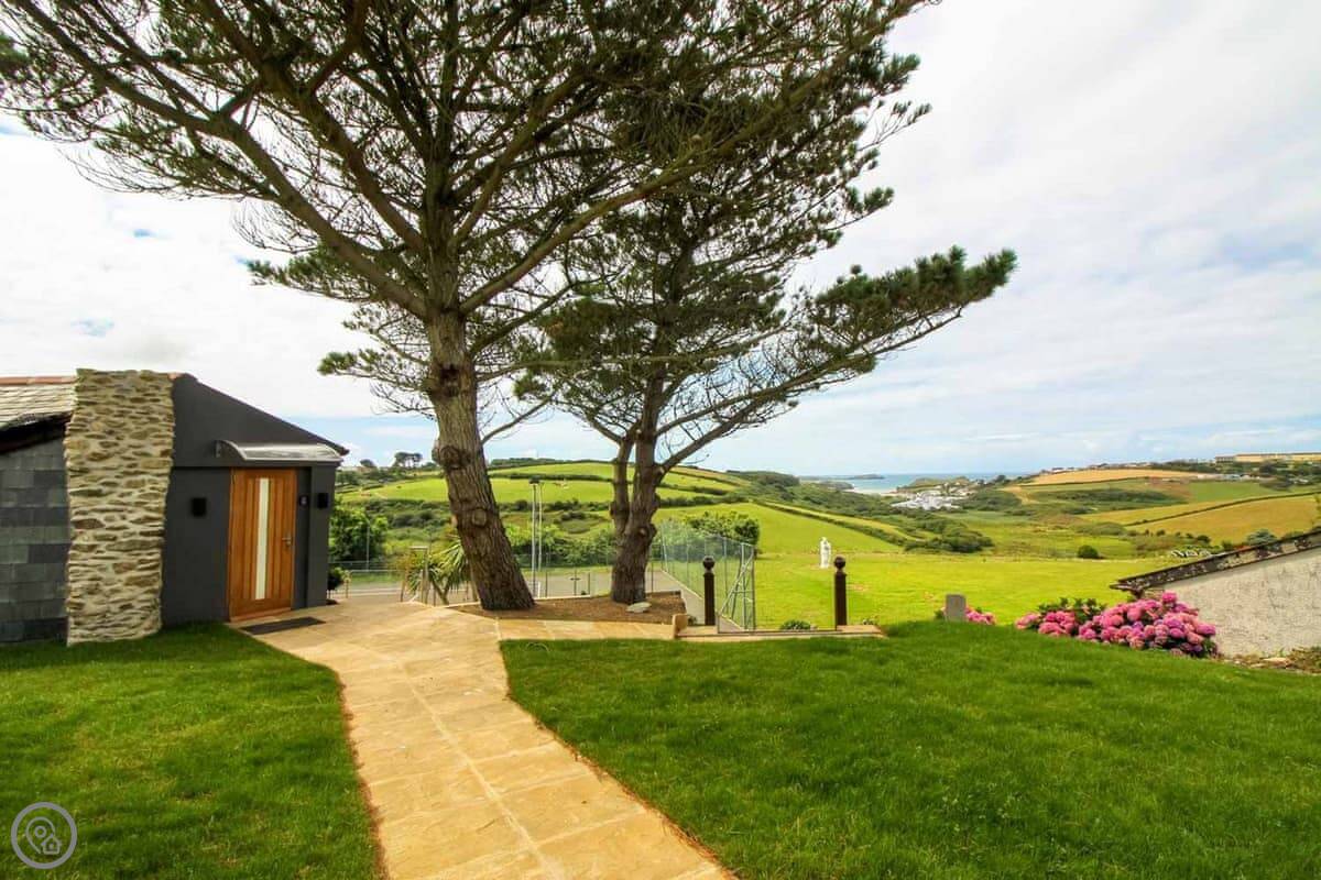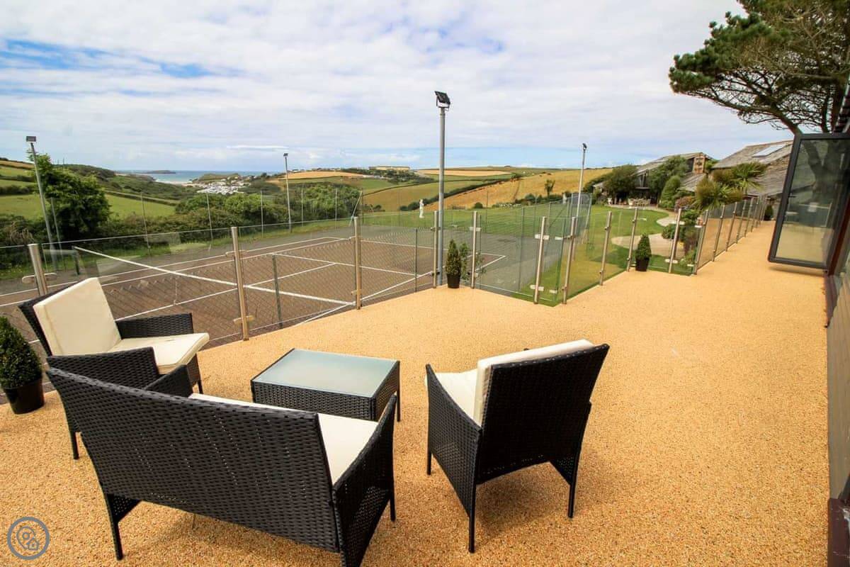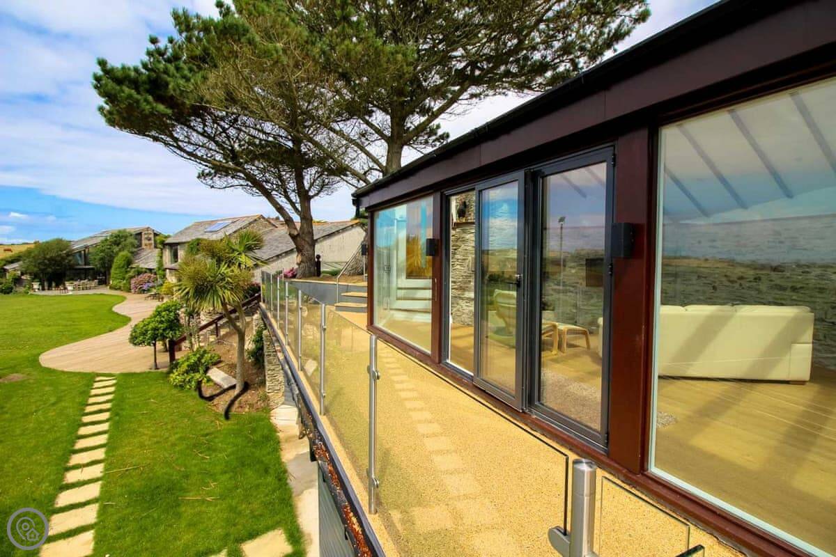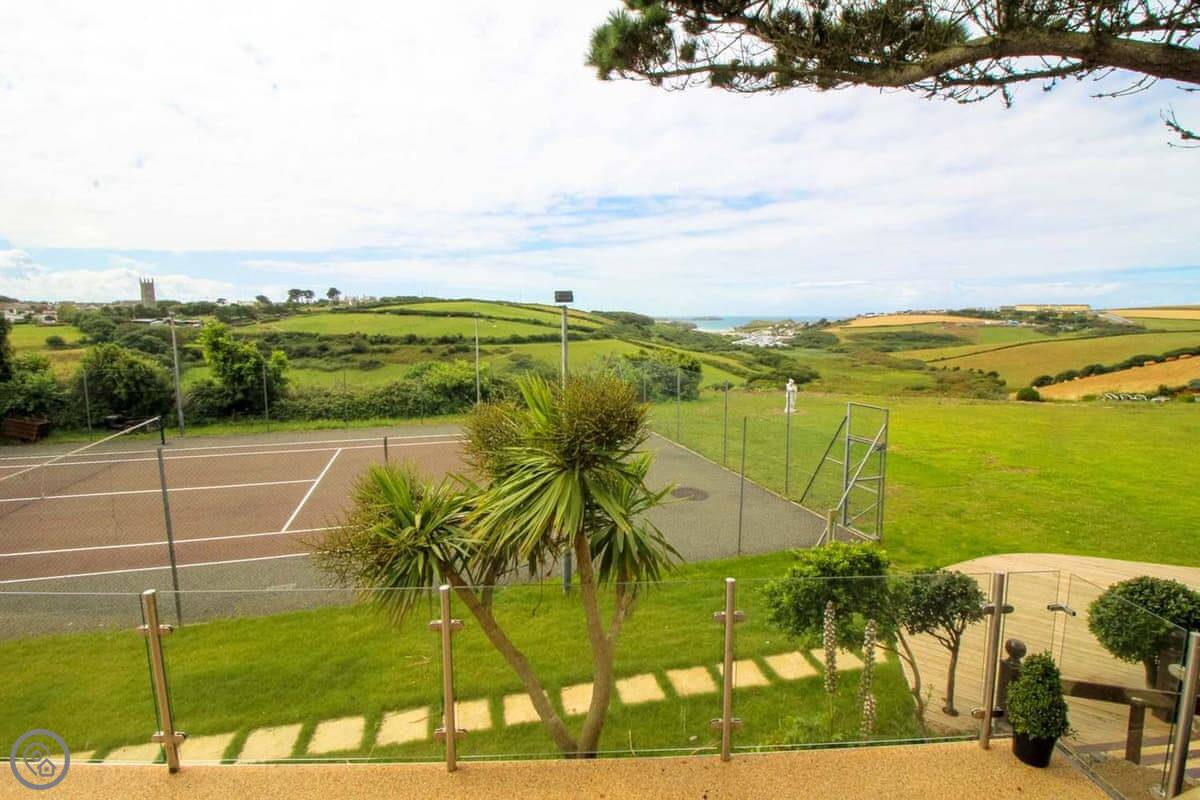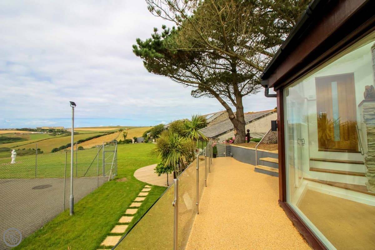 Penrose Lodge is near Newquay, about two miles from Porth beach. It's a modern lodge, stands on its own. The main thing is the view. You get a full-length balcony at the front, all glass, so you just look straight out over the countryside to the sea. You can sit out there all day if you want.