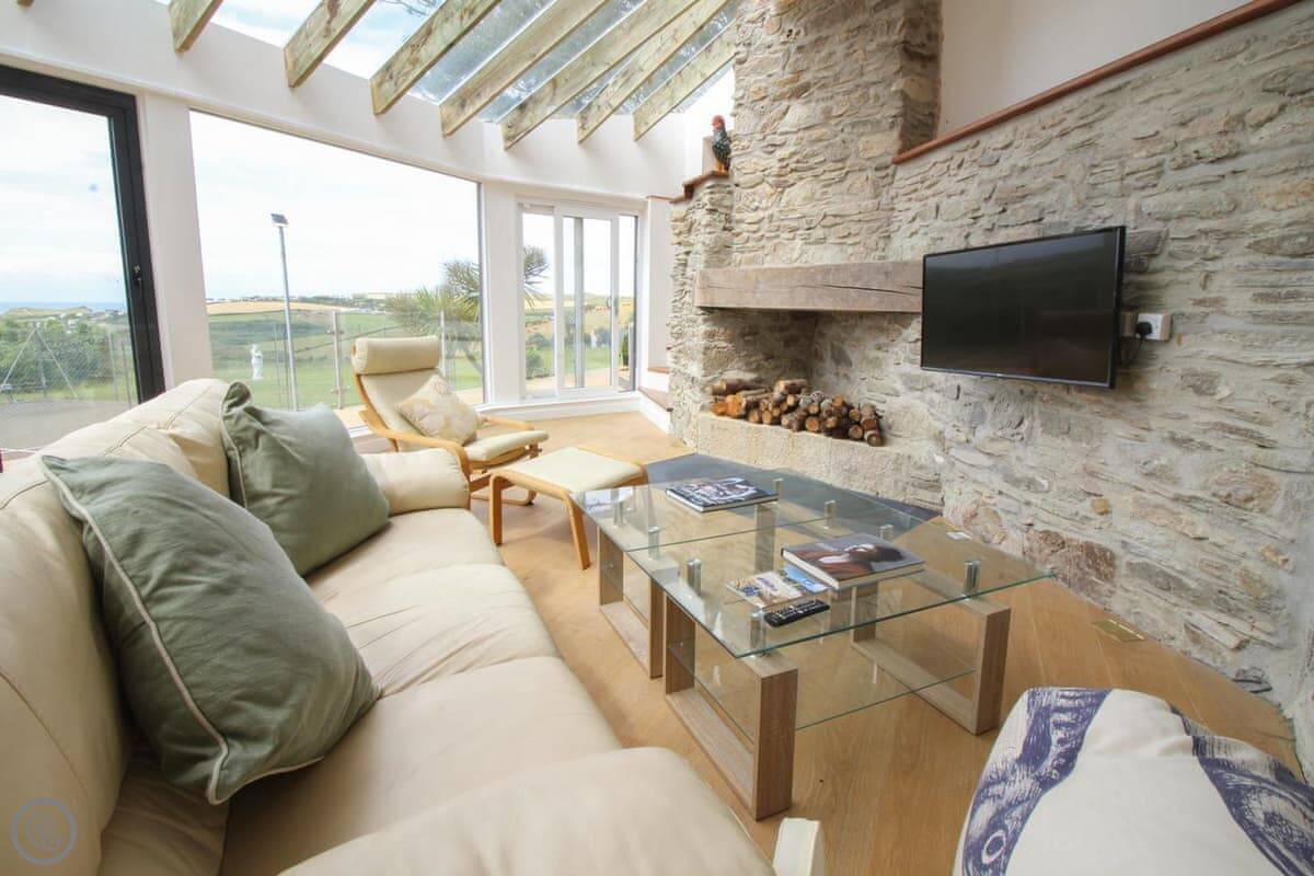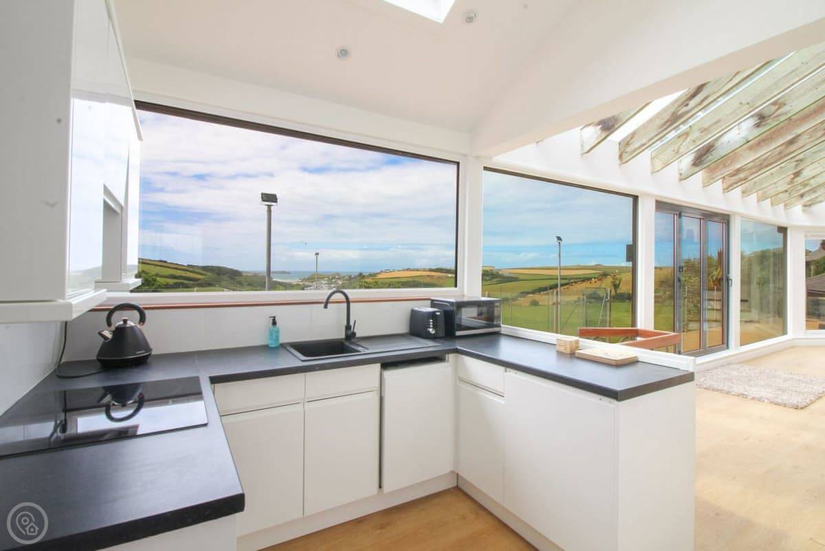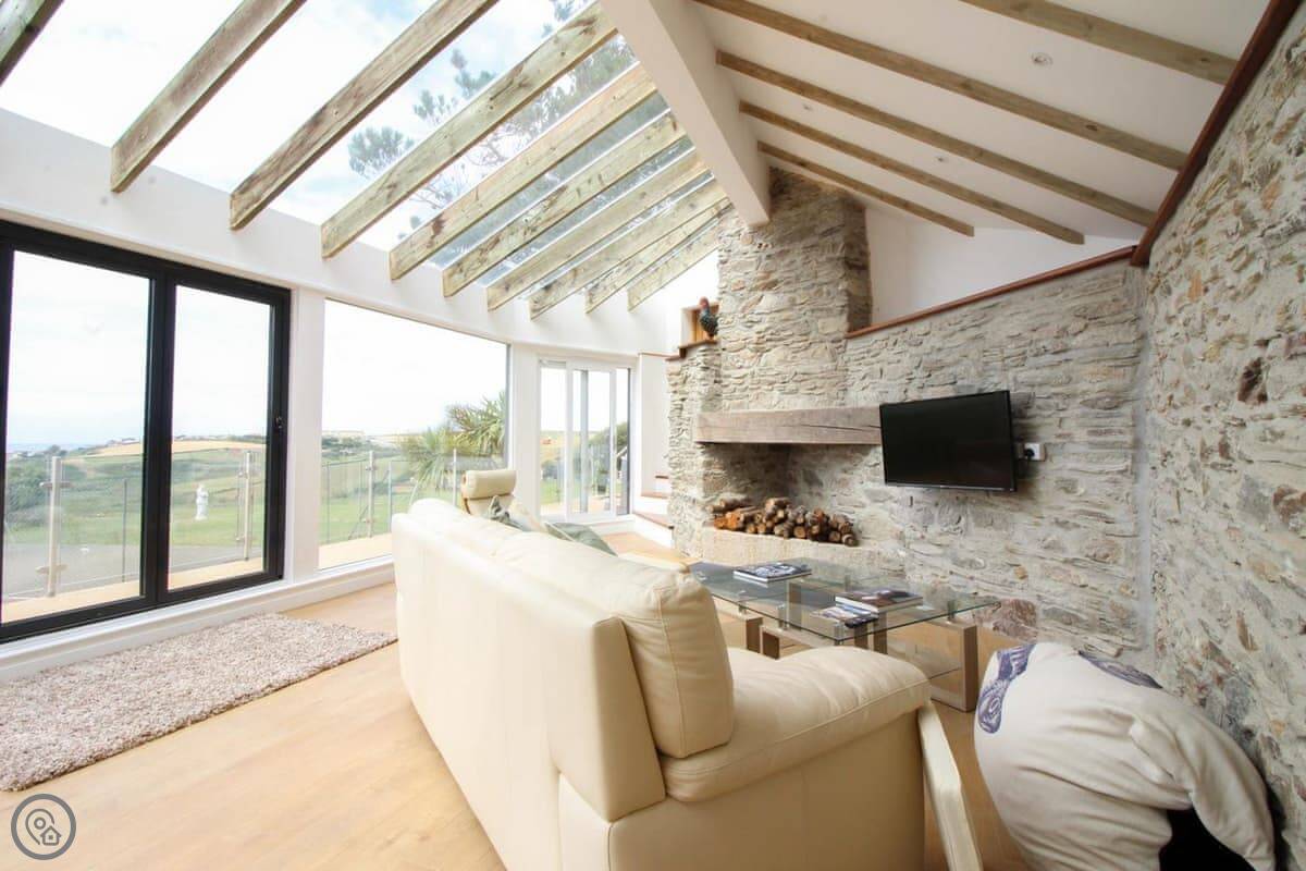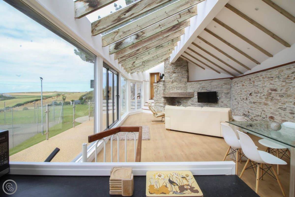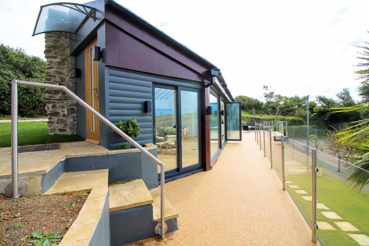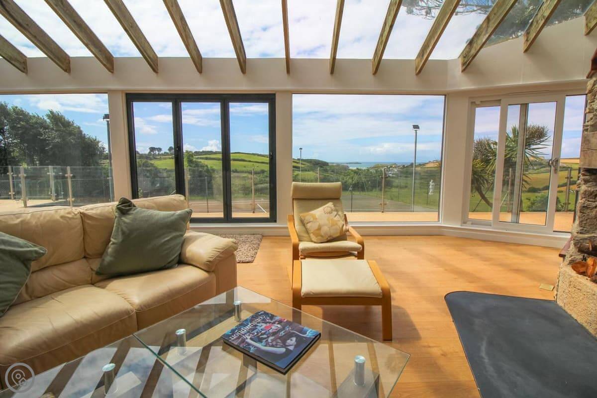 Penrose Lodge is near Newquay, about two miles from Porth beach. It's a modern lodge, stands on its own. The main thing is the view. You get a full-length balcony at the front, all glass, so you just look straight out over the countryside to the sea. You can sit out there all day if you want.