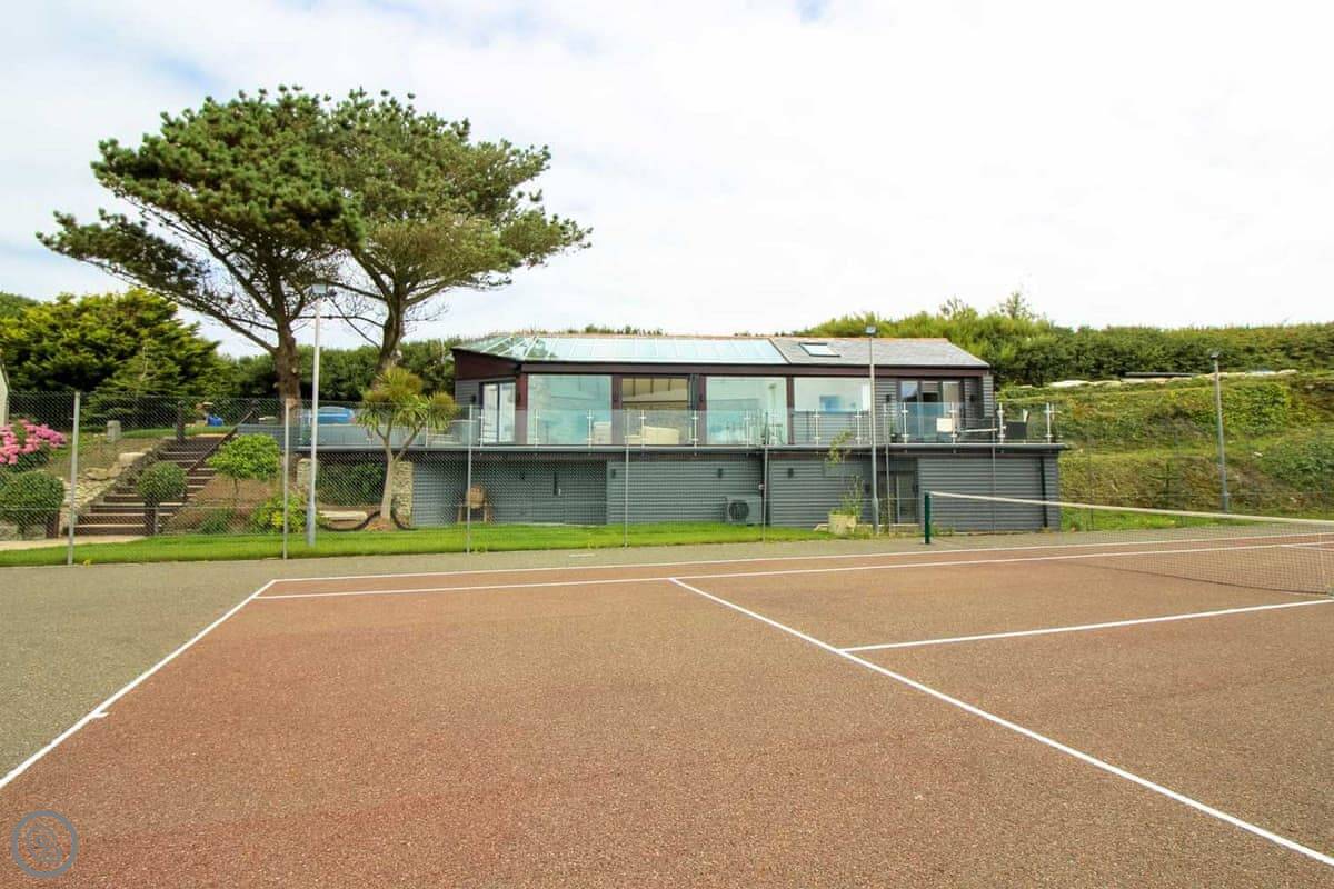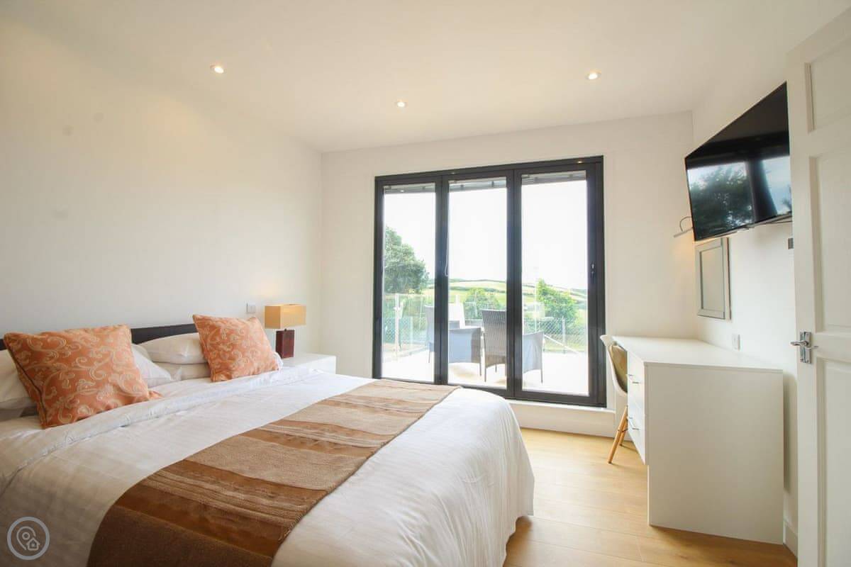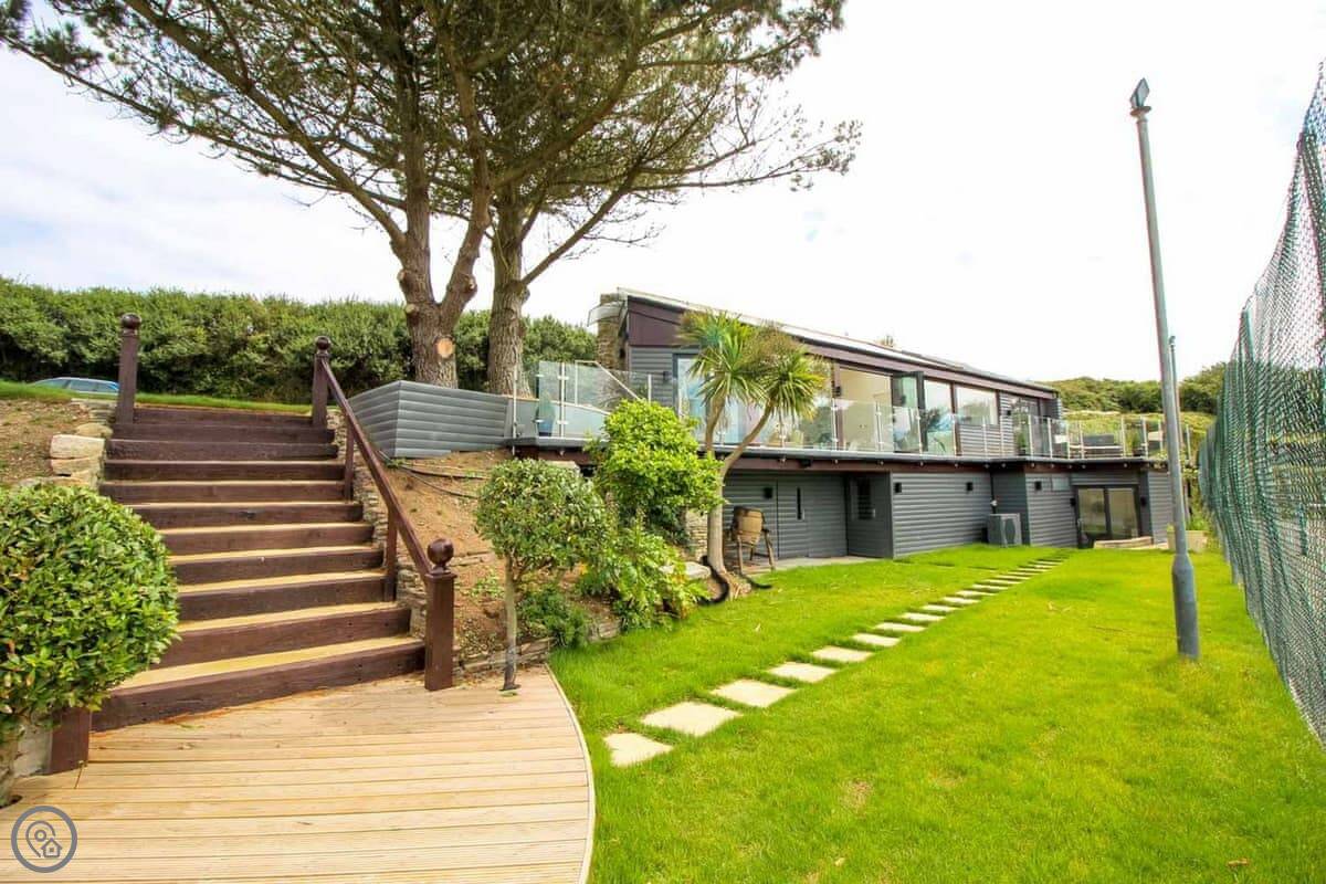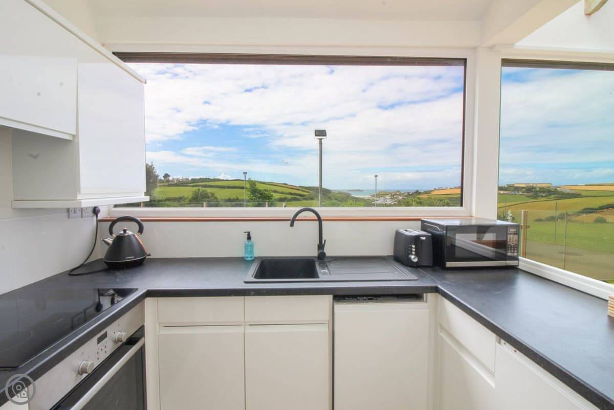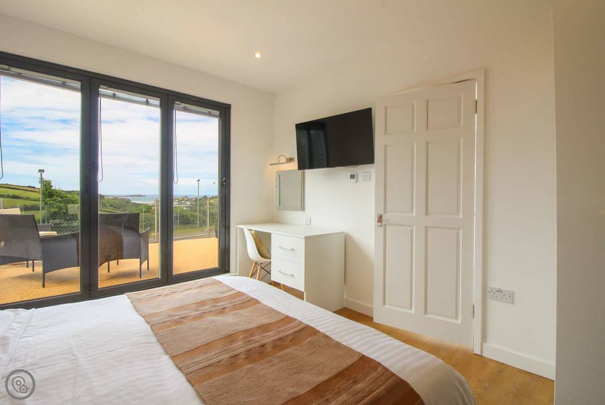 Penrose Lodge is near Newquay, about two miles from Porth beach. It's a modern lodge, stands on its own. The main thing is the view. You get a full-length balcony at the front, all glass, so you just look straight out over the countryside to the sea. You can sit out there all day if you want.