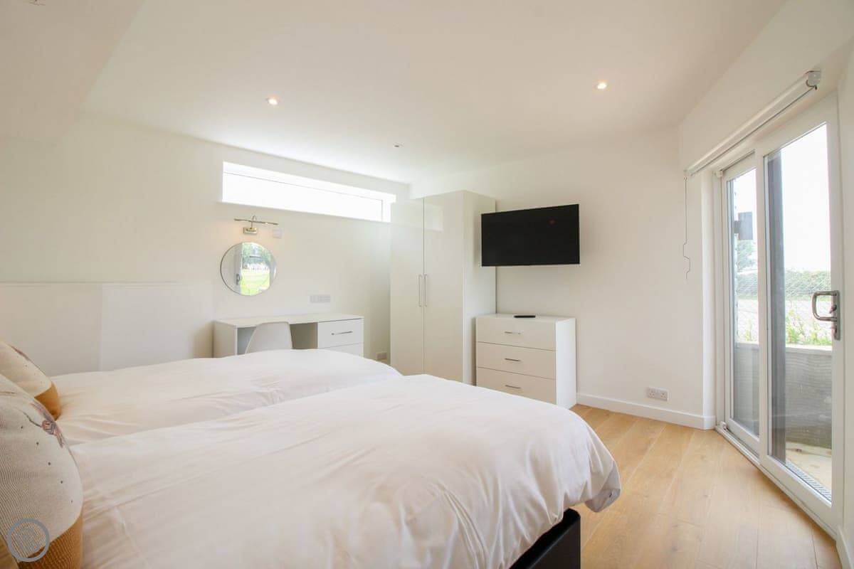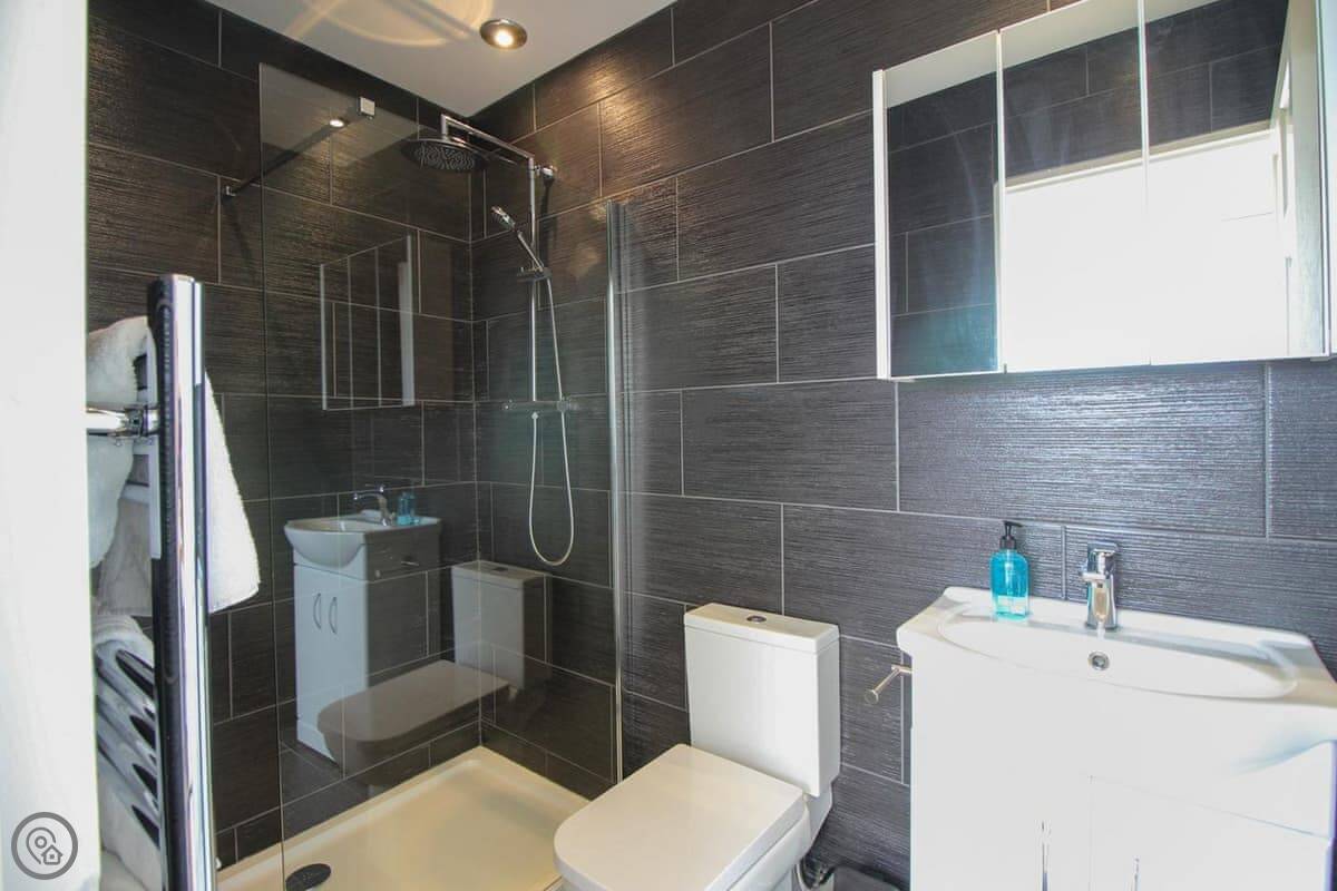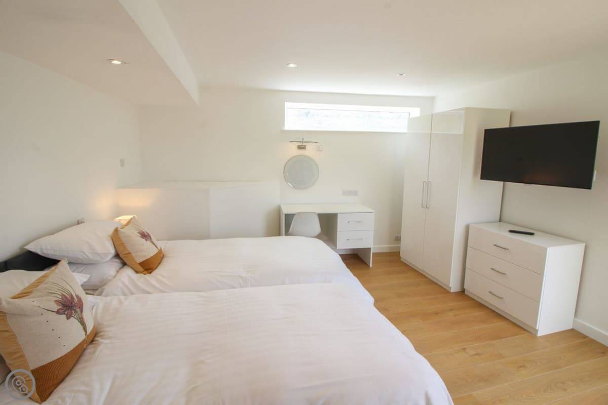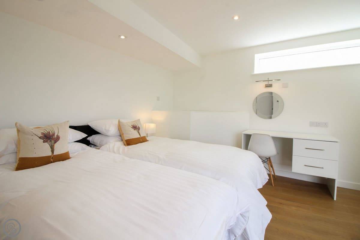 It sleeps four. Two bedrooms, both doubles, and two bathrooms. One bedroom is on the ground floor, the other is upstairs. It’s got a 5 Star rating. Everything is in good condition, it’s well looked after.