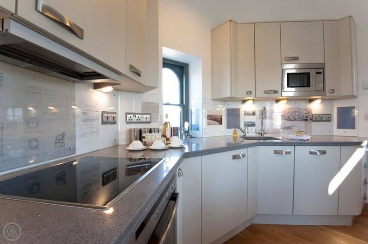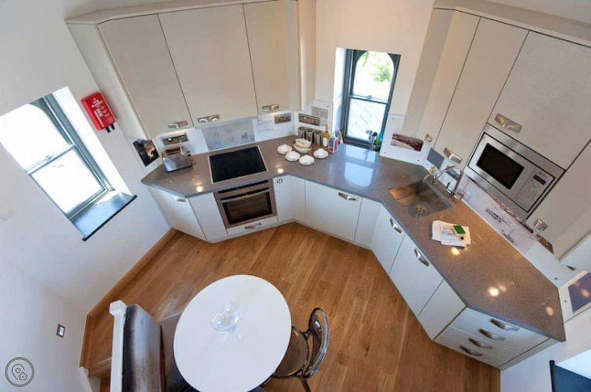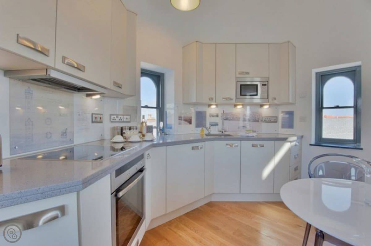 A private bedroom with en-suite is located on the ground floor, the first floor holds a living area that can also be used as a bedroom to accommodate up to four guests. The kitchen on the second floor is both functional and interesting at the same time. The history of The Observatory Tower is depicted through photographs, plans and original weather reports. The main living room on the third floor has large picture windows and a funky sofa designed to fit the space.