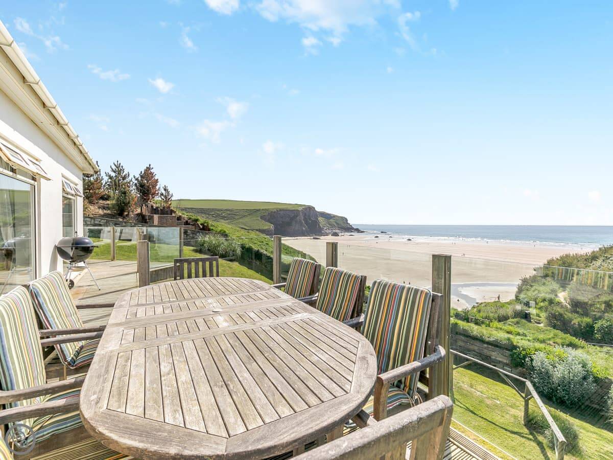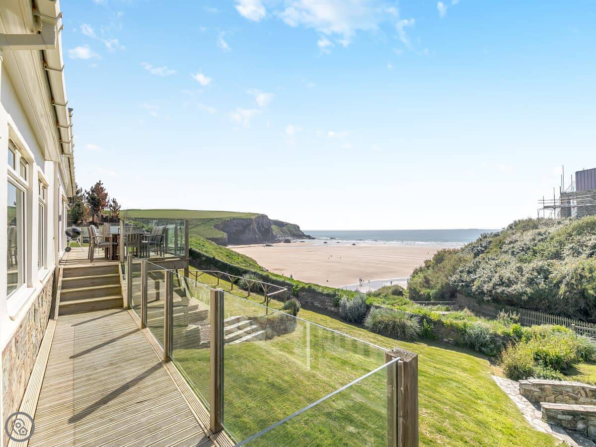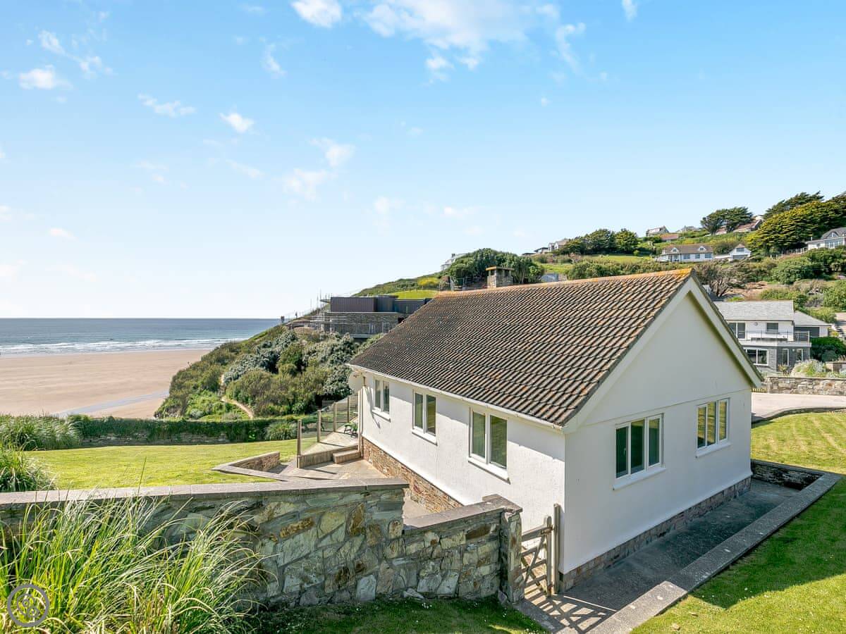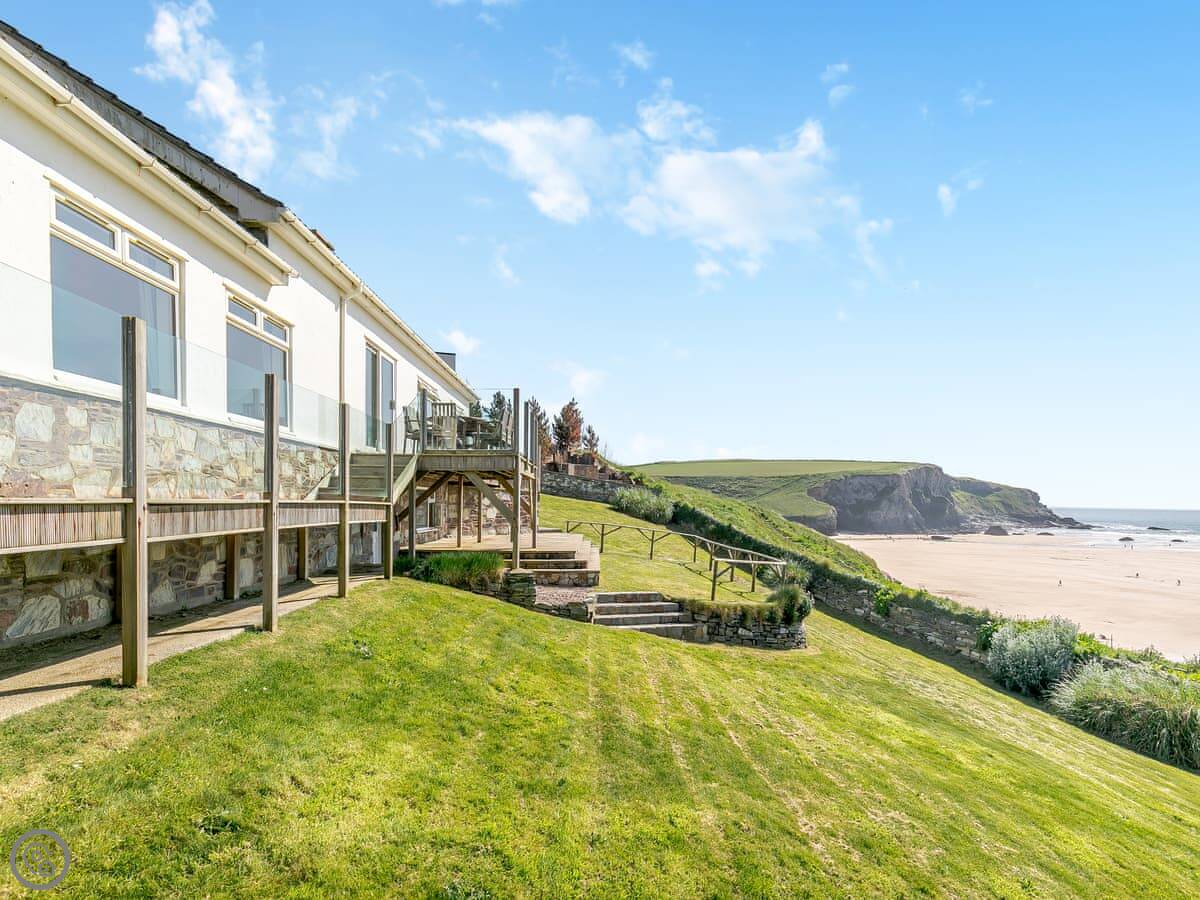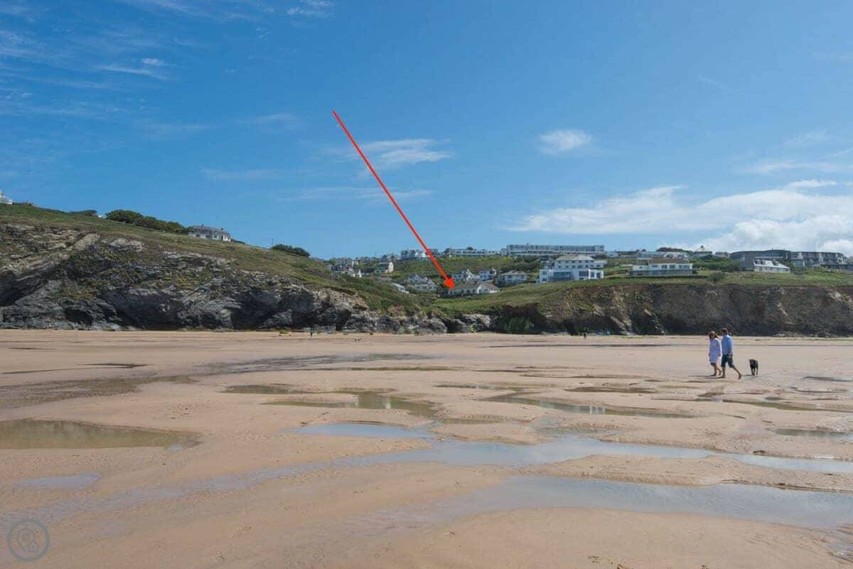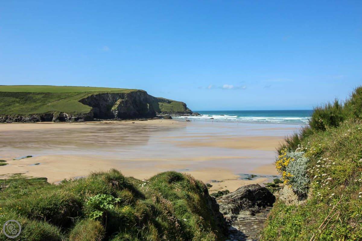 The beach is right there. You leave the garden, go down some steps, and you're on Mawgan Porth beach in less than a minute. It's a west-facing beach with cliffs, so it can be sheltered. The surf can get big. There's a stream at one end with rock pools and caves to explore. Dogs are allowed on the beach all year.