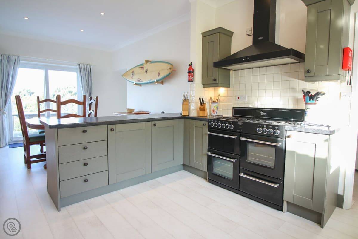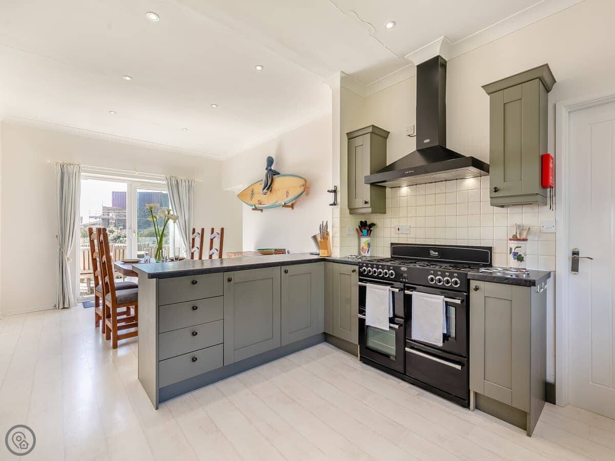 For facilities, it's all there. Washing machine, dishwasher, wood burner, BBQ, parking, Wi-Fi. Bedding and towels are included. There's a cot and a highchair. We've put in an electric vehicle charger. You can bring up to three dogs.