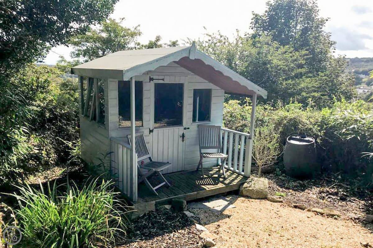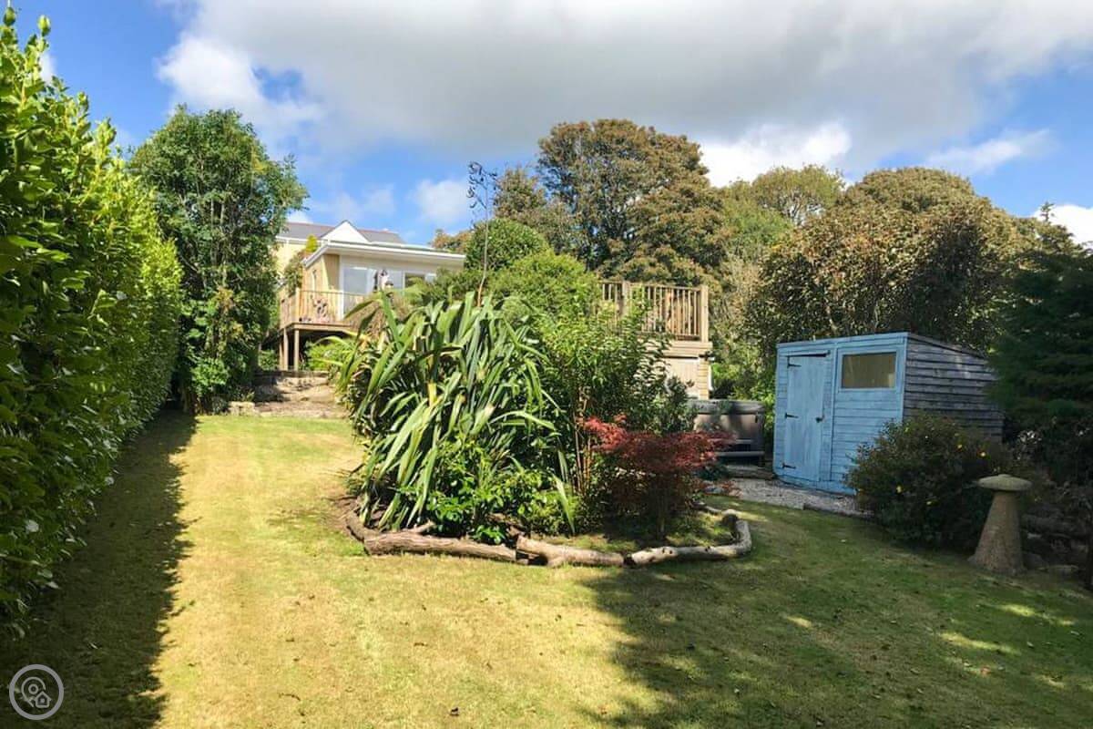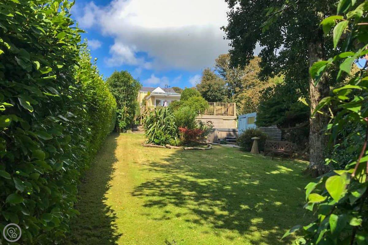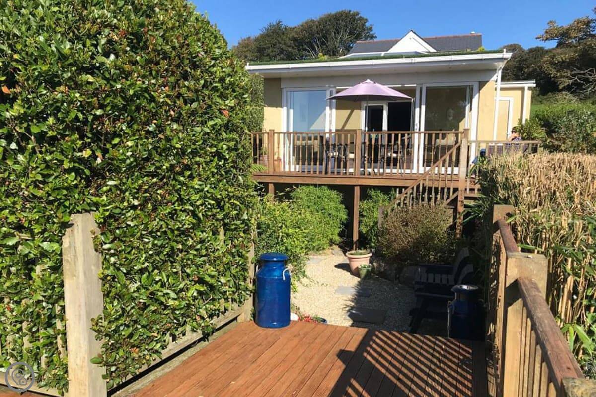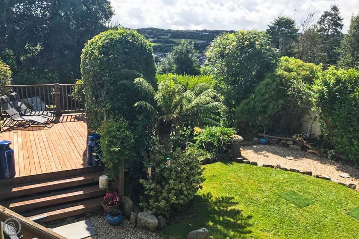 Nelsons Retreat is tucked away down a quiet lane. It is south facing with fantastic rural views across the valley and an immaculate garden which has mature trees and shrubs and paths that wind through them, decked areas, sun loungers and seating at sporadic points where you can bask in the sun or relax in the dappled shade. The house itself has a decked balcony outside the sunroom with a canopy glass ceiling and sliding doors which open out onto the balcony. Inside is a large open plan living area with electric reclining chairs large Freeview TV and a galley kitchen. There are two bedrooms, and the master has fantastic views and French windows that open onto another large balcony. The second bedroom has a zip and link bed which can be made up into a double or a twin for total flexibility. Nelsons Retreat is dog friendly, and you are welcome to bring your well-behaved family pet who may well enjoy the 10-minute walk from the door up to Carn Marth.