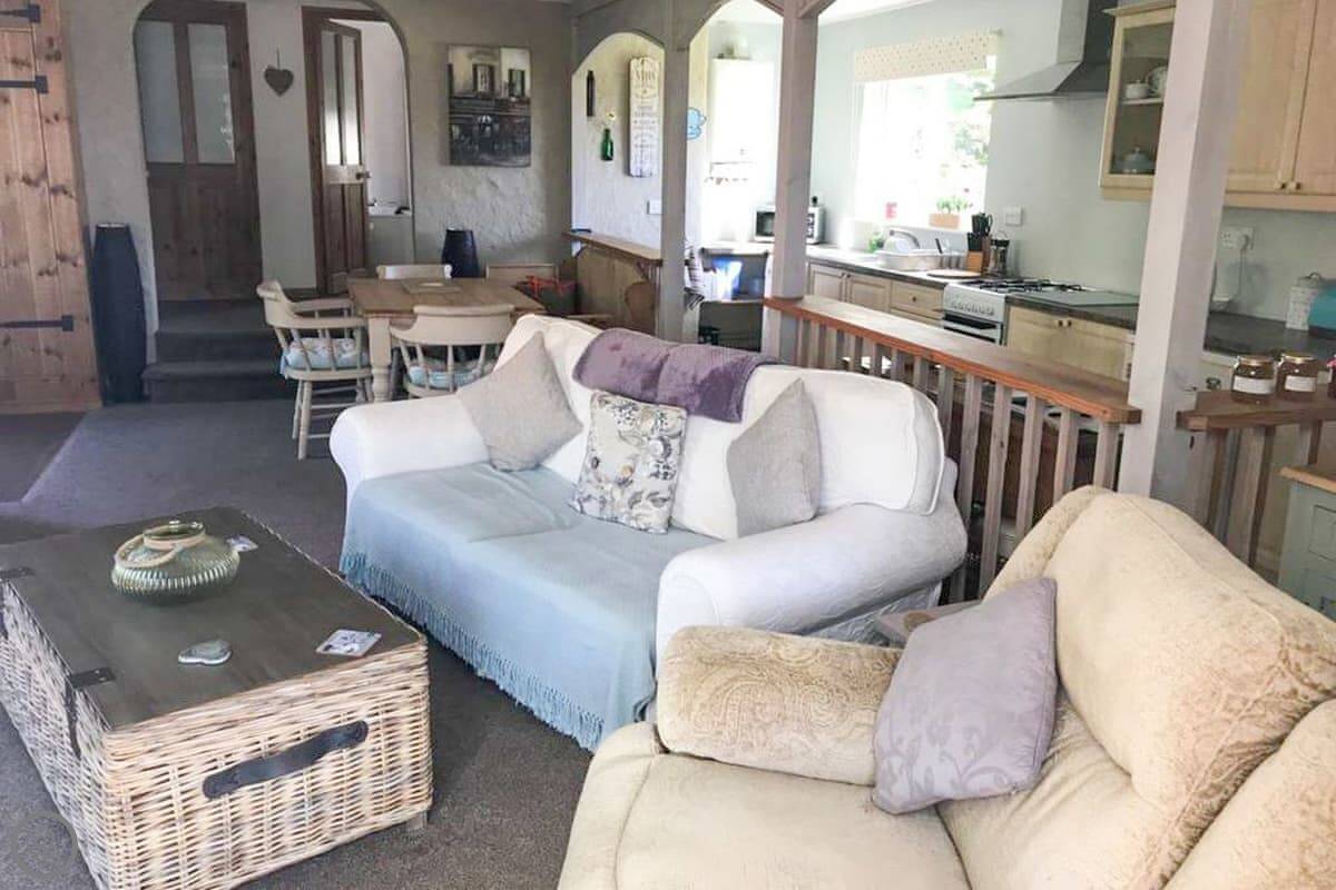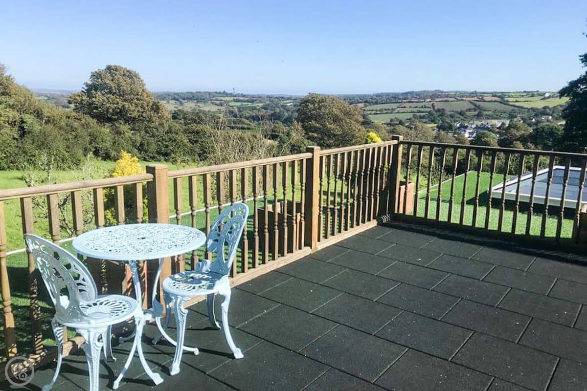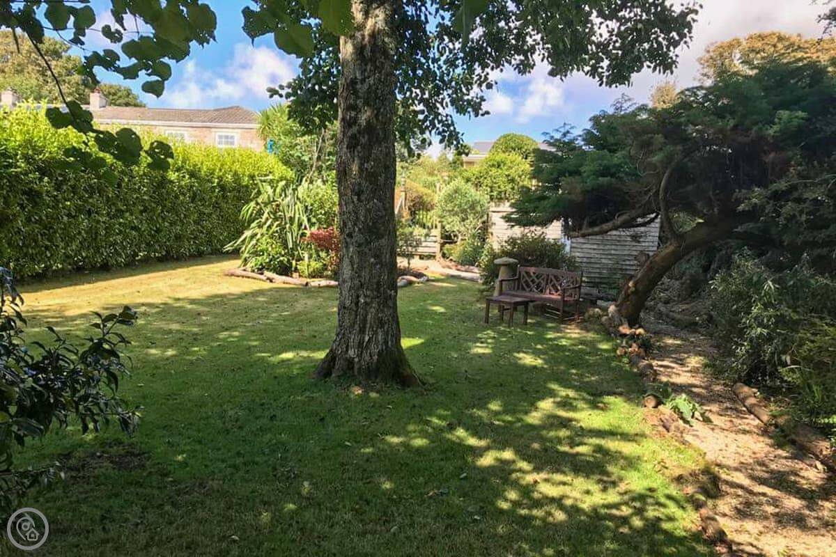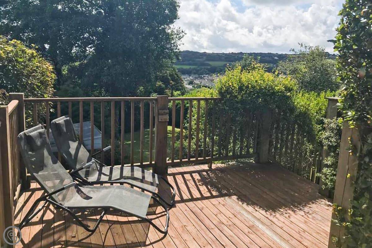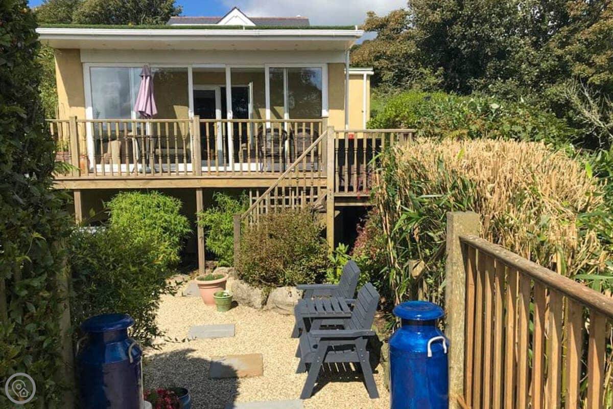 Nelsons Retreat is tucked away down a quiet lane. It is south facing with fantastic rural views across the valley and an immaculate garden which has mature trees and shrubs and paths that wind through them, decked areas, sun loungers and seating at sporadic points where you can bask in the sun or relax in the dappled shade. The house itself has a decked balcony outside the sunroom with a canopy glass ceiling and sliding doors which open out onto the balcony. Inside is a large open plan living area with electric reclining chairs large Freeview TV and a galley kitchen. There are two bedrooms, and the master has fantastic views and French windows that open onto another large balcony. The second bedroom has a zip and link bed which can be made up into a double or a twin for total flexibility. Nelsons Retreat is dog friendly, and you are welcome to bring your well-behaved family pet who may well enjoy the 10-minute walk from the door up to Carn Marth.