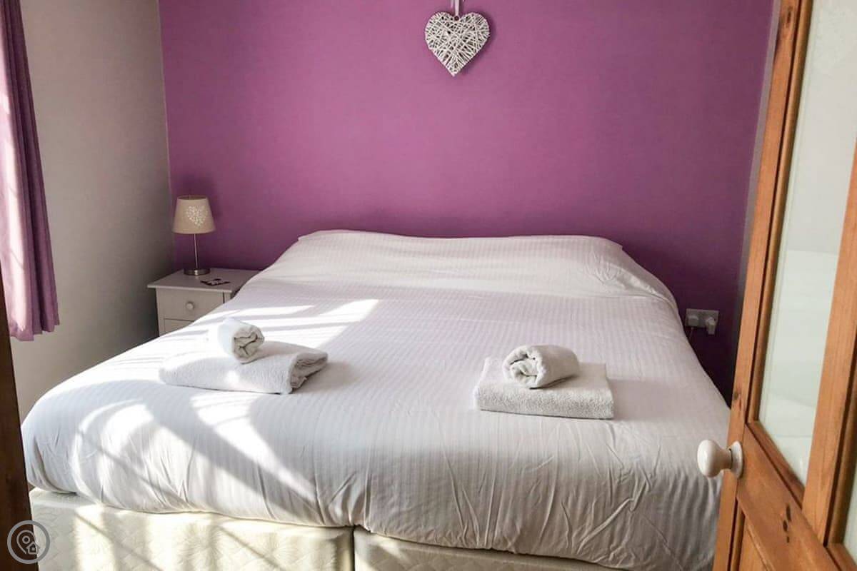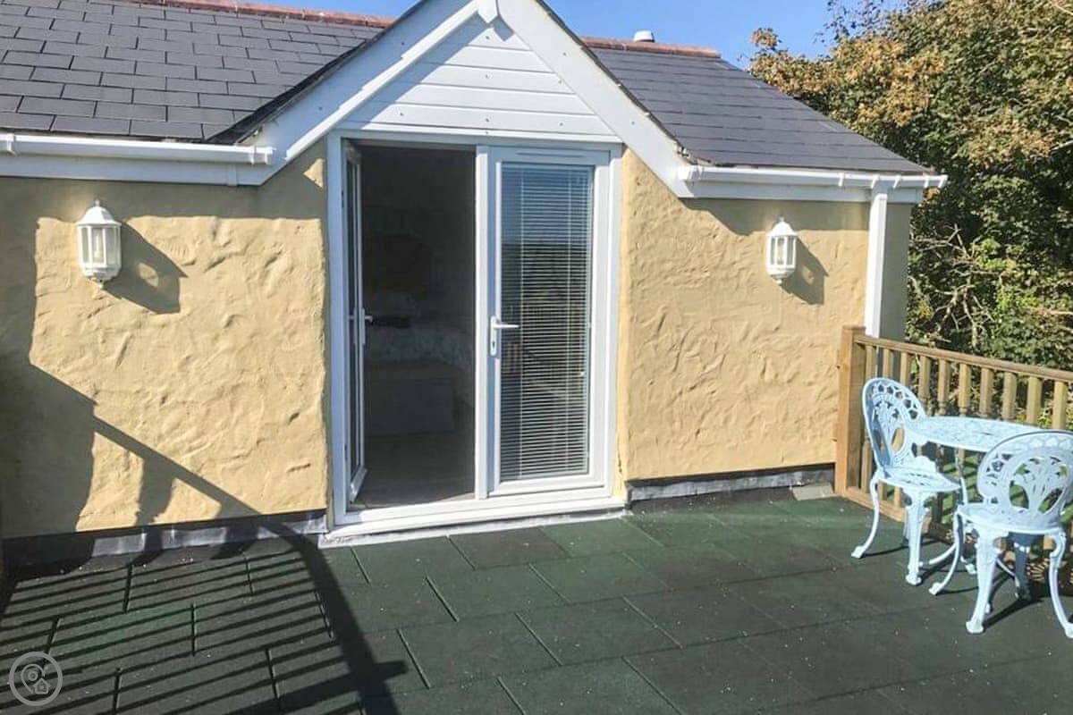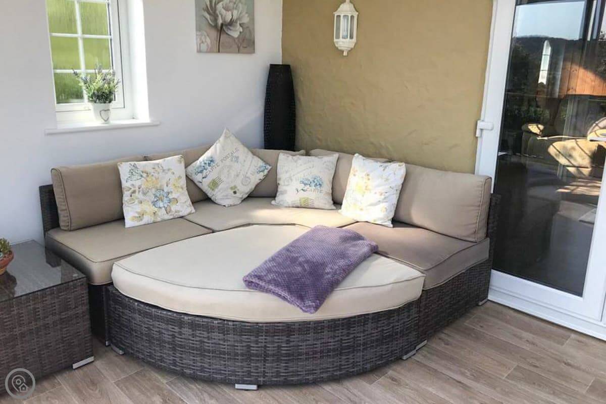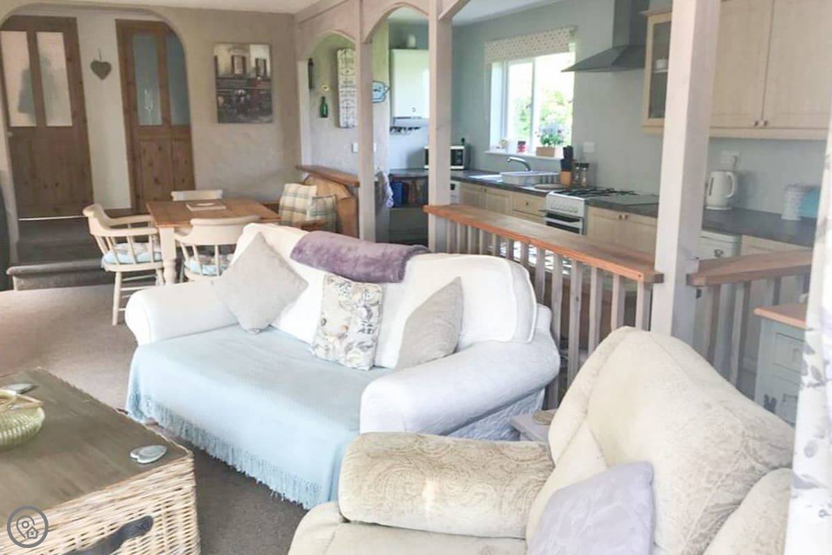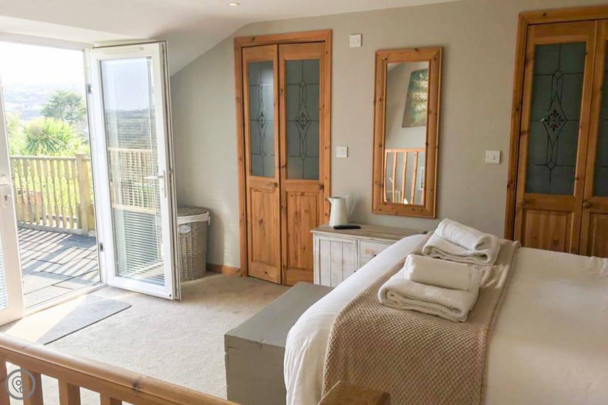 Nelsons Retreat is tucked away down a quiet lane. It is south facing with fantastic rural views across the valley and an immaculate garden which has mature trees and shrubs and paths that wind through them, decked areas, sun loungers and seating at sporadic points where you can bask in the sun or relax in the dappled shade. The house itself has a decked balcony outside the sunroom with a canopy glass ceiling and sliding doors which open out onto the balcony. Inside is a large open plan living area with electric reclining chairs large Freeview TV and a galley kitchen. There are two bedrooms, and the master has fantastic views and French windows that open onto another large balcony. The second bedroom has a zip and link bed which can be made up into a double or a twin for total flexibility. Nelsons Retreat is dog friendly, and you are welcome to bring your well-behaved family pet who may well enjoy the 10-minute walk from the door up to Carn Marth.