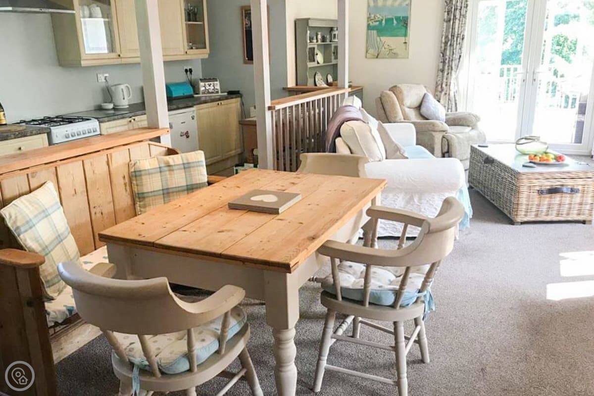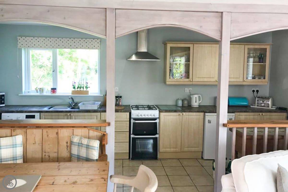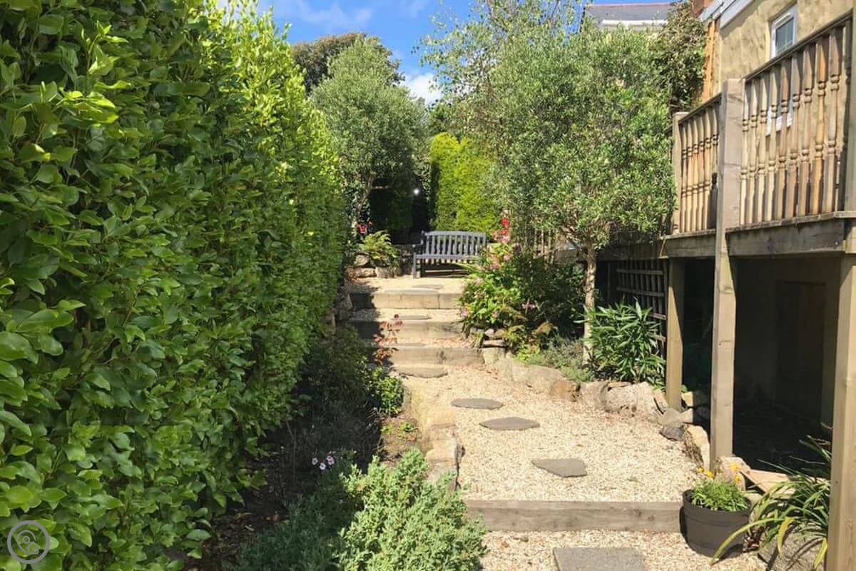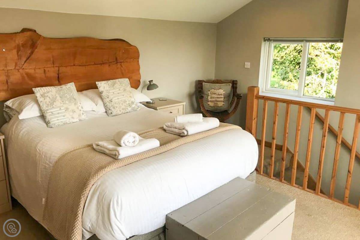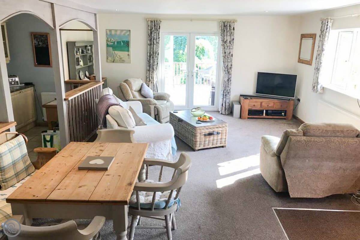 Nelsons Retreat is tucked away down a quiet lane. It is south facing with fantastic rural views across the valley and an immaculate garden which has mature trees and shrubs and paths that wind through them, decked areas, sun loungers and seating at sporadic points where you can bask in the sun or relax in the dappled shade. The house itself has a decked balcony outside the sunroom with a canopy glass ceiling and sliding doors which open out onto the balcony. Inside is a large open plan living area with electric reclining chairs large Freeview TV and a galley kitchen. There are two bedrooms, and the master has fantastic views and French windows that open onto another large balcony. The second bedroom has a zip and link bed which can be made up into a double or a twin for total flexibility. Nelsons Retreat is dog friendly, and you are welcome to bring your well-behaved family pet who may well enjoy the 10-minute walk from the door up to Carn Marth.