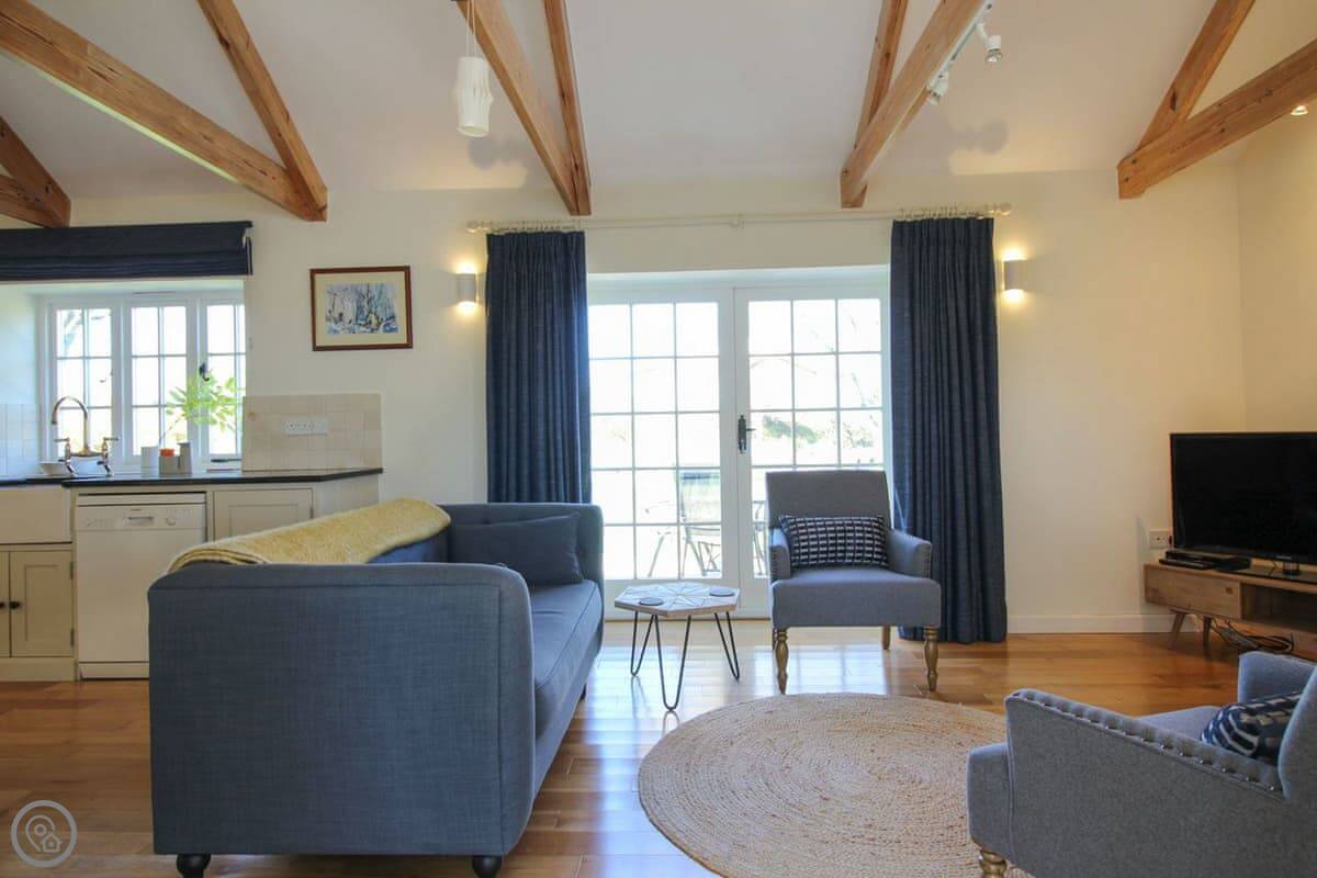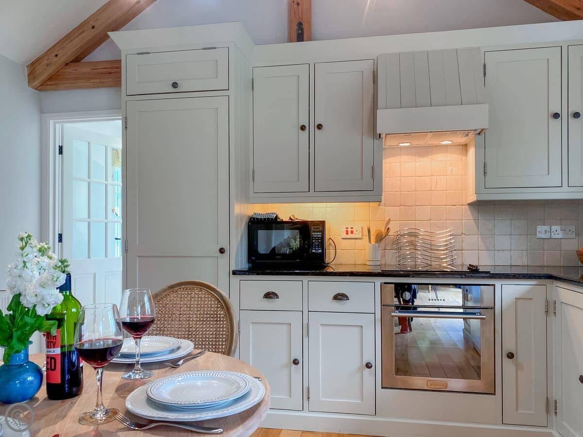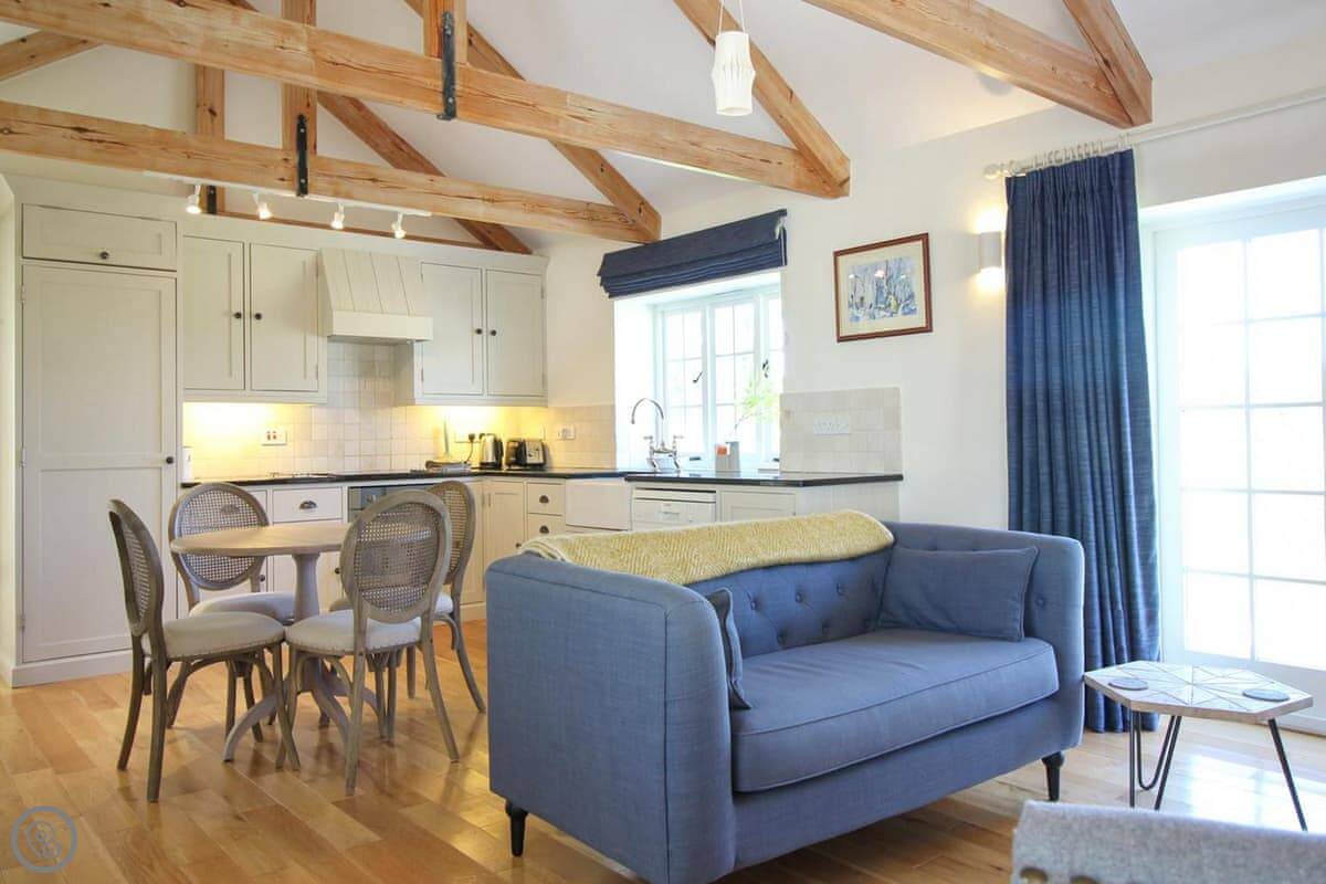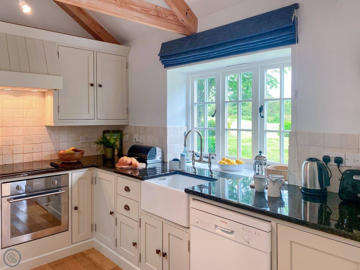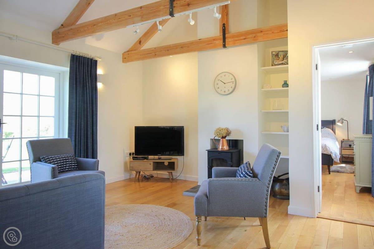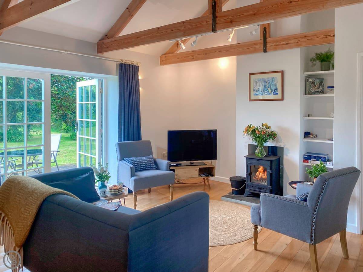 The living space is all open plan, with doors to the garden. There's a wood burner for cooler evenings. The kitchen has what you need. There's a washing machine, dishwasher, Wi-Fi. Bedding and towels are included.