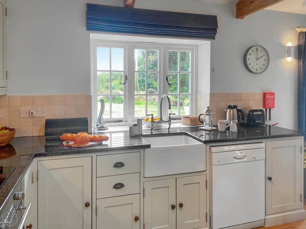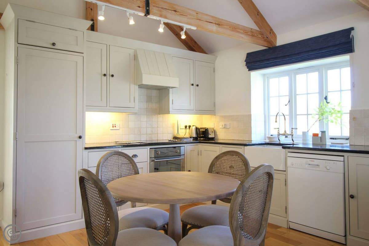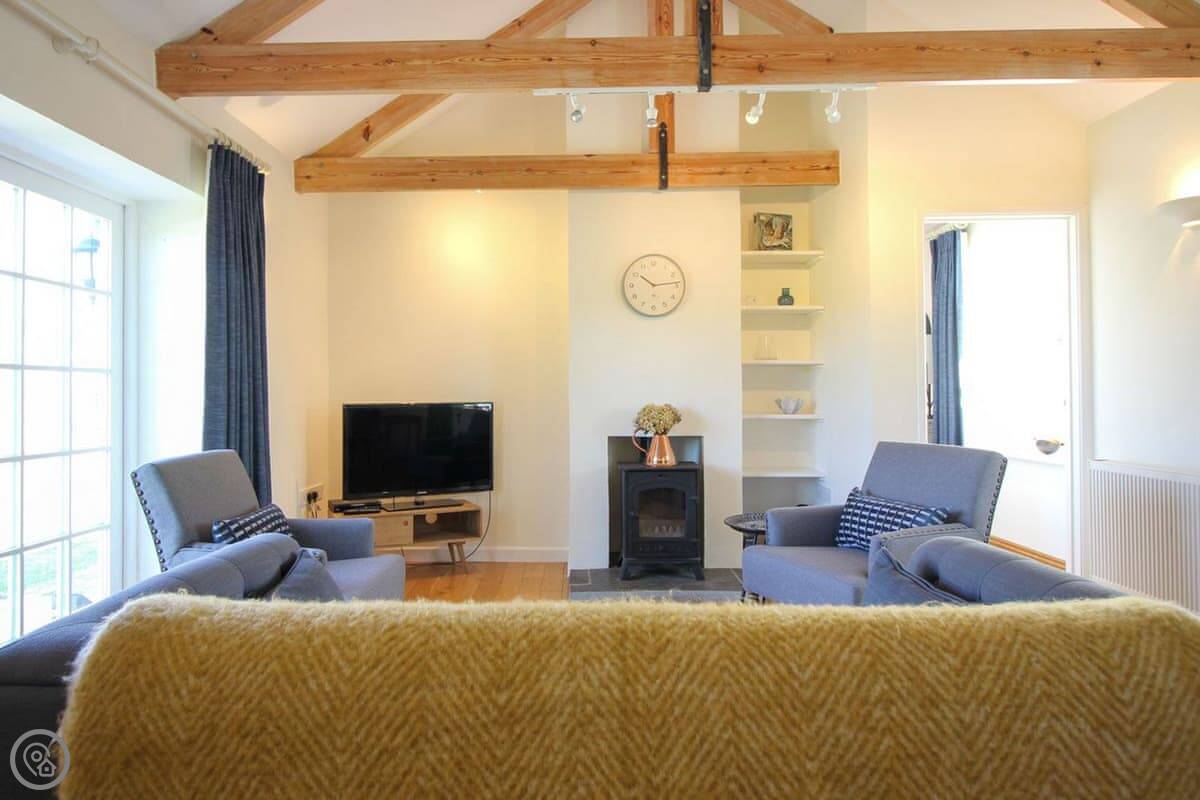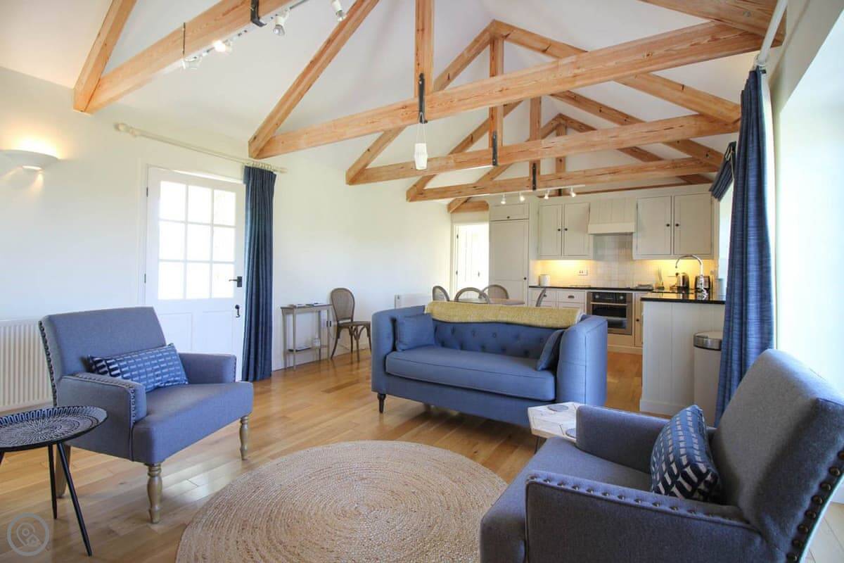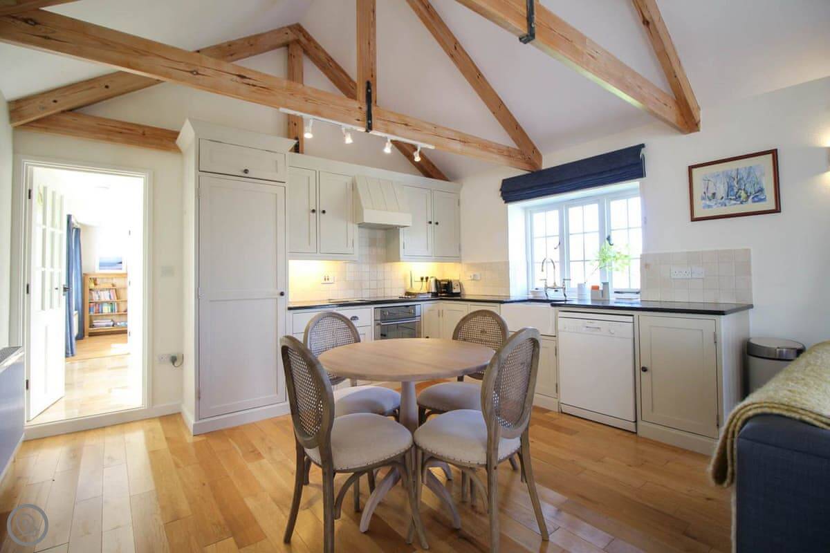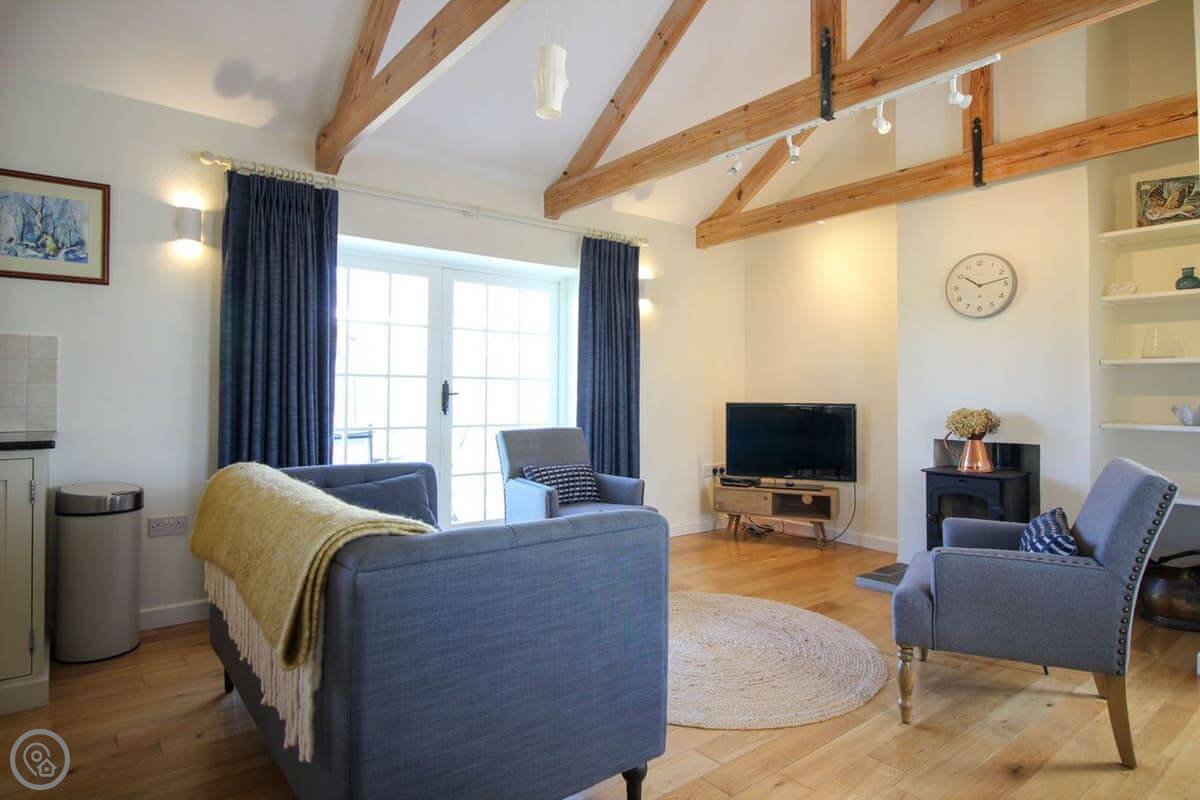 The living space is all open plan, with doors to the garden. There's a wood burner for cooler evenings. The kitchen has what you need. There's a washing machine, dishwasher, Wi-Fi. Bedding and towels are included.