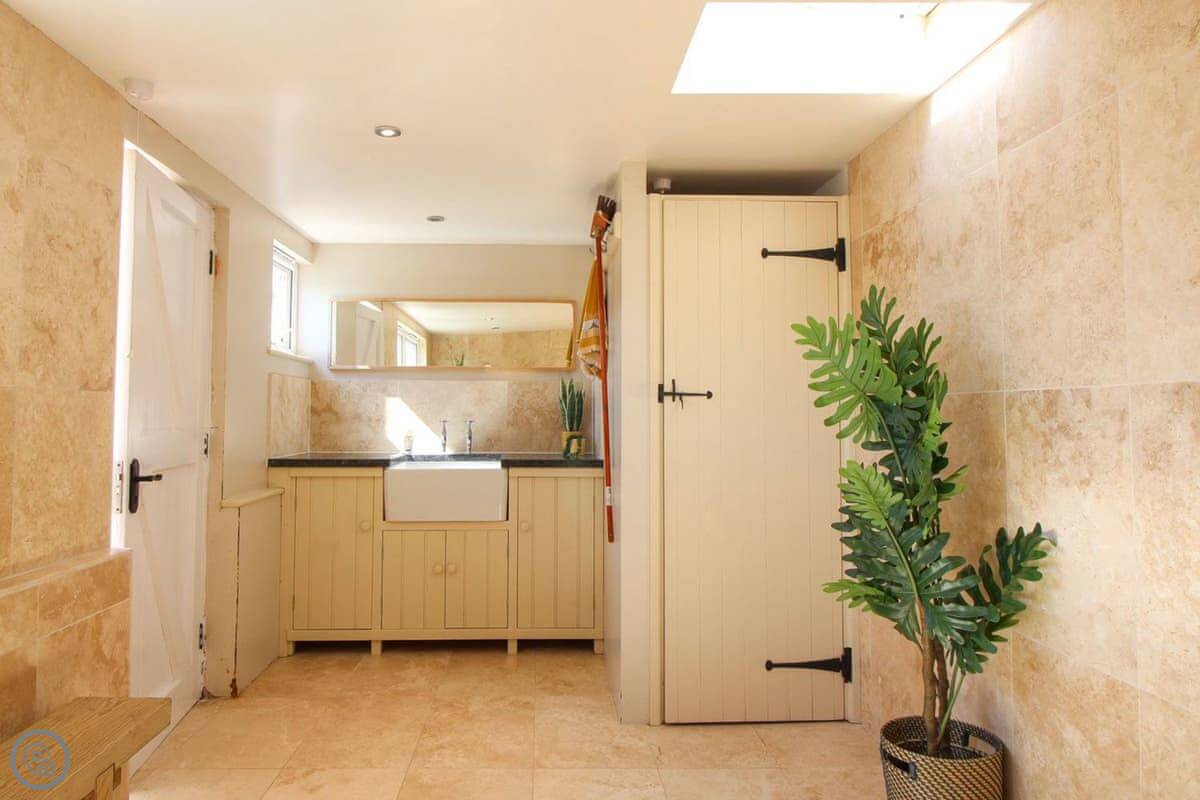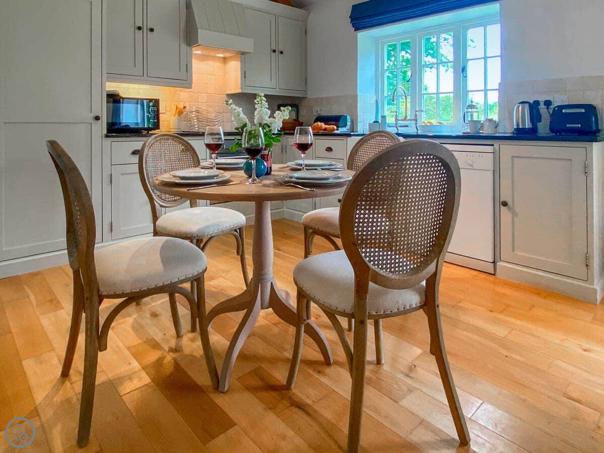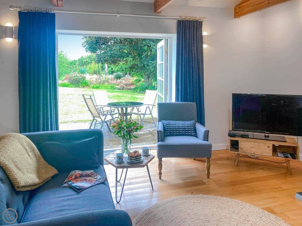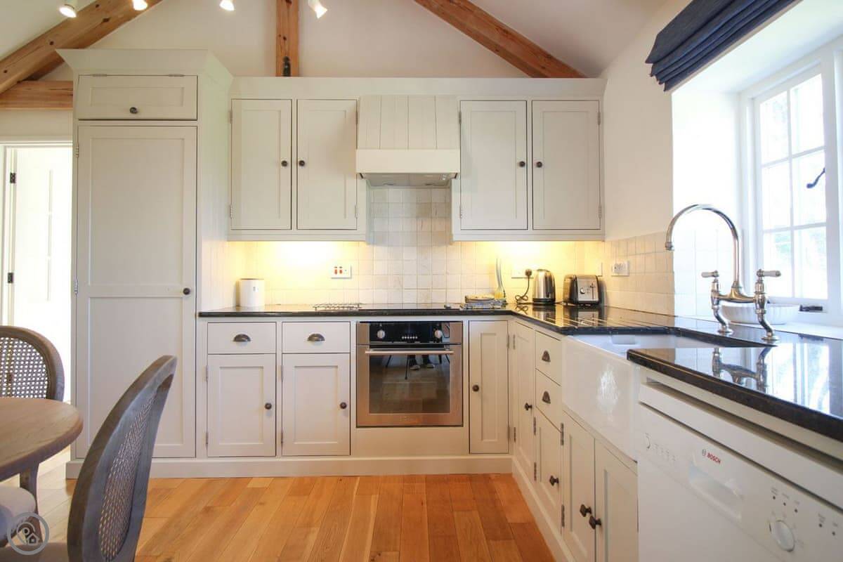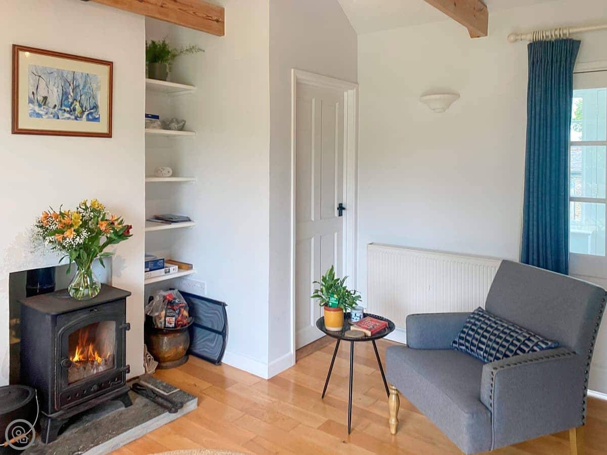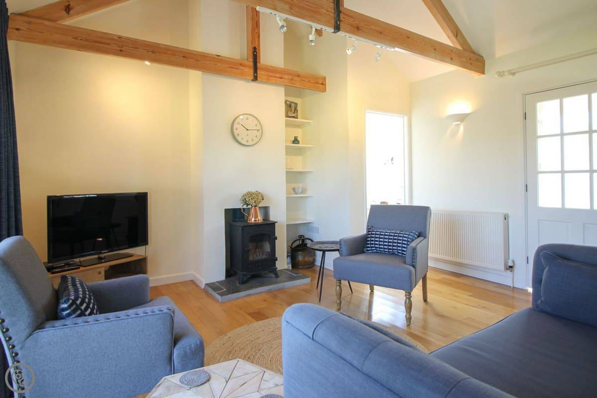 The living space is all open plan, with doors to the garden. There's a wood burner for cooler evenings. The kitchen has what you need. There's a washing machine, dishwasher, Wi-Fi. Bedding and towels are included.