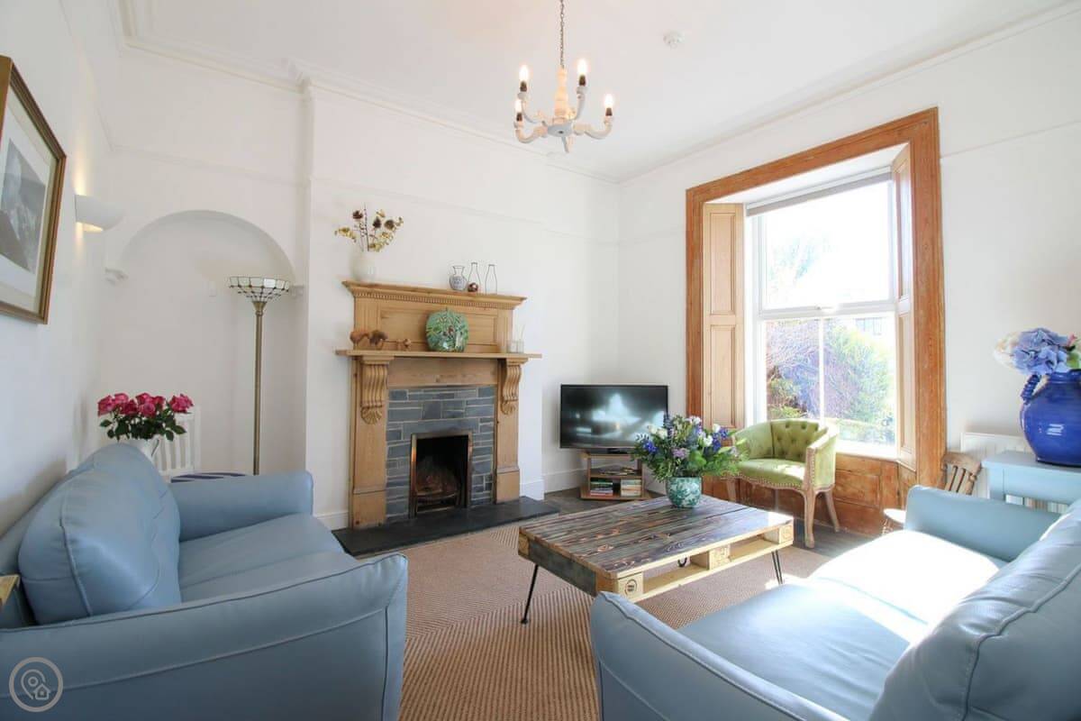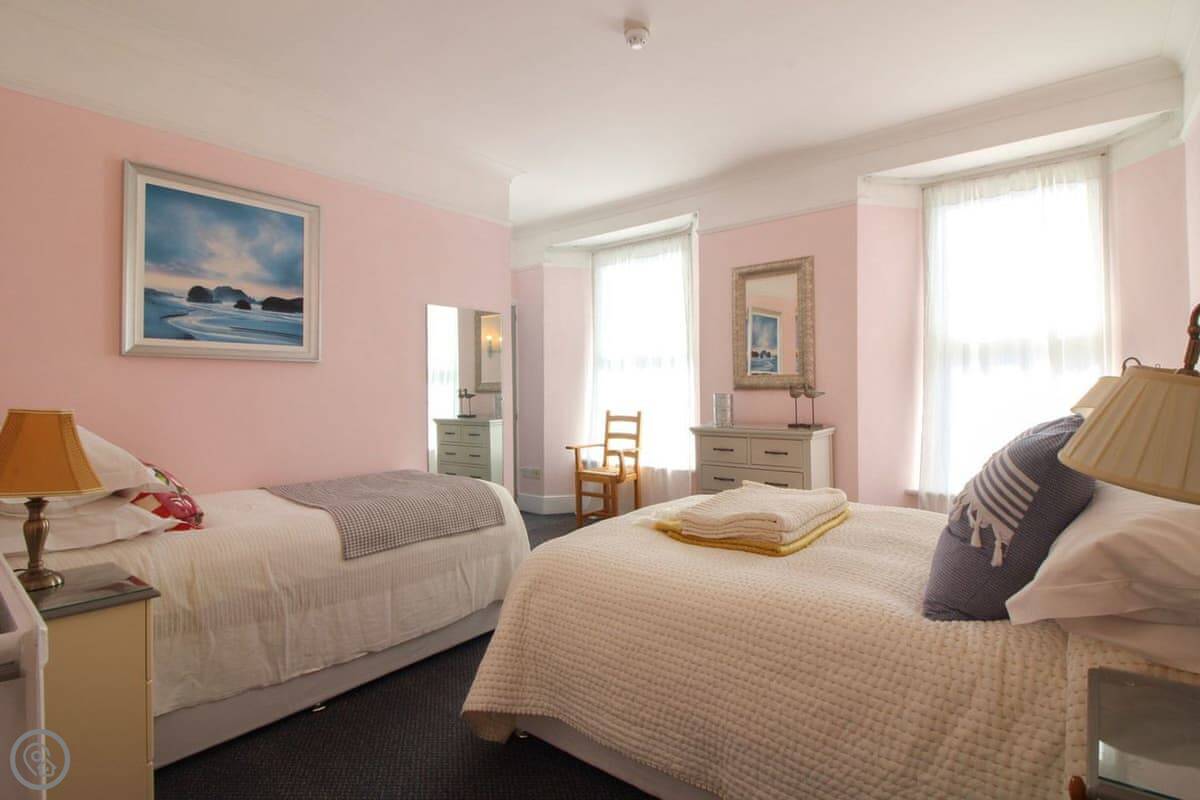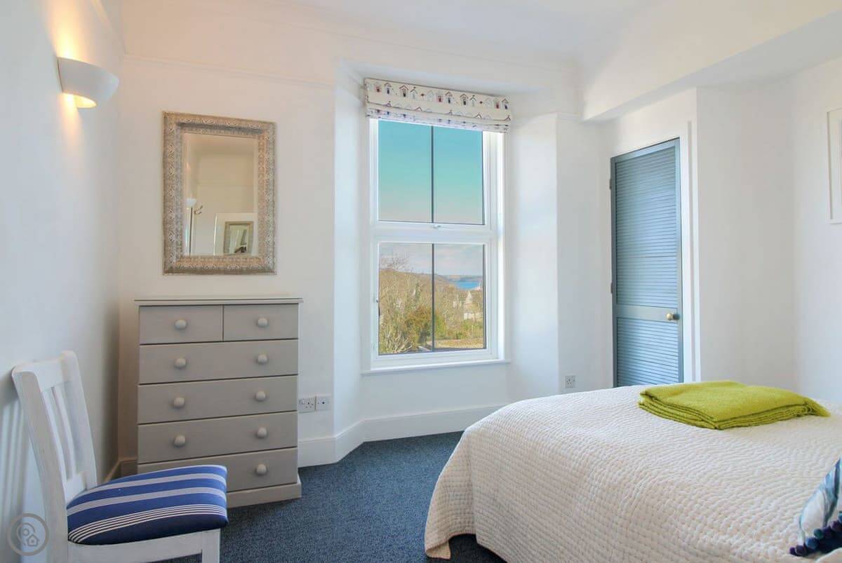 Melvill House is a bright, Victorian house that has been sympathetically converted to a self-catering holiday property. Six bedrooms sleeping up to thirteen people with various formats, all of which have en-suite facilities, great views from the bedrooms to the rear of the property down to Falmouth harbour and docks and over to the Roseland Peninsula in the distance. On the ground floor are two reception rooms so the guests’ age groups can be segregated if required, both with beautiful decor, a large dining room with bay window, and a very well-equipped kitchen with ample capacity to cook for larger family groups.