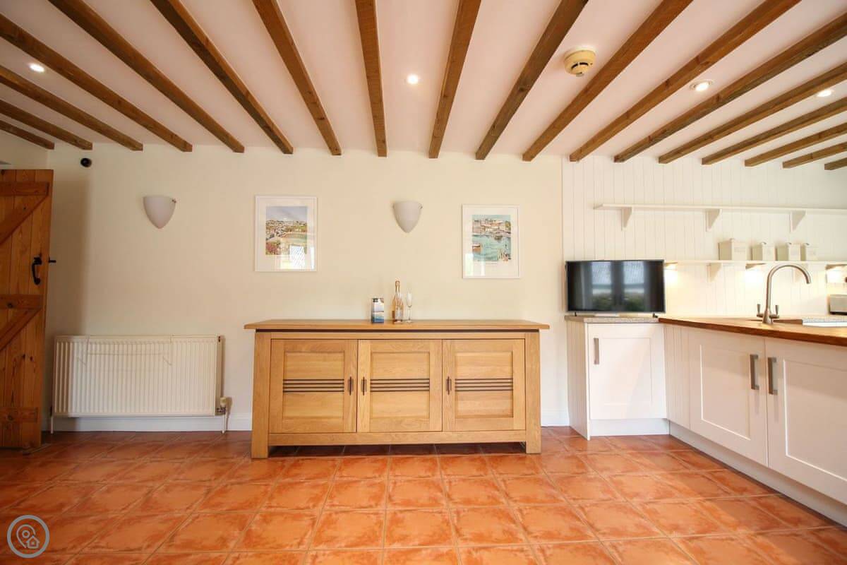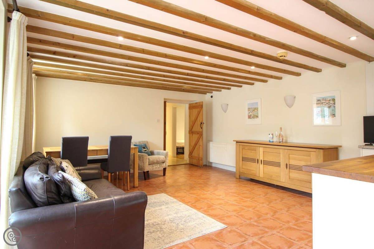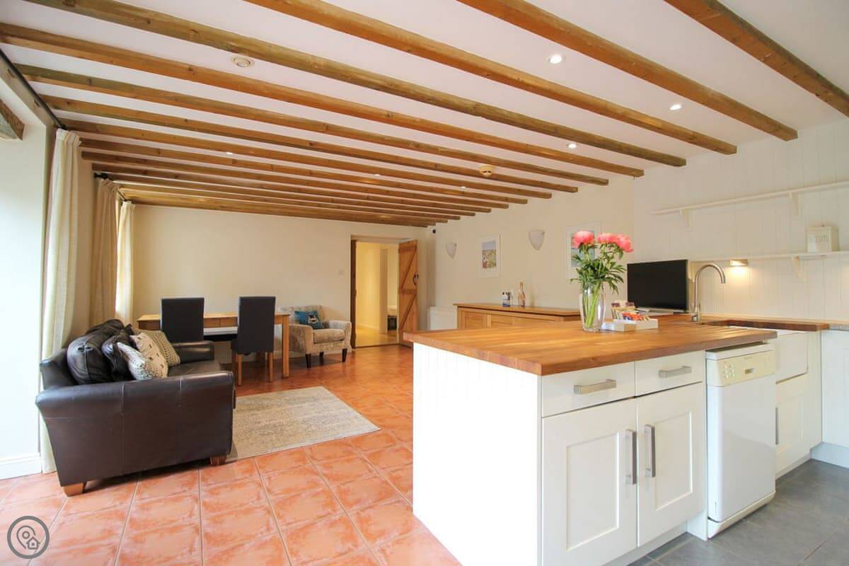 It's got a 4 Star rating. Sleeps five, three bedrooms, one bathroom. It's one double, one twin and a single. It's got that sort of cottage look, lots of beams and a tiled floor. The main room is open plan, so kitchen, dining and sitting area is all one space. The kitchen has a Rangemaster cooker which is good.