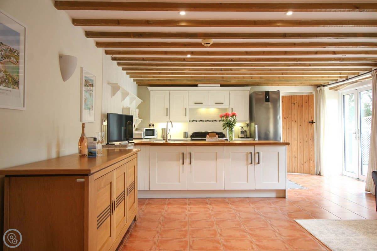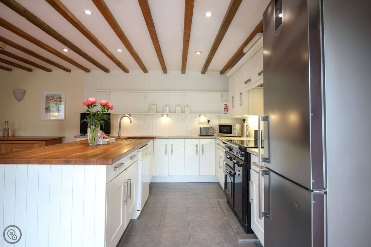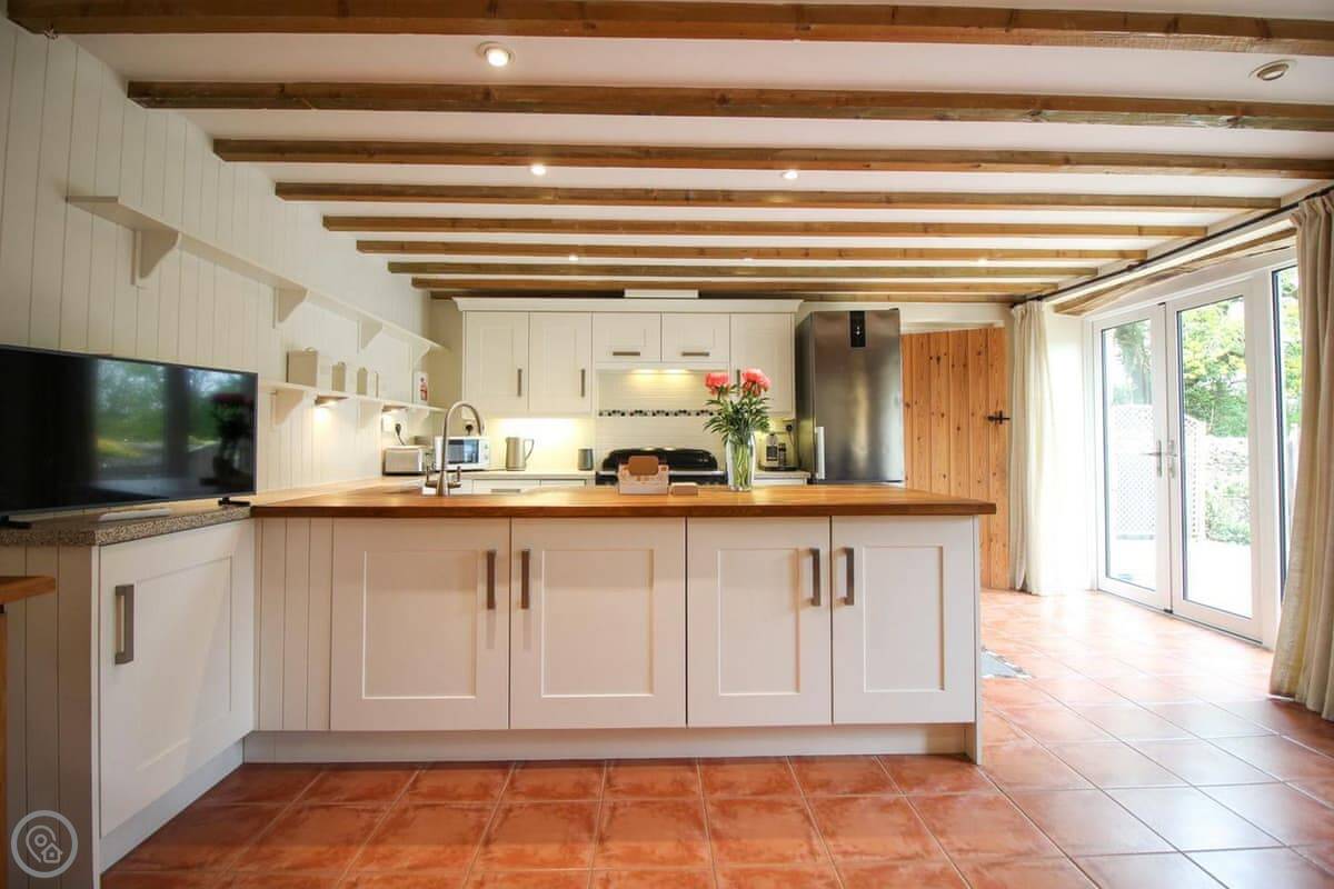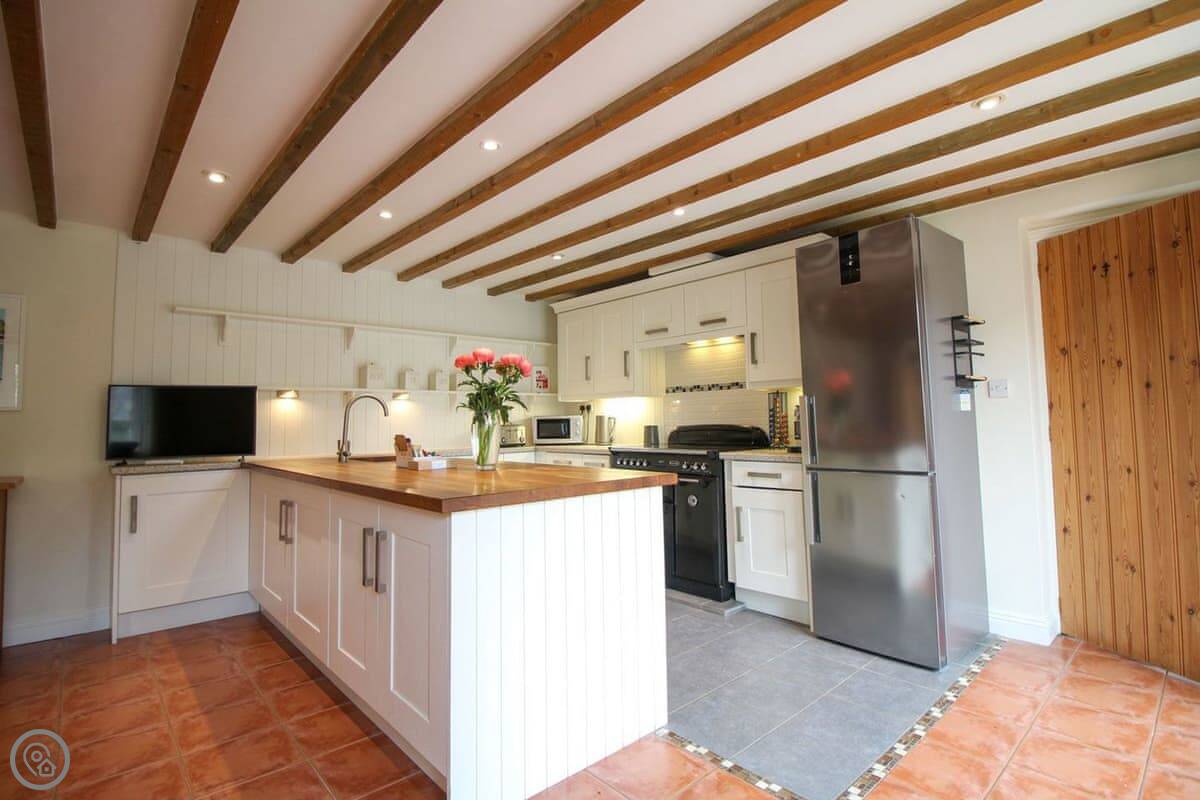 It's got a 4 Star rating. Sleeps five, three bedrooms, one bathroom. It's one double, one twin and a single. It's got that sort of cottage look, lots of beams and a tiled floor. The main room is open plan, so kitchen, dining and sitting area is all one space. The kitchen has a Rangemaster cooker which is good.