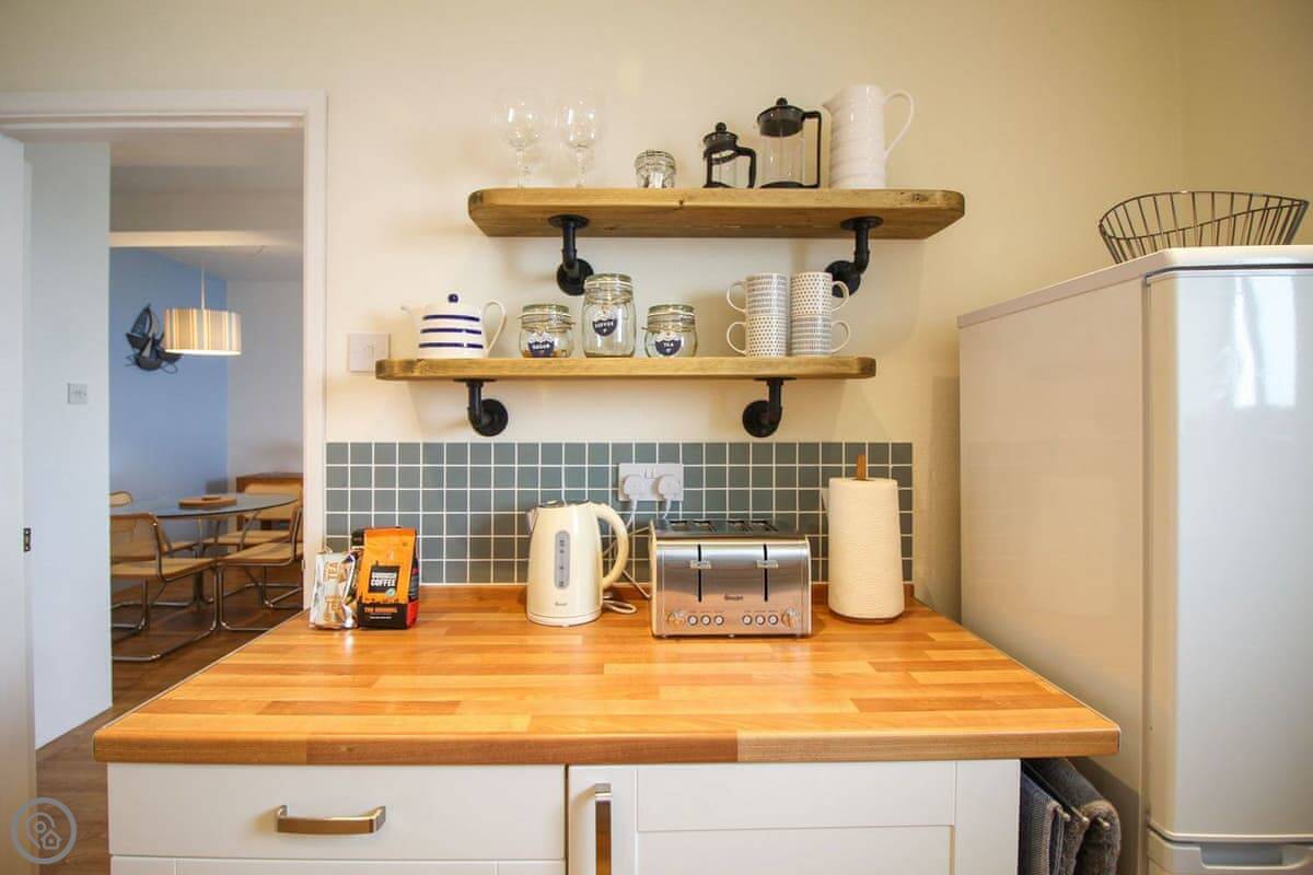 Facilities are all included: bedding, towels, WiFi, TV. There's a washing machine and a dishwasher. You can bring one dog. There's a patio area with a BBQ.