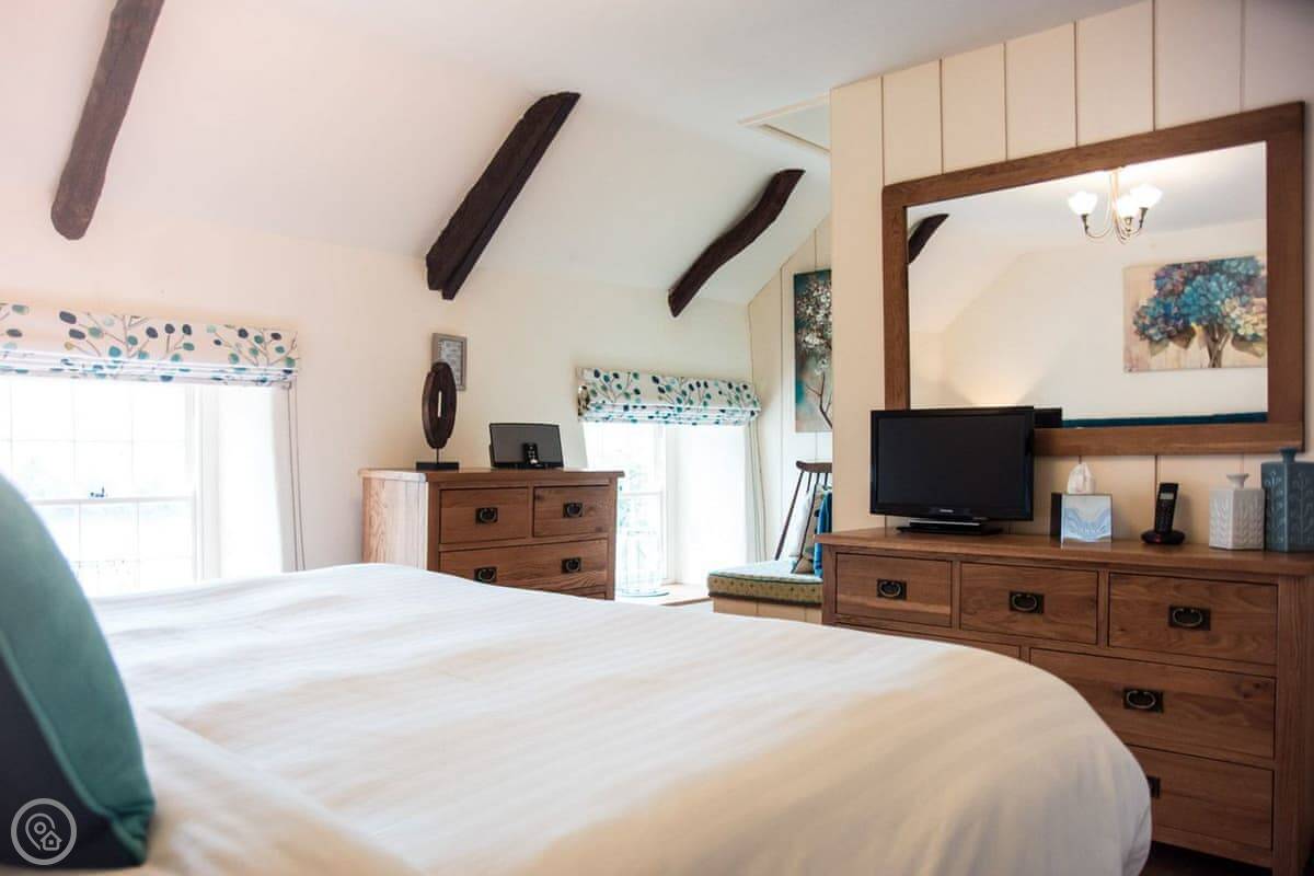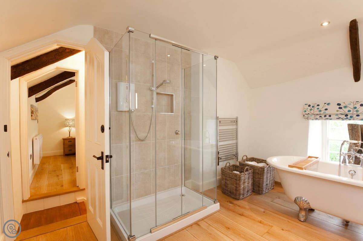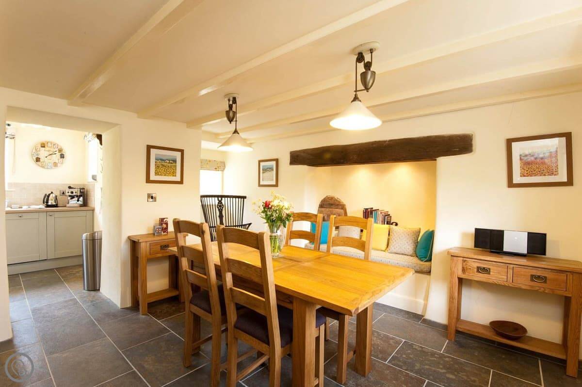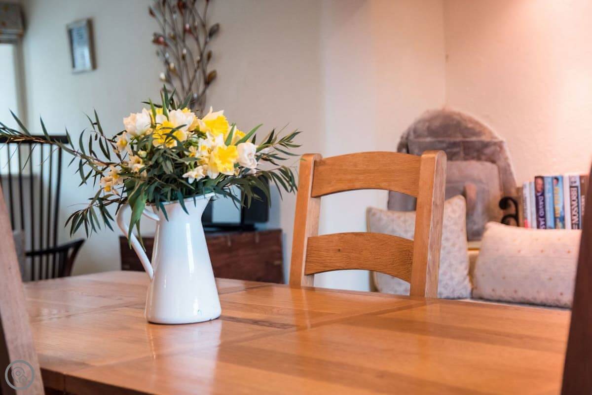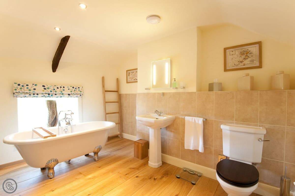 Inside, it's a 4 Star place, which means it's been done up nicely but it's still a cottage. Downstairs is all open plan: kitchen, dining area, living space. There's a wood burner. Upstairs is just the one bedroom with a super king bed, and a separate bathroom with a roll-top bath.