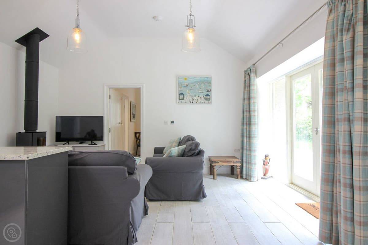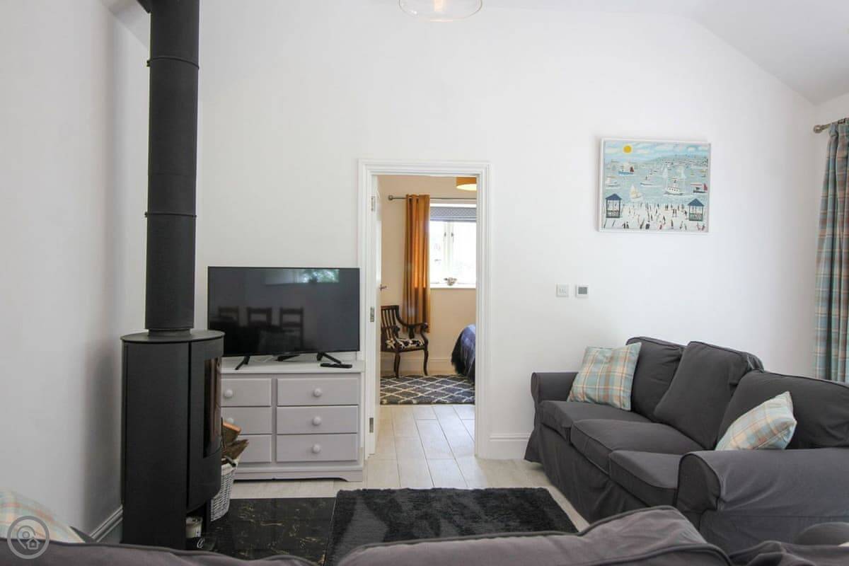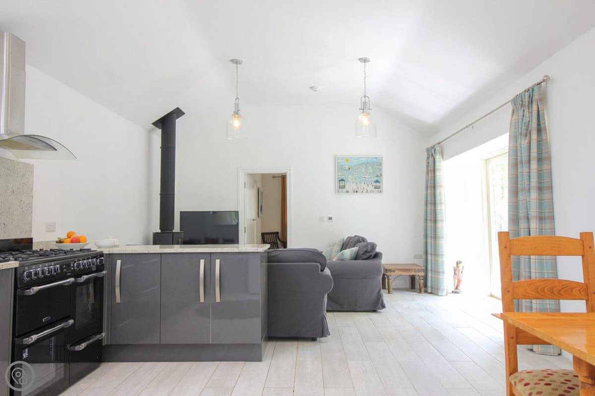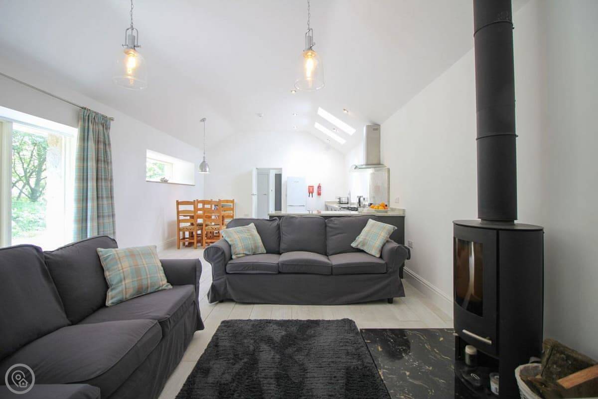 It's one bedroom with an en-suite shower. The shower is one of those rainfall ones. The main space is open plan, with a kitchen, dining area, and living room. It's all very light. The wood burner works well.