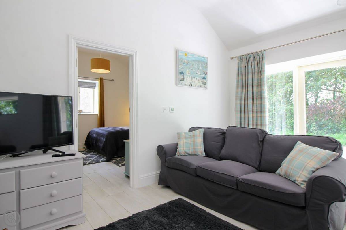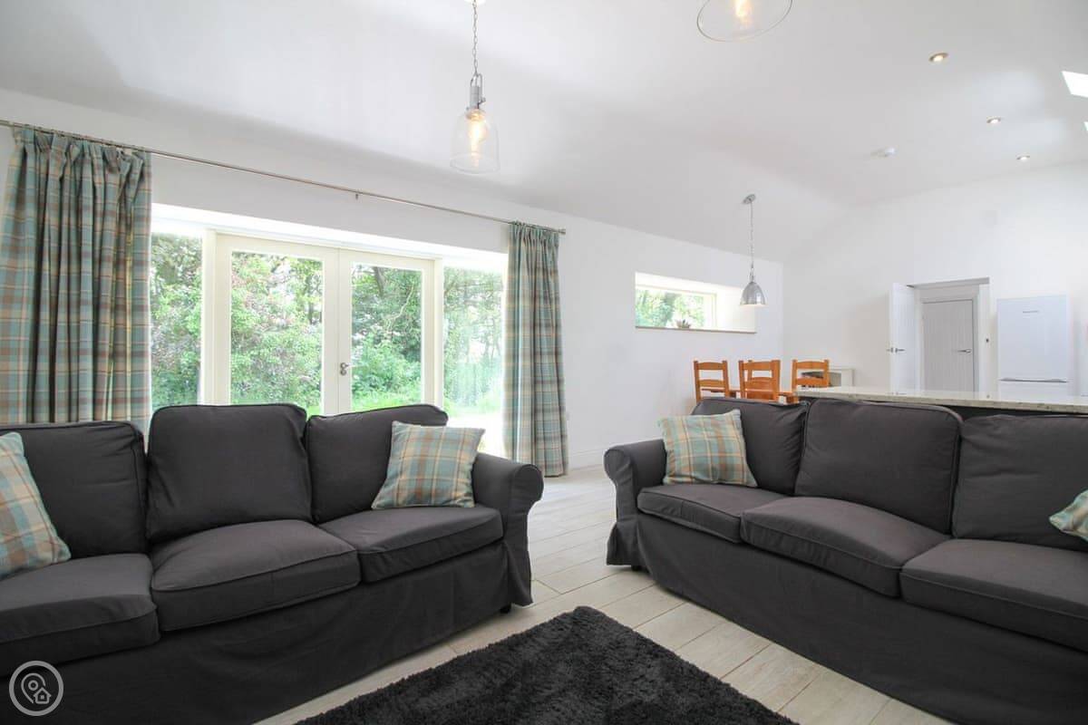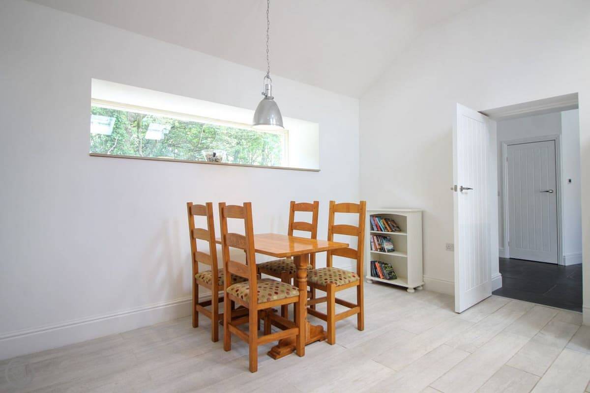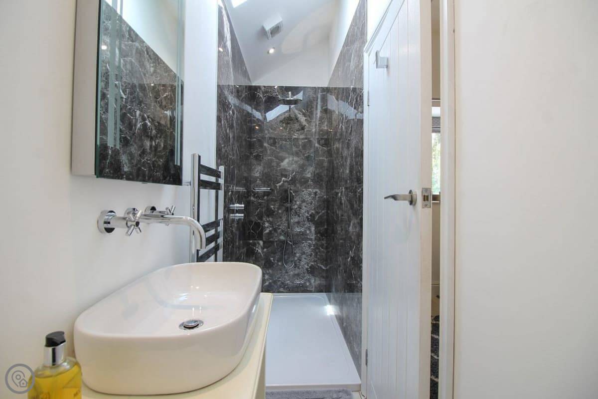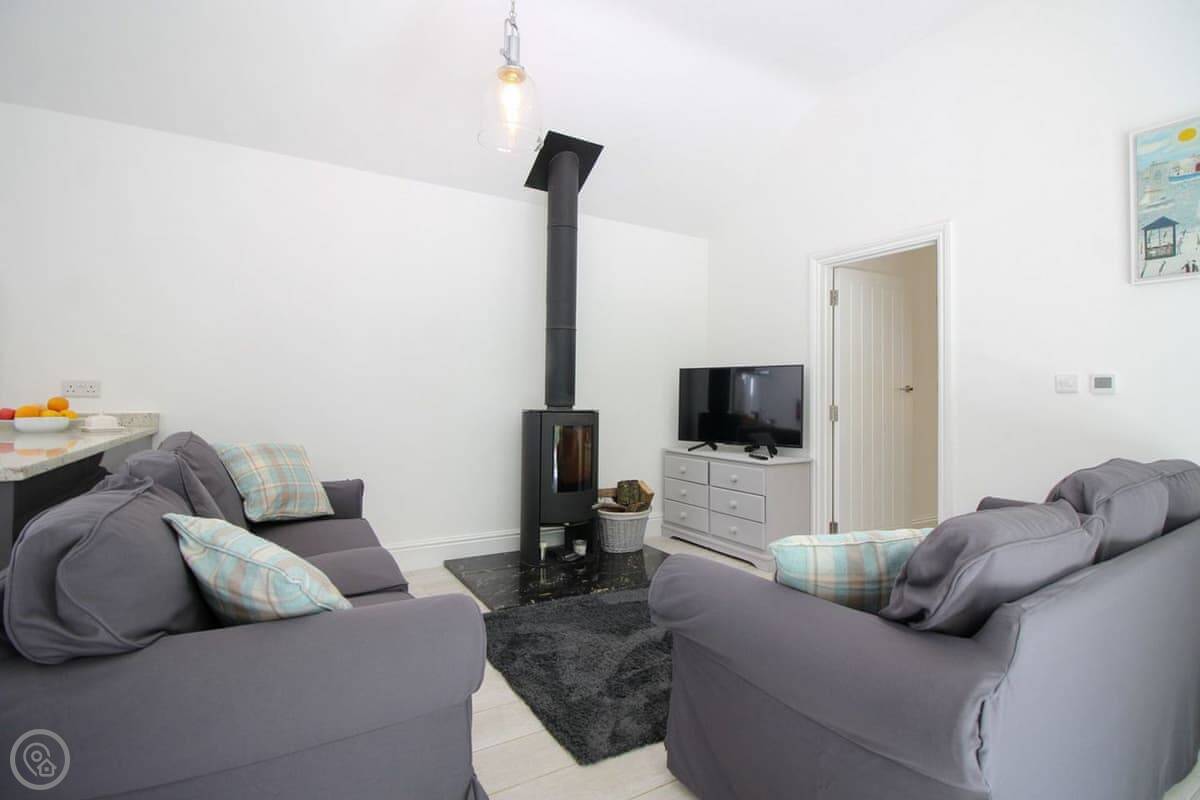 It's one bedroom with an en-suite shower. The shower is one of those rainfall ones. The main space is open plan, with a kitchen, dining area, and living room. It's all very light. The wood burner works well.