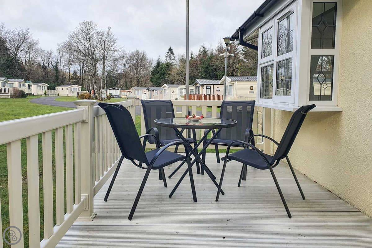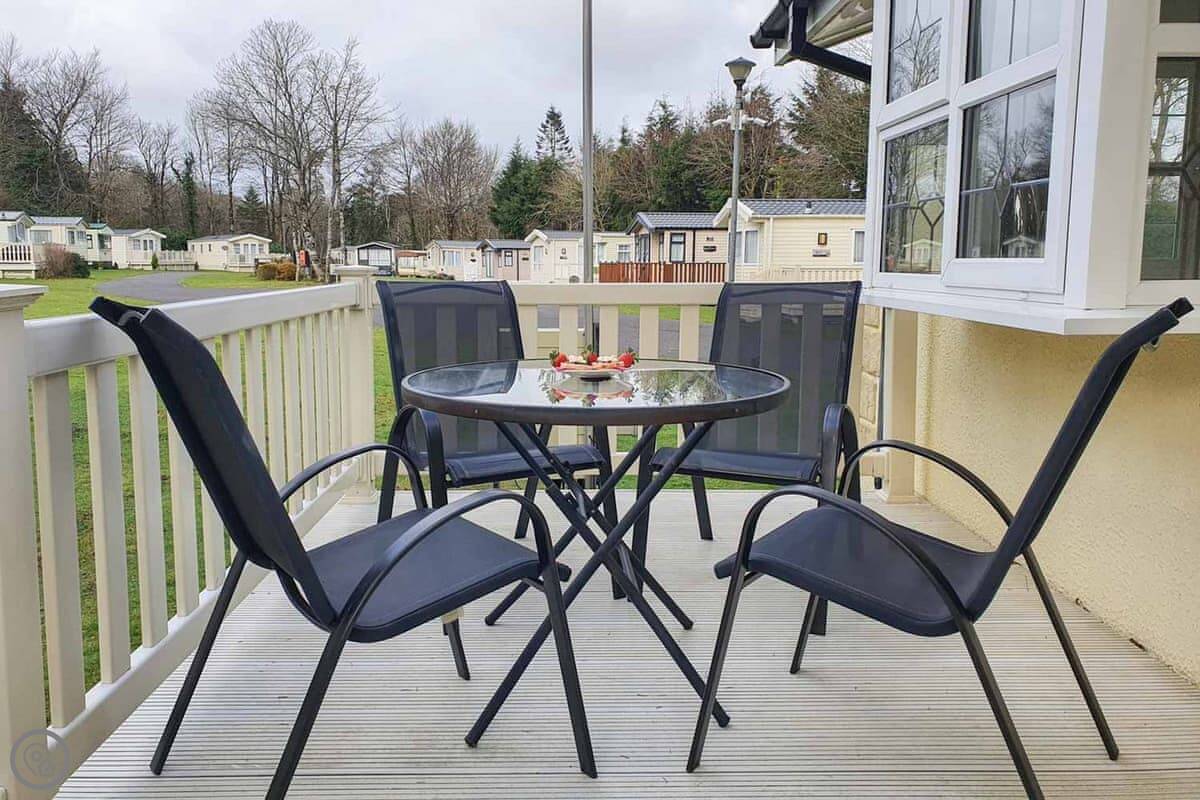 The stairs are inside. There's a patio with a table and chairs, and a barbecue you can use. The garden is shared with the other lodge, Daisy Lodge, but it's a big space.