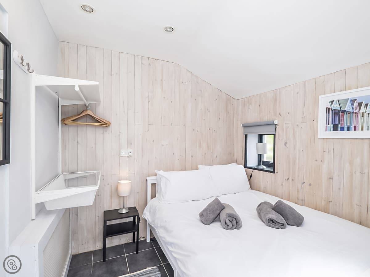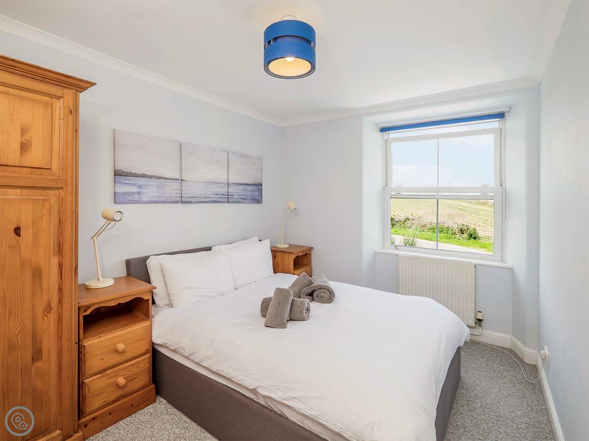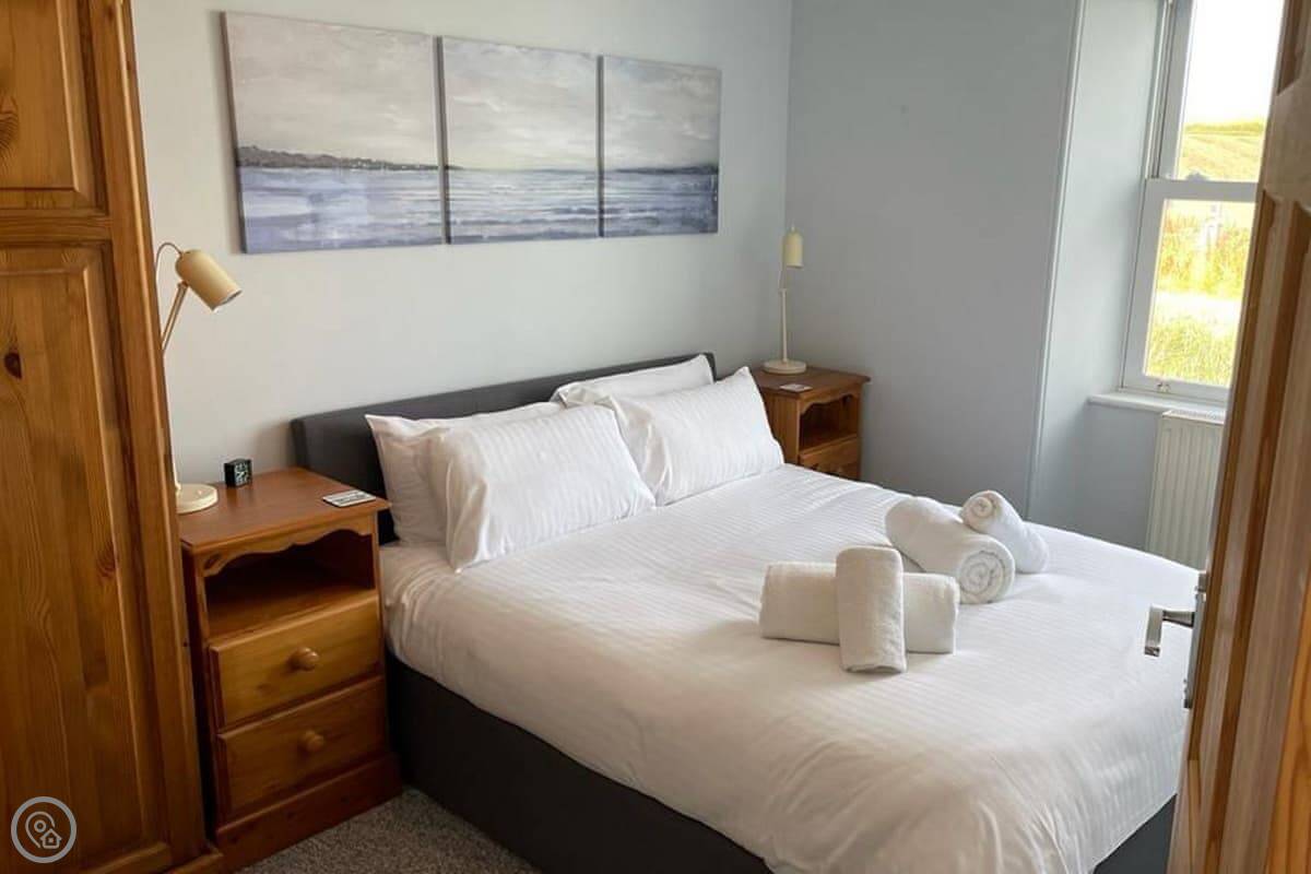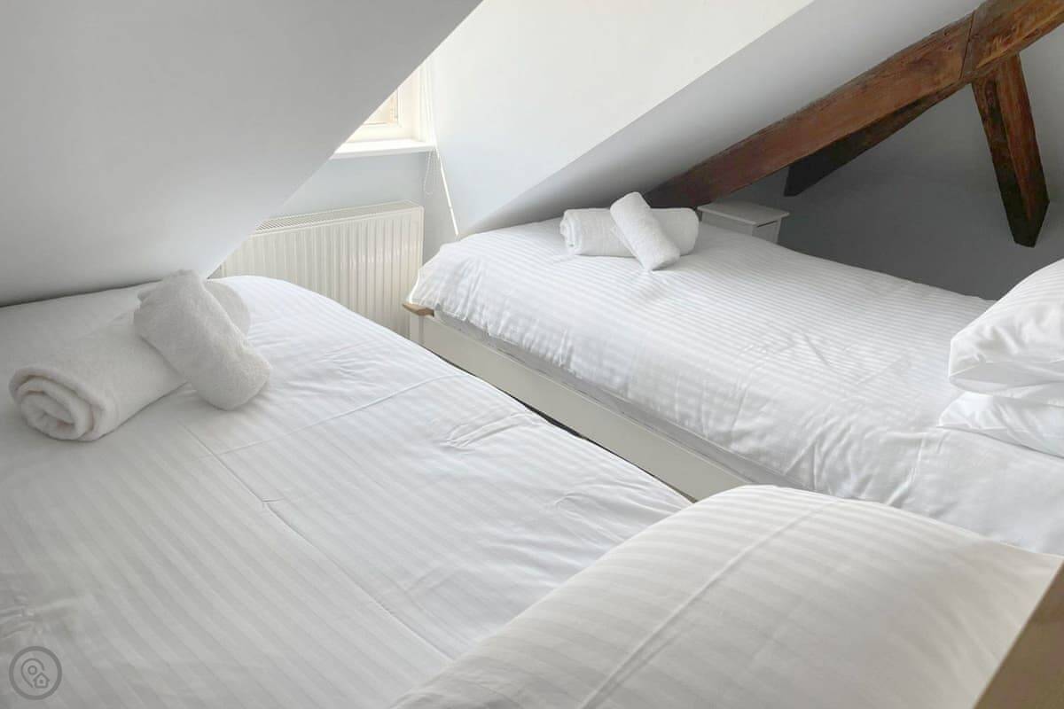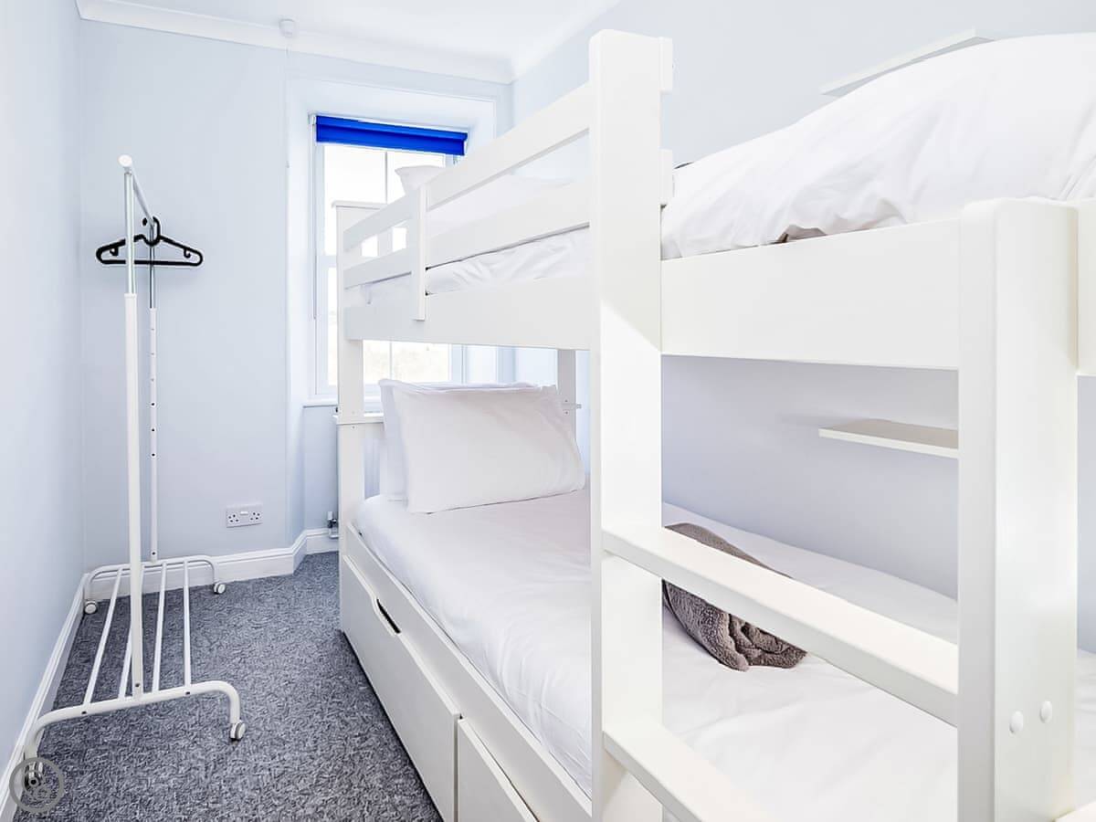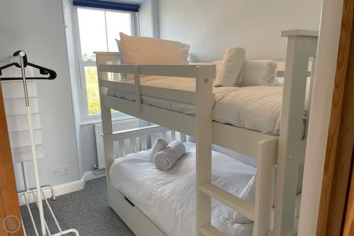 It sleeps eight. Four bedrooms, two bathrooms. One bedroom is on the ground floor. It's a double but it's a small room, so it's really best for one person. There's a roller blind you can pull across to separate that bit of the ground floor from the living space if you want. Upstairs, the main bedroom has a kingsize bed and you can see the sea from the window. There's a bunk bed room, and then another twin room up on the second floor. The stairs to that top floor are steep, like a ship's ladder. Just so you know.