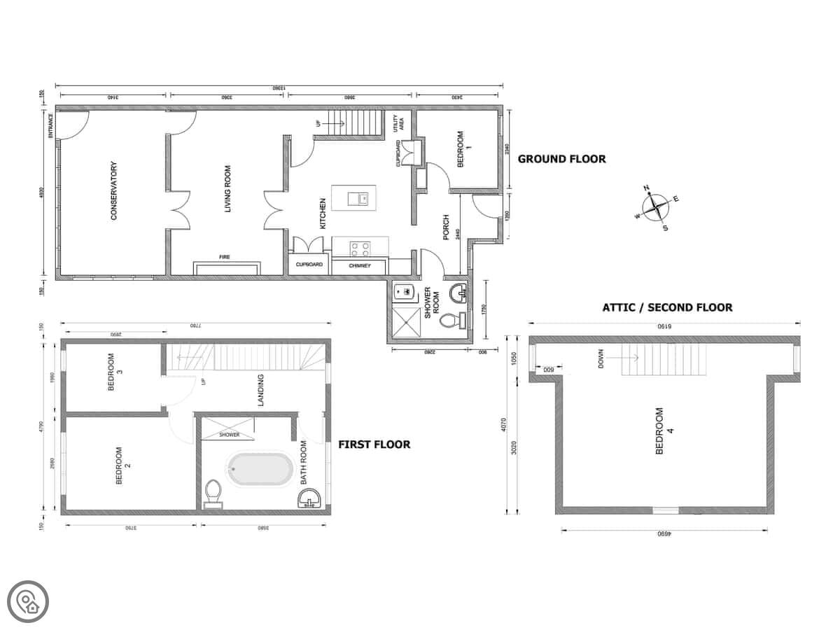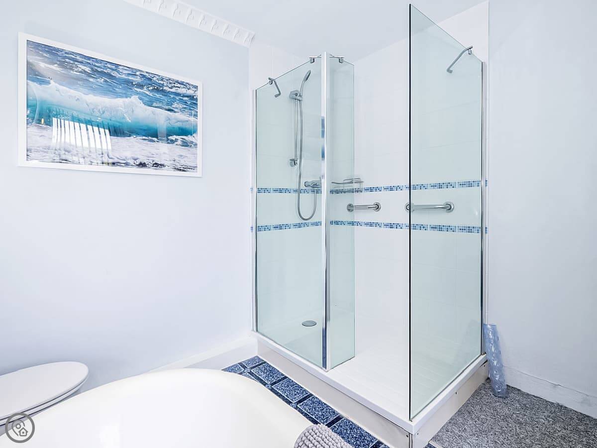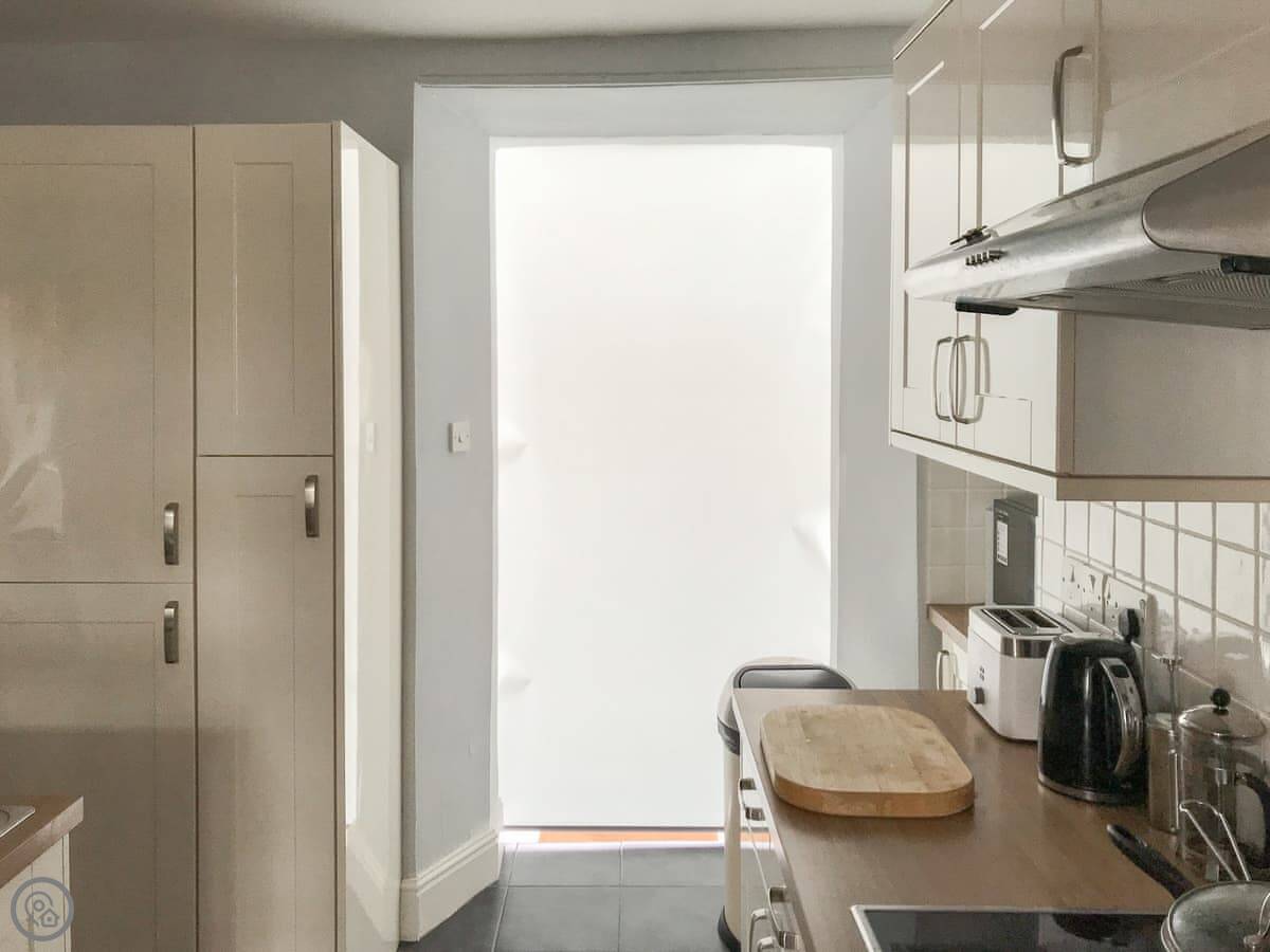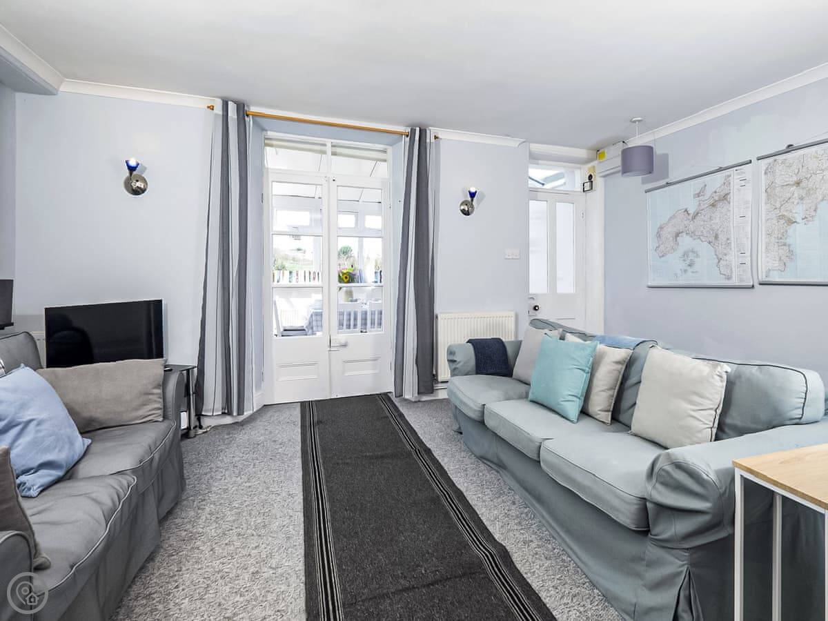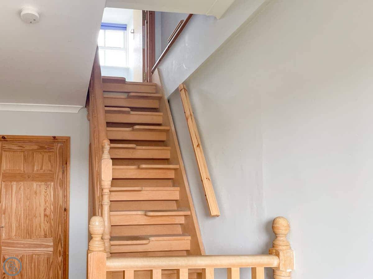 It sleeps eight. Four bedrooms, two bathrooms. One bedroom is on the ground floor. It's a double but it's a small room, so it's really best for one person. There's a roller blind you can pull across to separate that bit of the ground floor from the living space if you want. Upstairs, the main bedroom has a kingsize bed and you can see the sea from the window. There's a bunk bed room, and then another twin room up on the second floor. The stairs to that top floor are steep, like a ship's ladder. Just so you know.