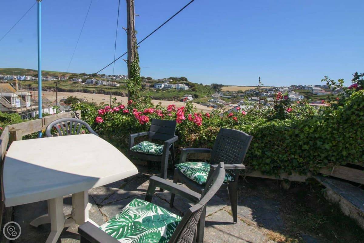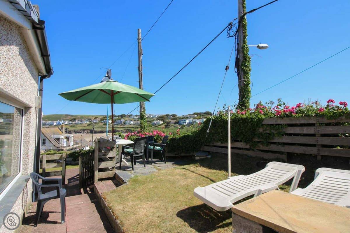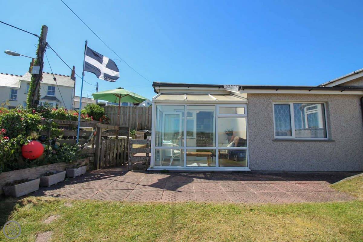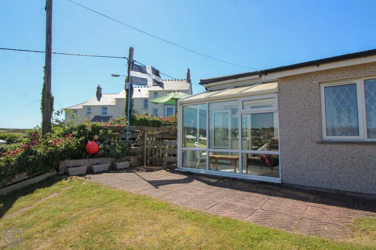 The view is the main thing. You can see the whole beach from the kitchen and from the little conservatory. There's a small raised patio with a table and chairs. It's a good spot to sit with a coffee.