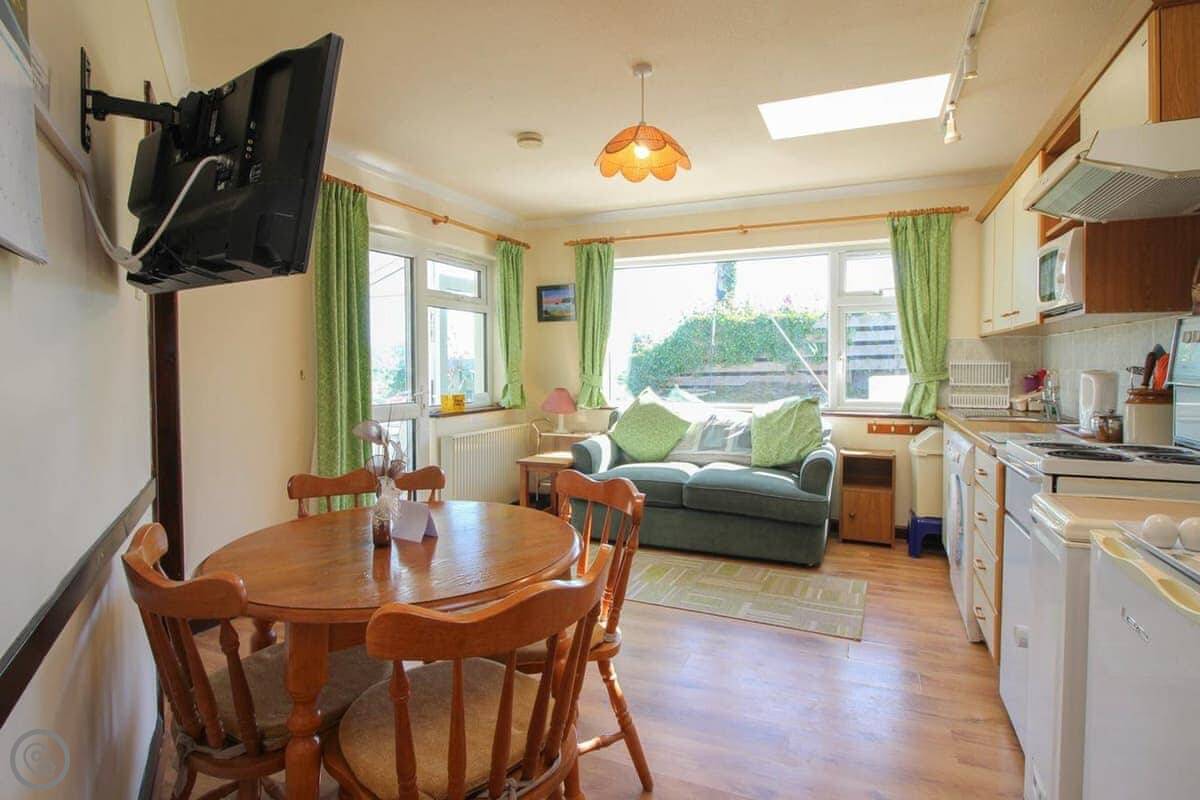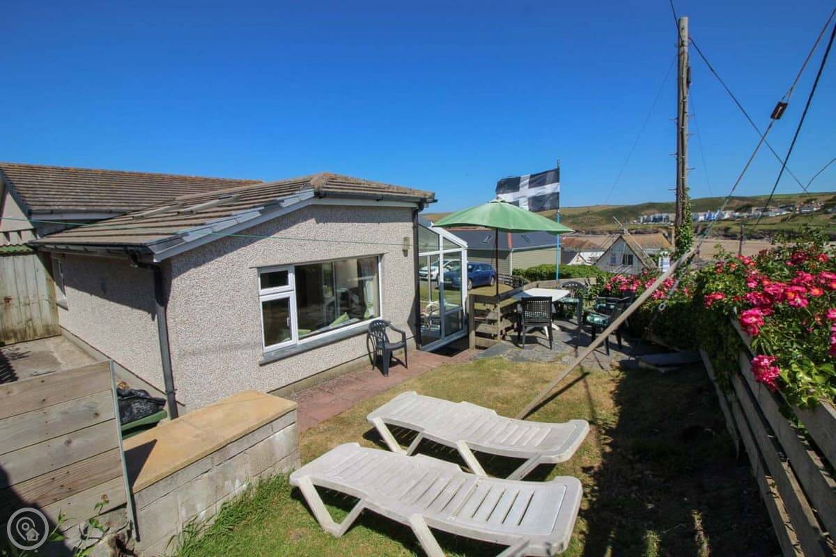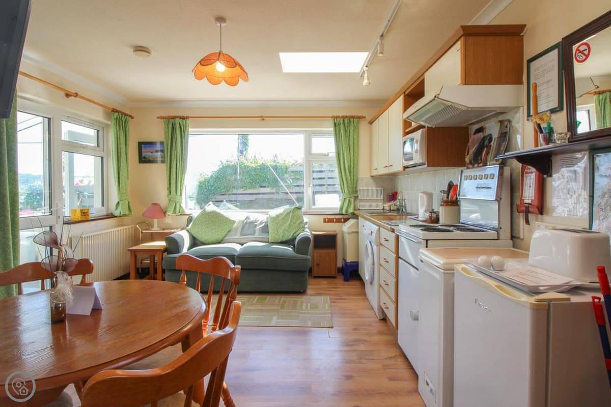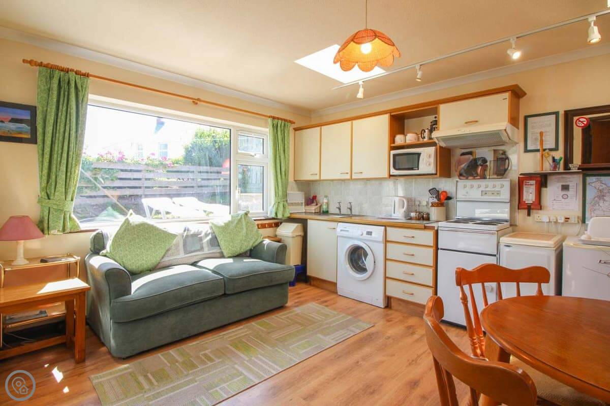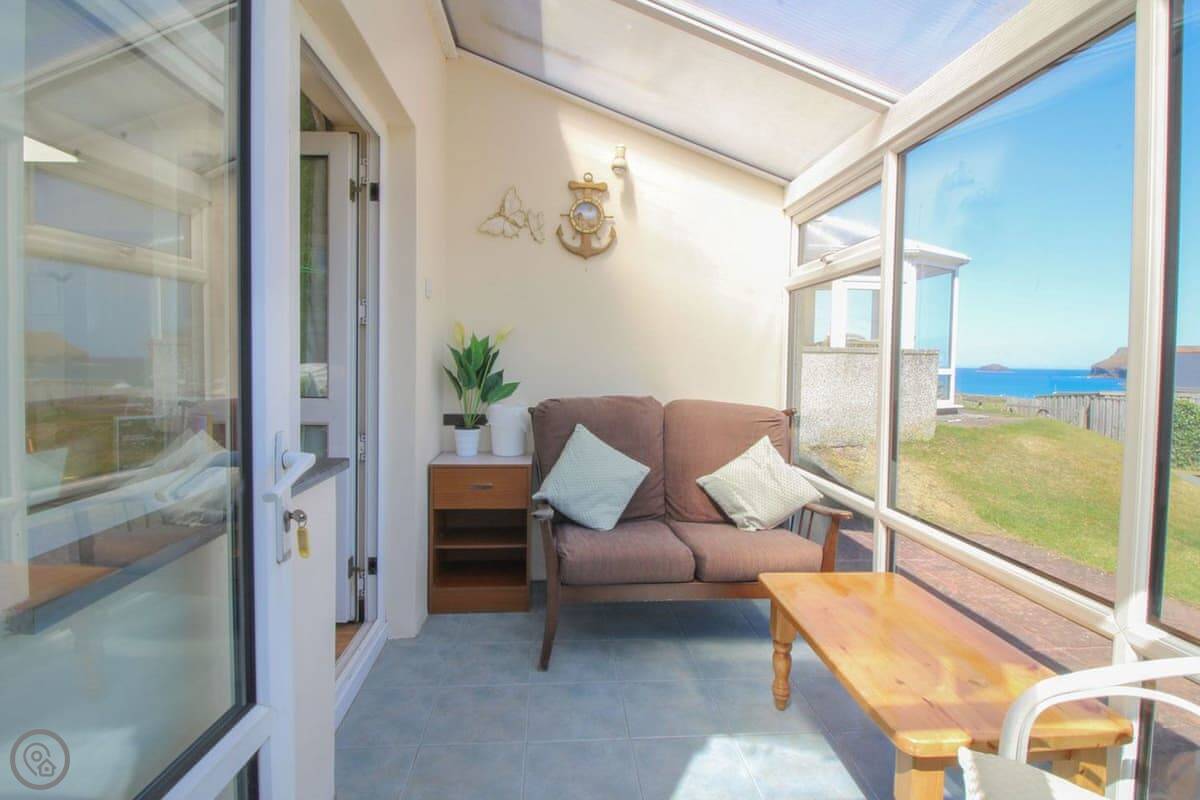 The view is the main thing. You can see the whole beach from the kitchen and from the little conservatory. There's a small raised patio with a table and chairs. It's a good spot to sit with a coffee.