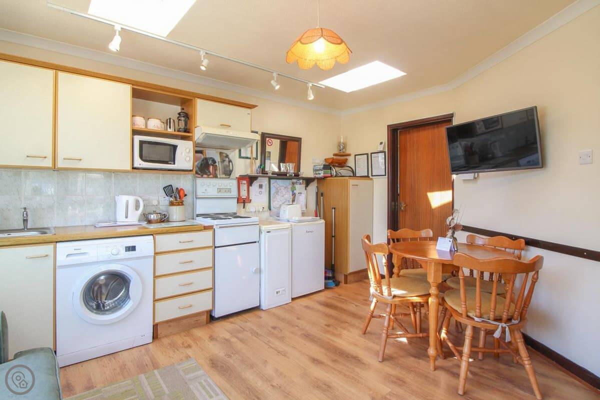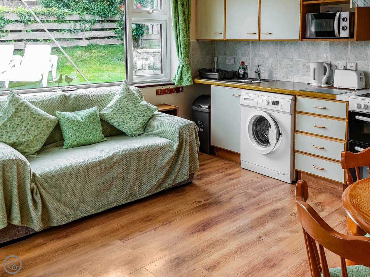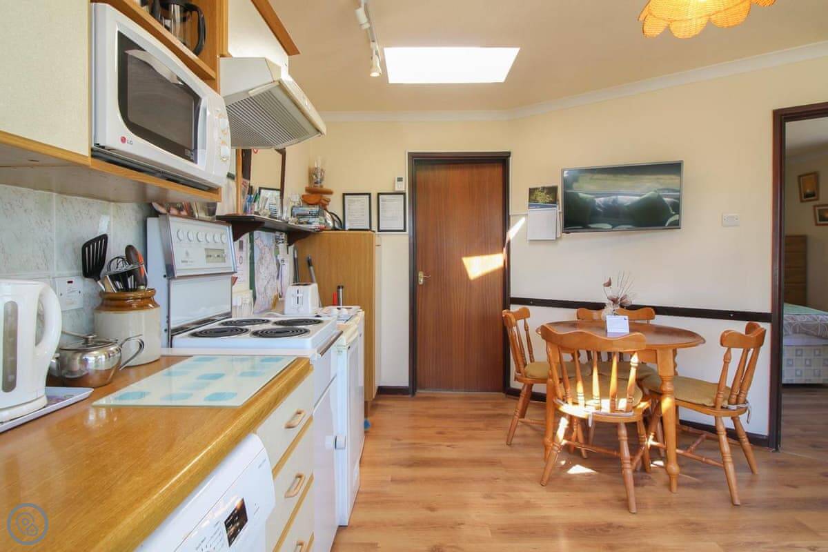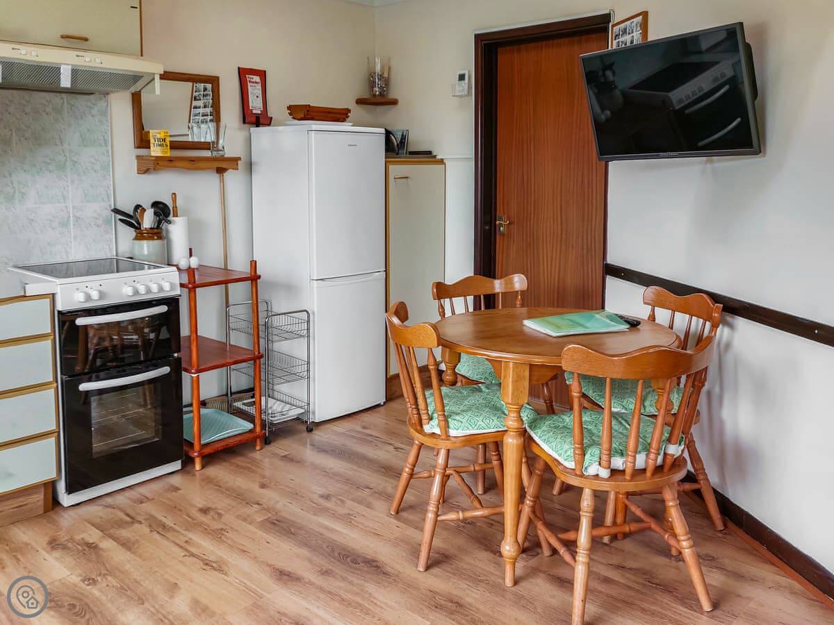 The view is the main thing. You can see the whole beach from the kitchen and from the little conservatory. There's a small raised patio with a table and chairs. It's a good spot to sit with a coffee.