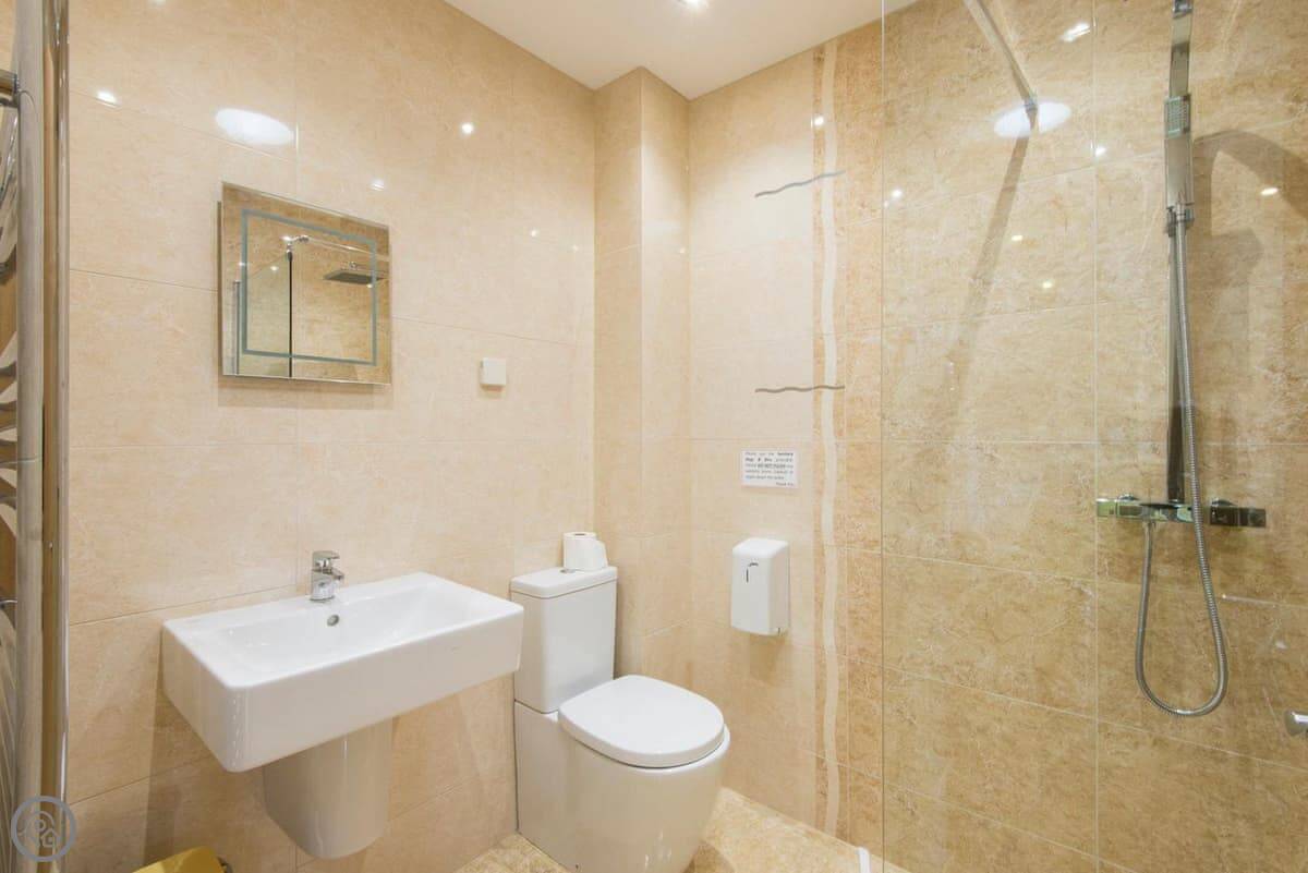 It sleeps six in three bedrooms. Each bedroom has its own bathroom, which is useful. Two rooms look out over the sand school from the livery yard next door. The third has its own door out to the parking area.