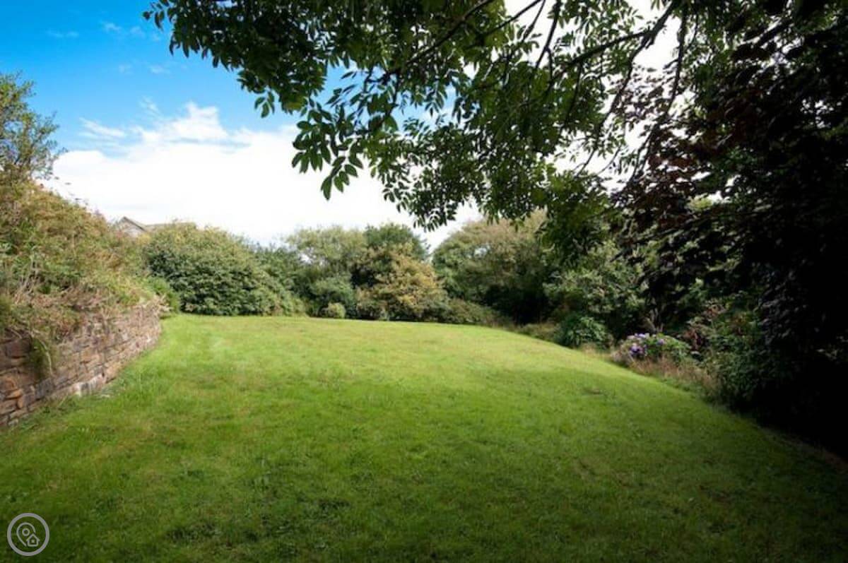 The garden is fully enclosed. There's a terrace with a built-in barbecue and a sloping lawn. The property sits up on the side of a valley. You have a nice view over the trees from the house. There's a path from the garden that leads down into the wooded valley, which belongs to me. You're welcome to walk there.