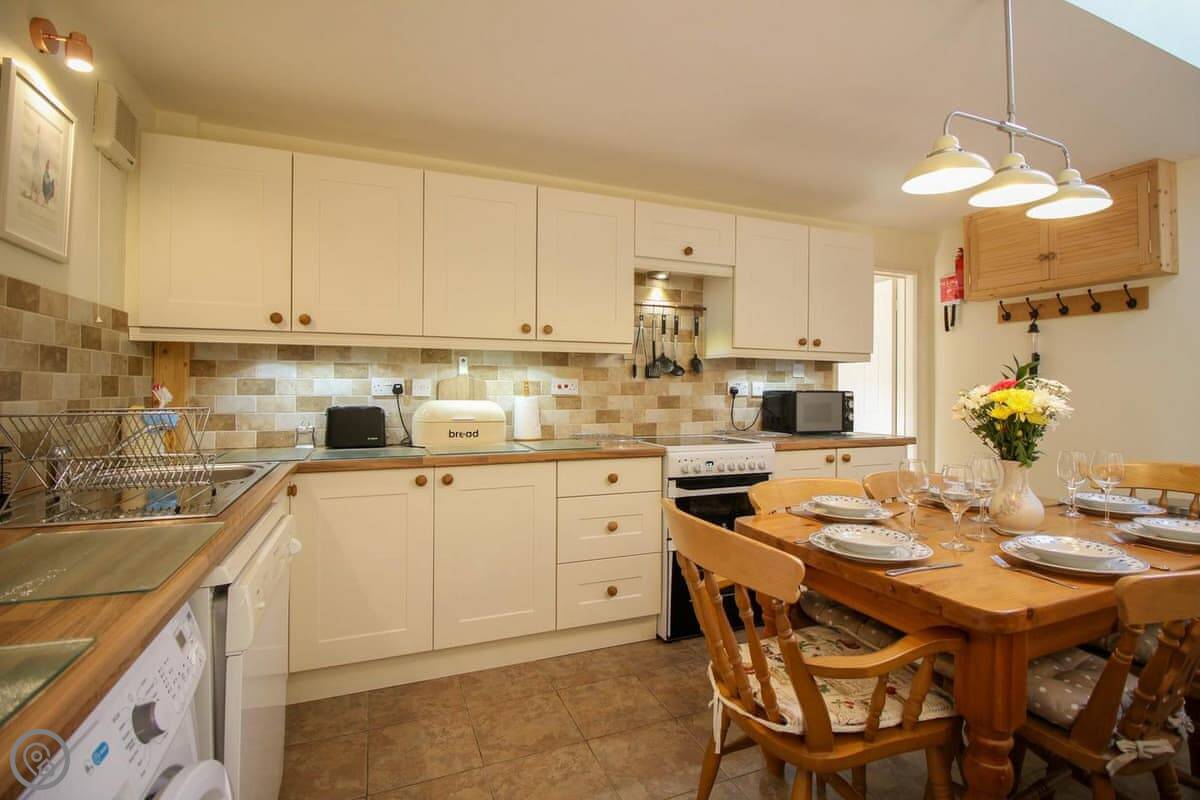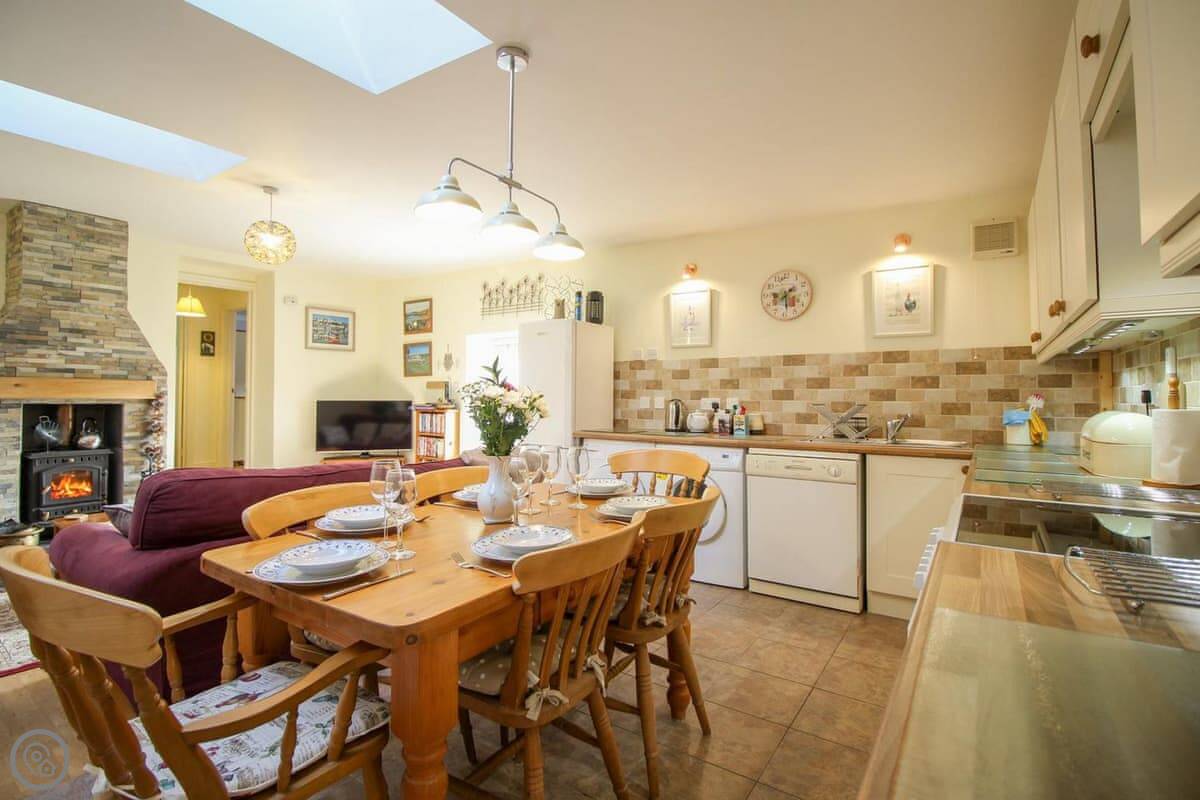 The place is roomy inside. There's a big dining table. It has a wood burning stove for cooler evenings. The kitchen is fitted and has a dishwasher. There's a washing machine too. Bedding and towels are included. You can bring one dog.