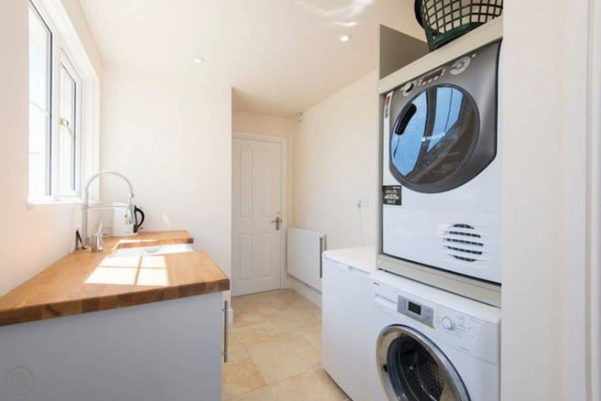 There are 14 steps down from the drive to get to your front door. There's a handrail. Up by the drive, we let you use the utility room in the boathouse. There's a washing machine and tumble dryer in there, plus a decent shower which is handy for washing off sand.