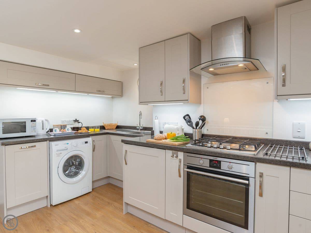The kitchen has everything: dishwasher, washing machine, fridge. Bedding and towels are included, and there’s wifi.