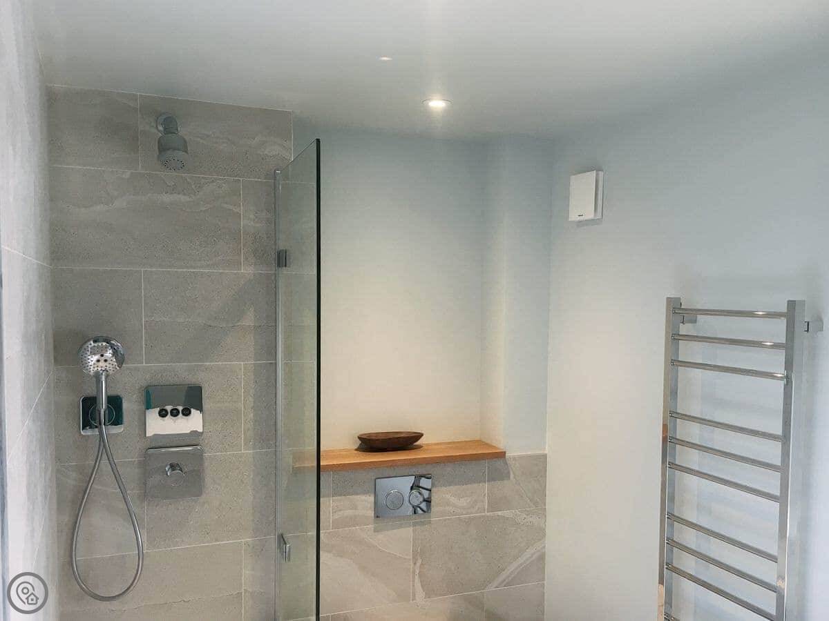 It's just for two people. One bedroom, one bathroom. The kitchen and living space are open plan. It's got a woodburning stove, which is nice in the evenings. There's a dishwasher and washing machine.