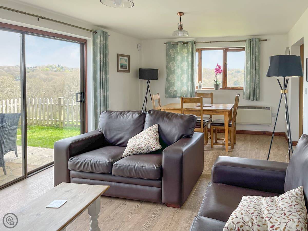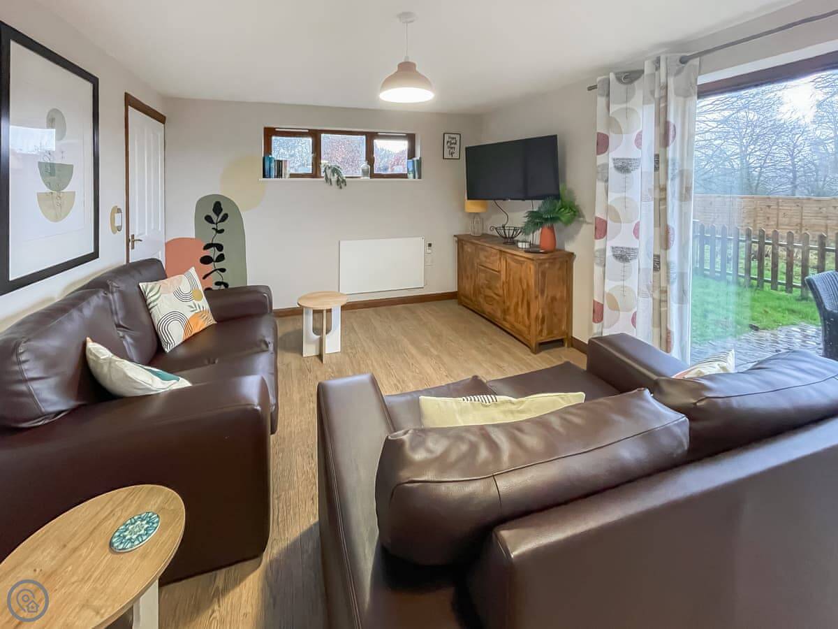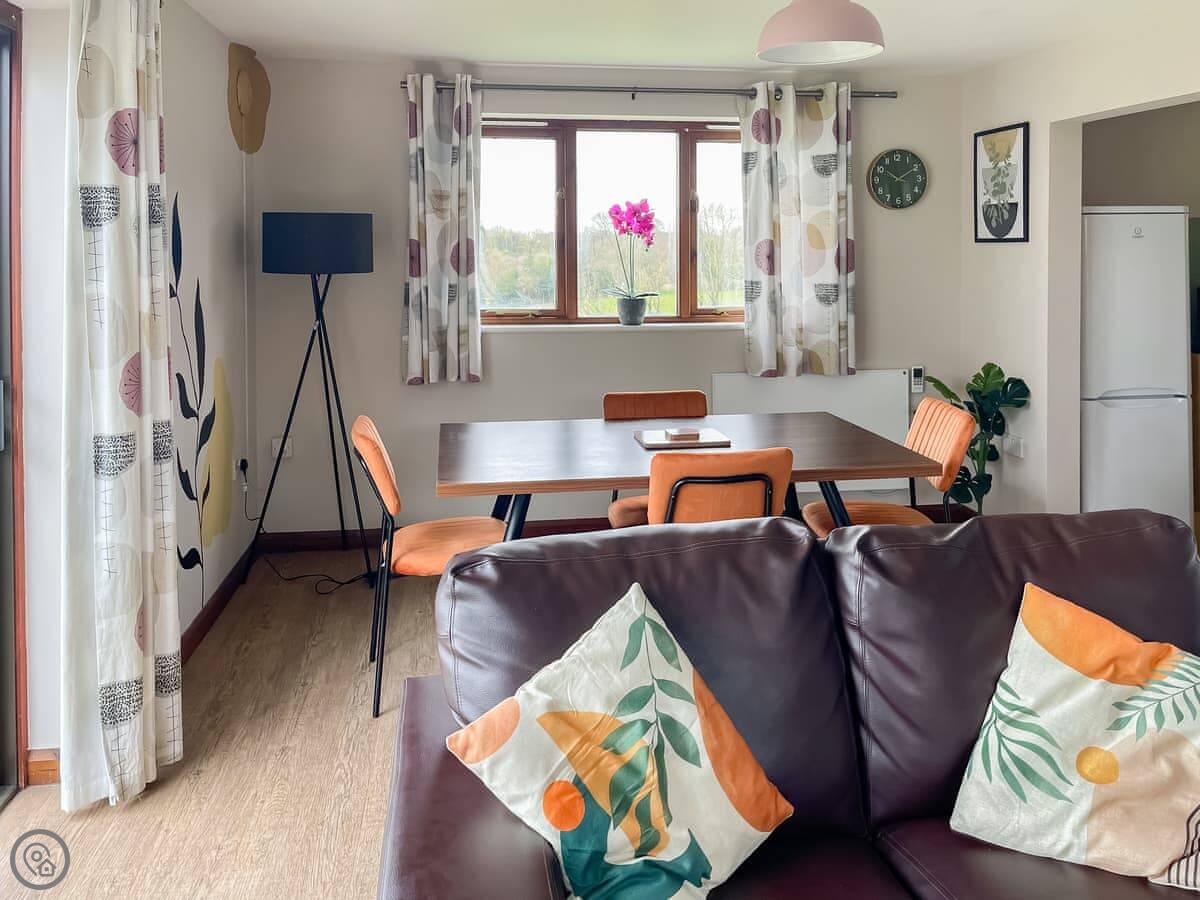 It sleeps four. Two bedrooms, one bathroom. It's a 3 Star place, so it's clean and comfortable without being high-end. The main living area is a good size and there's a deck out the back. The view from there is nice, just fields and trees. You have access to about eleven acres of land here, which you can walk around. There are some woods and a stream.