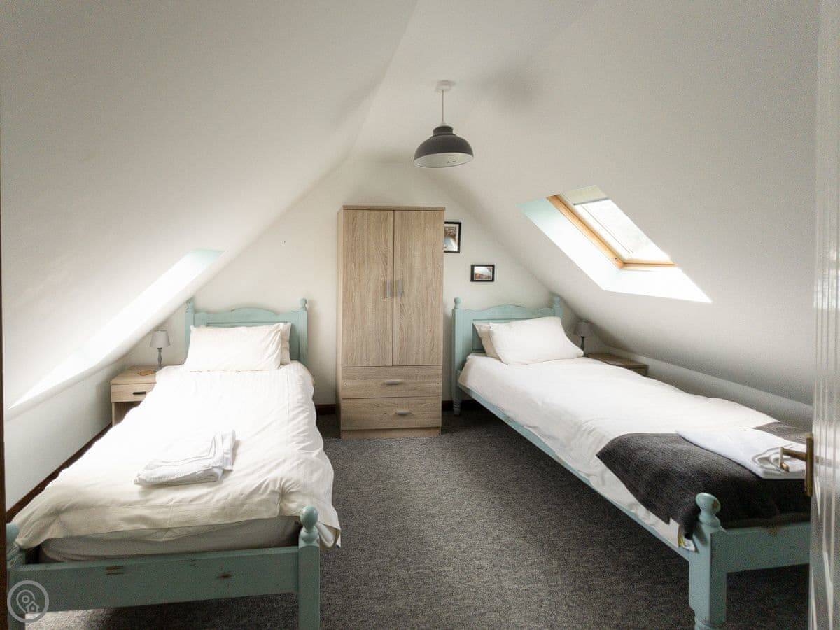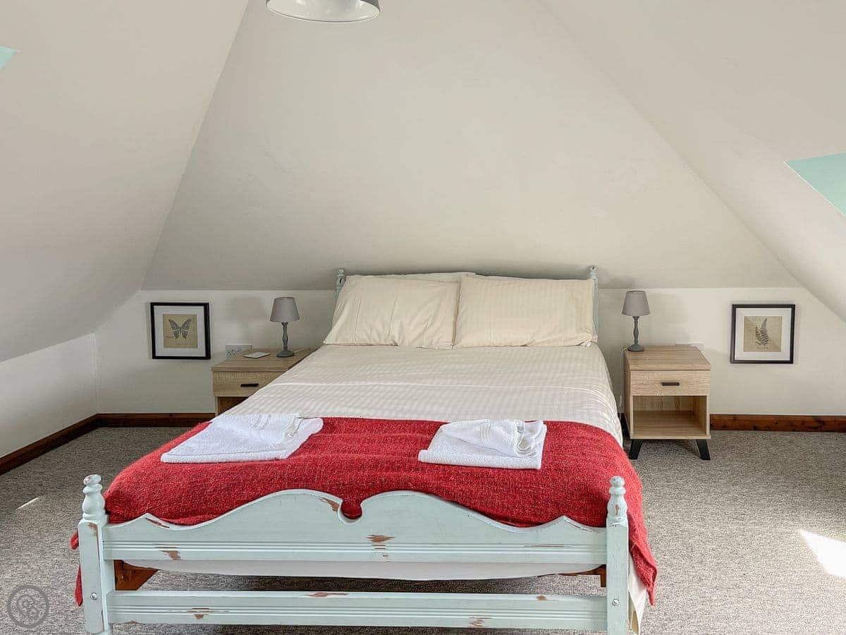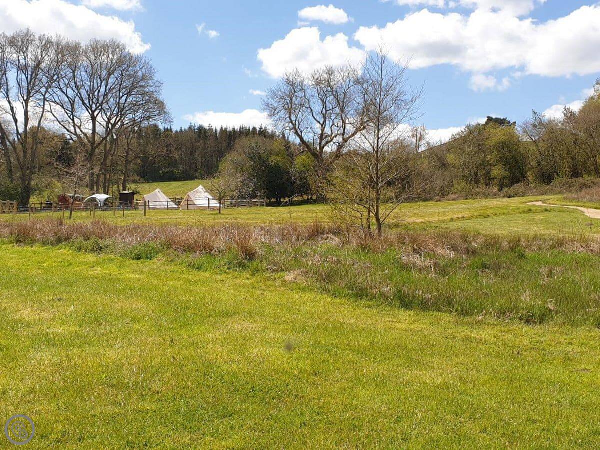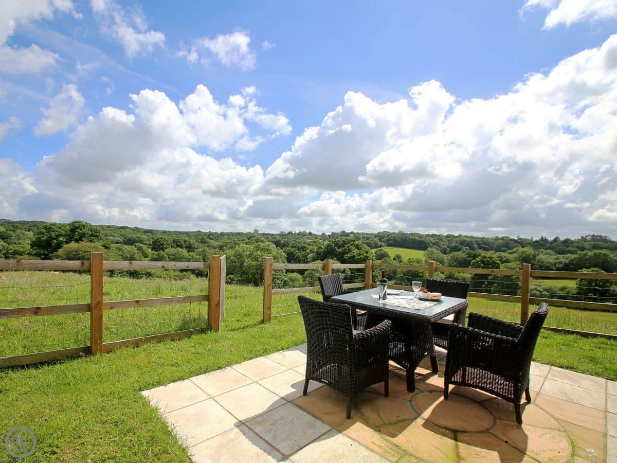It sleeps four. Two bedrooms, one bathroom. It's a 3 Star place, so it's clean and comfortable without being high-end. The main living area is a good size and there's a deck out the back. The view from there is nice, just fields and trees. You have access to about eleven acres of land here, which you can walk around. There are some woods and a stream.