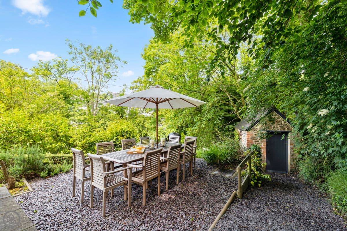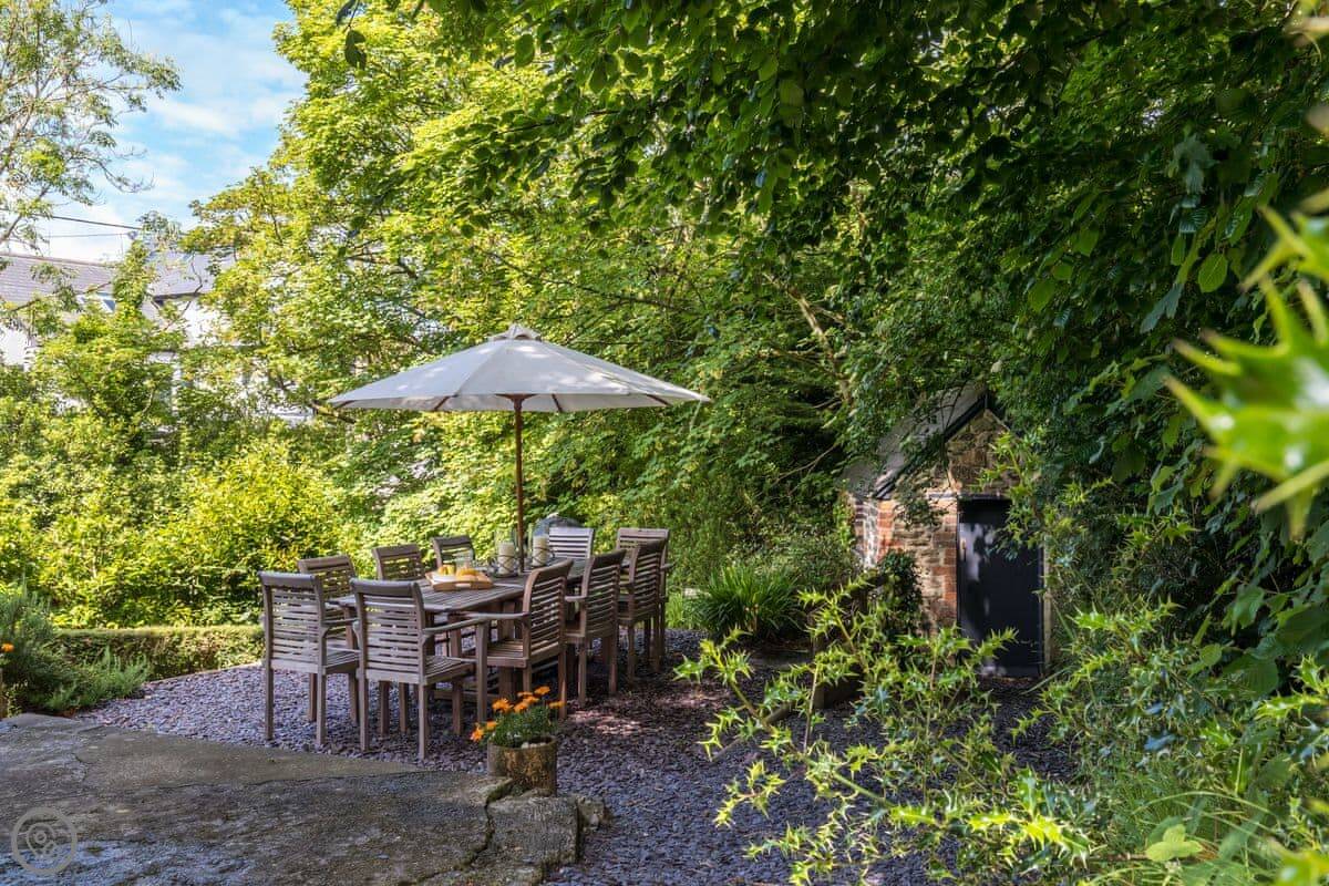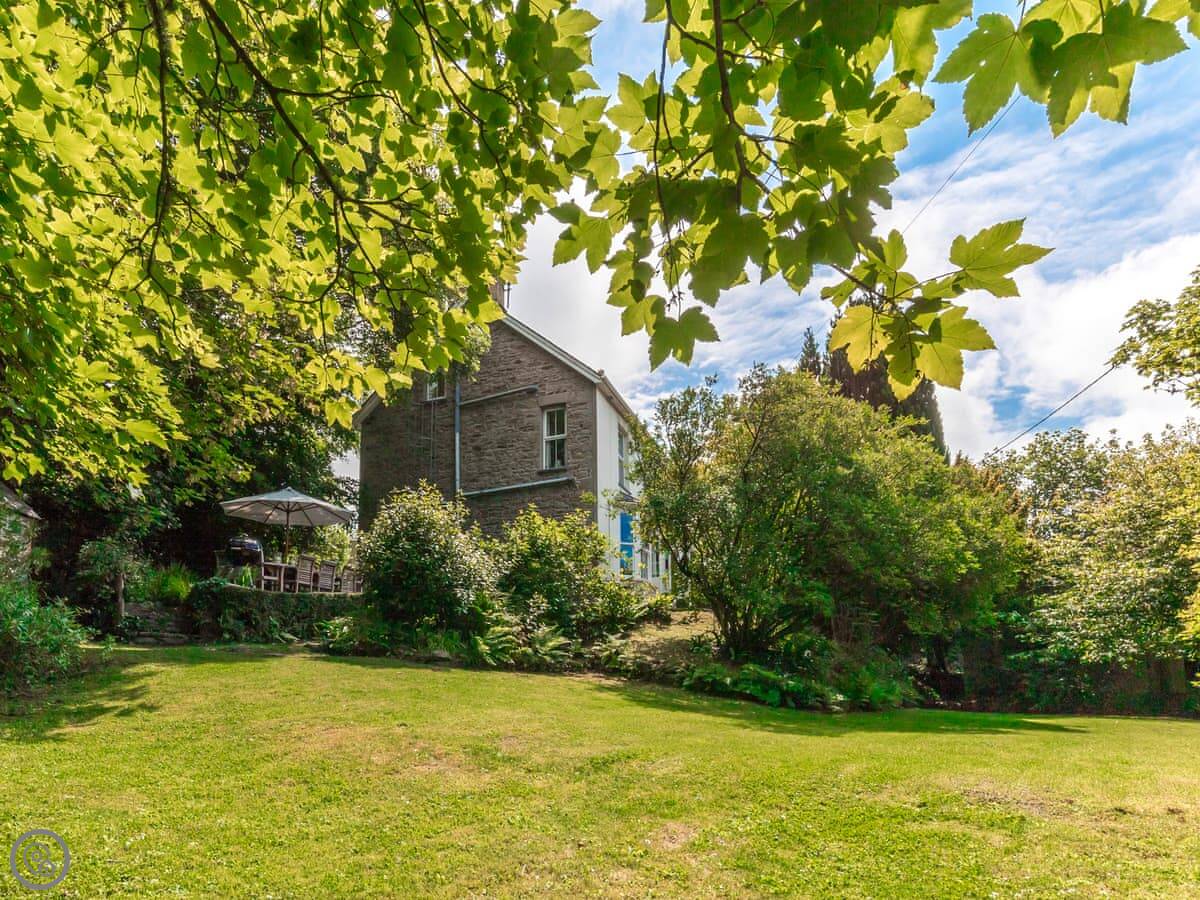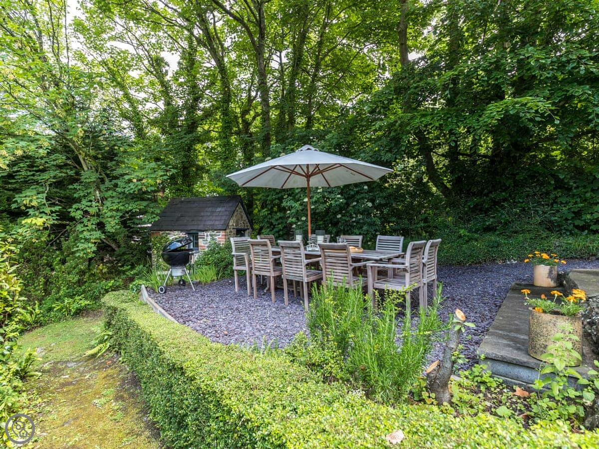 The garden is on different levels. There's a stream at the bottom called the 'Saith'. It runs right by the garden and then goes over the cliffs onto the beach. The beach is sandy and sheltered. It's a two minute walk from the house.