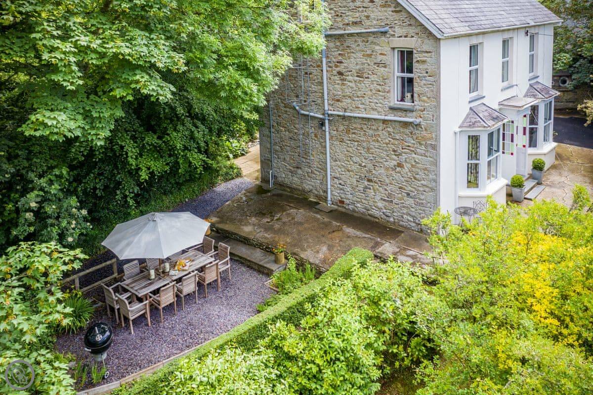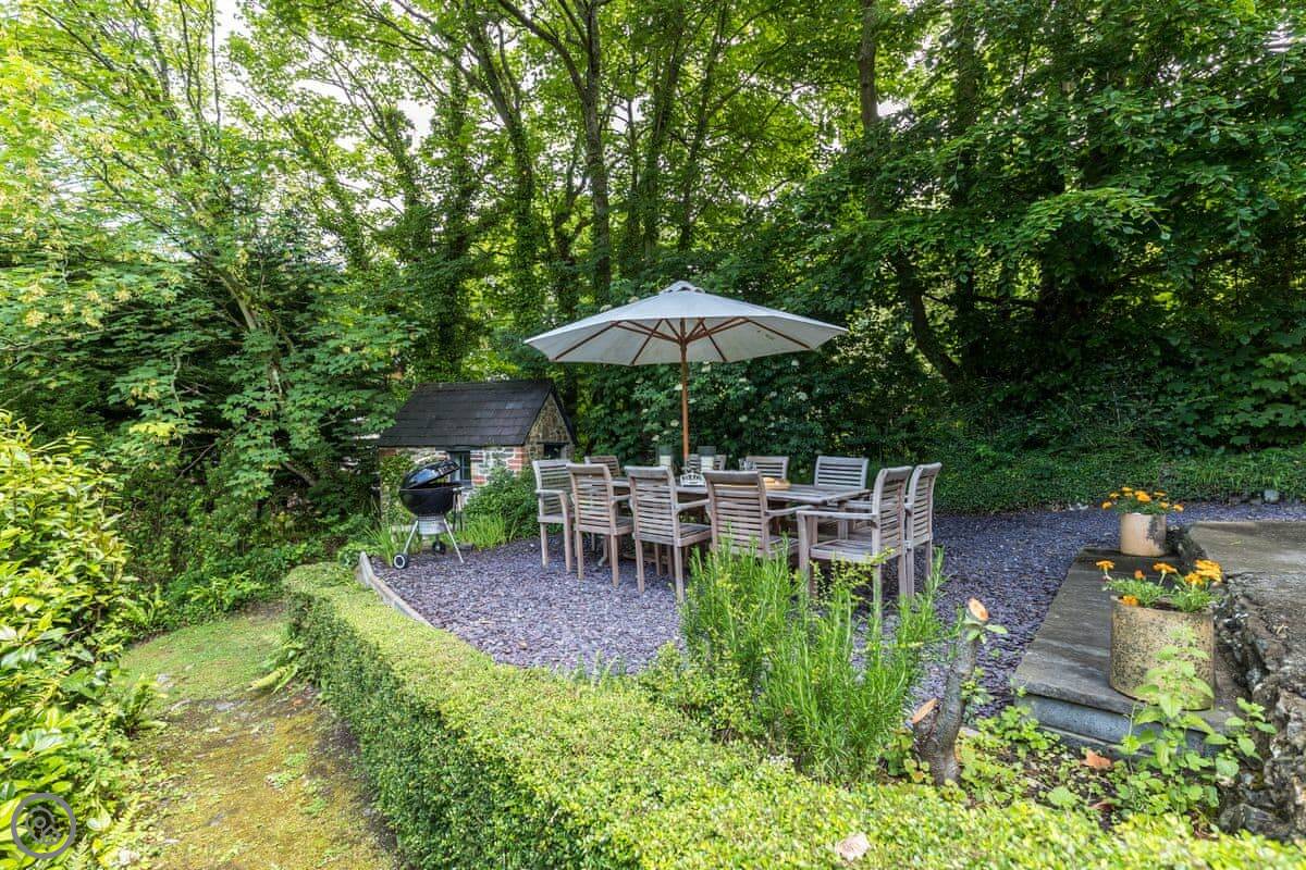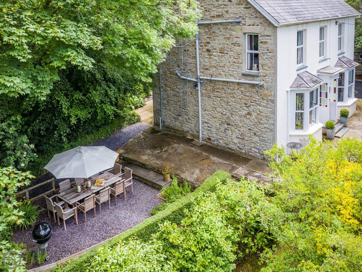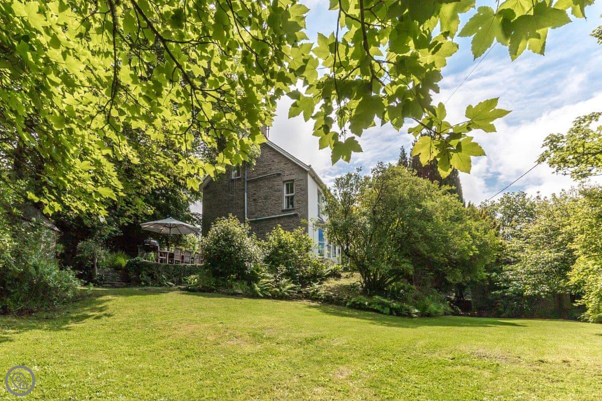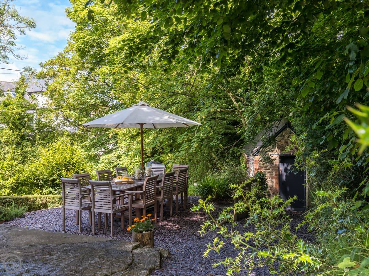 The garden is on different levels. There's a stream at the bottom called the 'Saith'. It runs right by the garden and then goes over the cliffs onto the beach. The beach is sandy and sheltered. It's a two minute walk from the house.