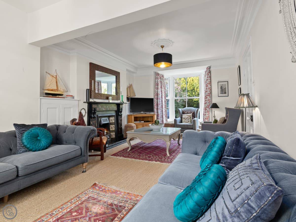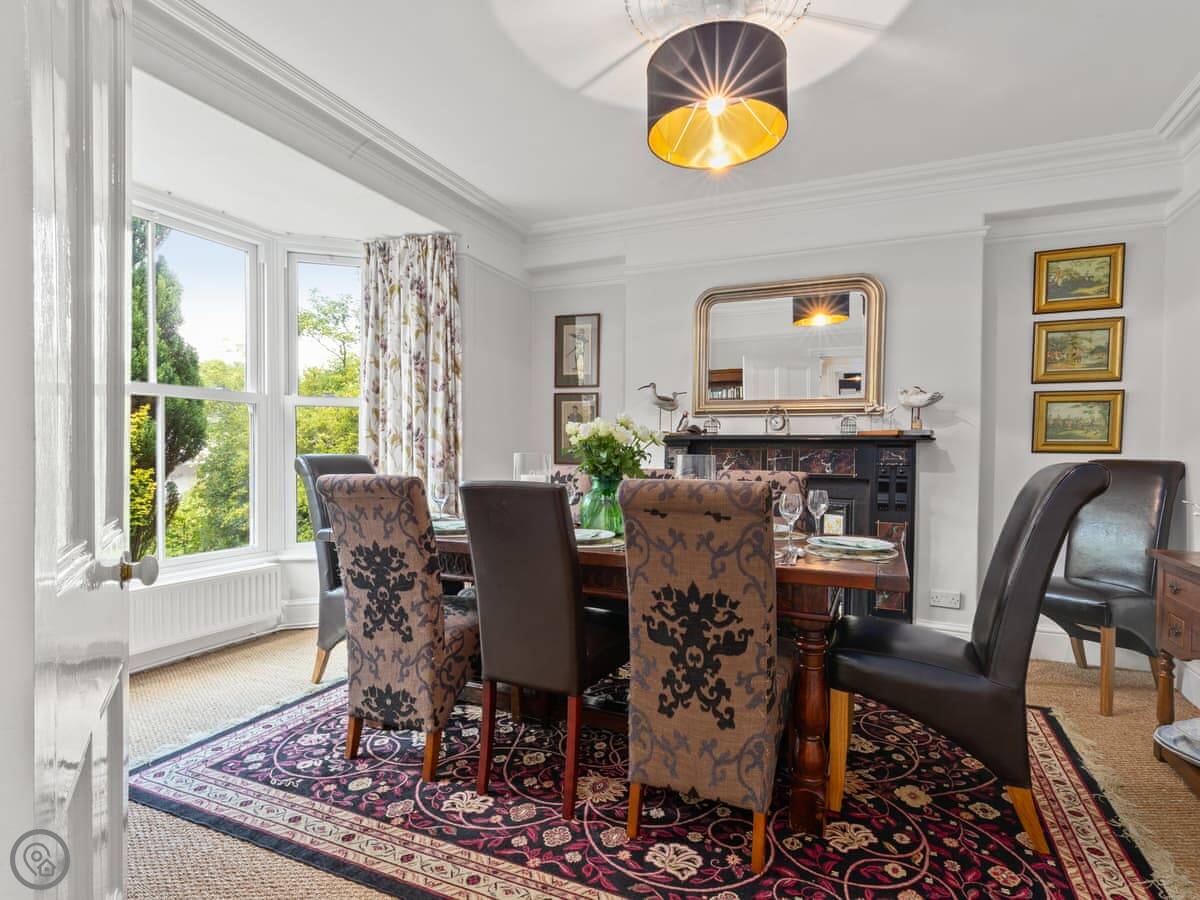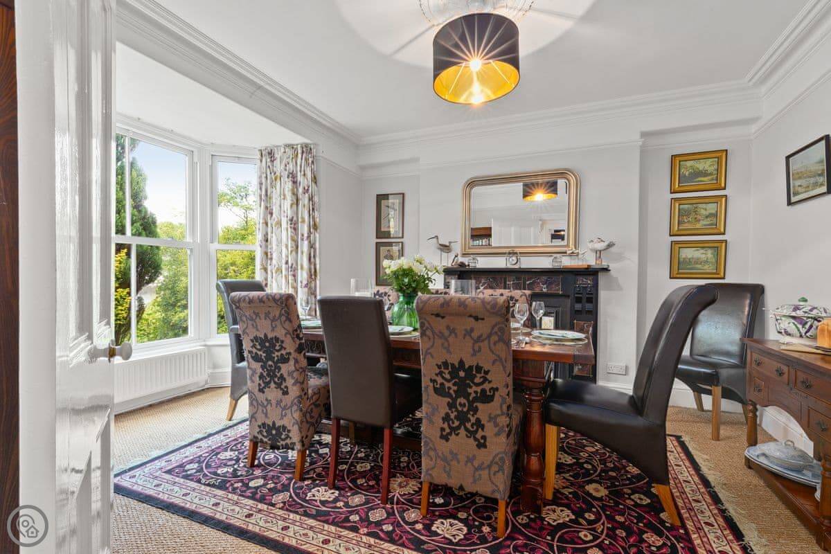 It's a 5 Star place, which means it's done up well. The work kept a lot of the old features like the fireplaces and the tiled floors, but it's got a new kitchen and comfy furniture. The rooms are big and light. The dining room has a table for ten by the bay window.
