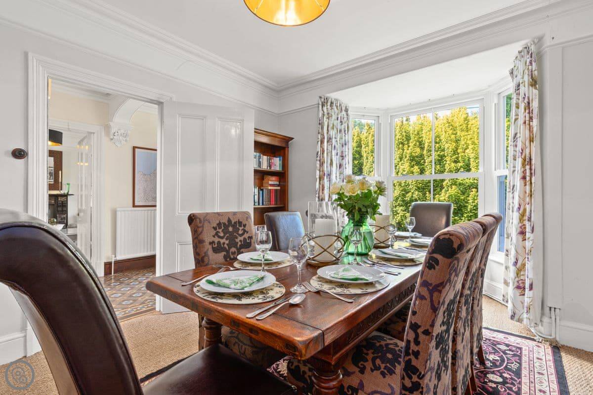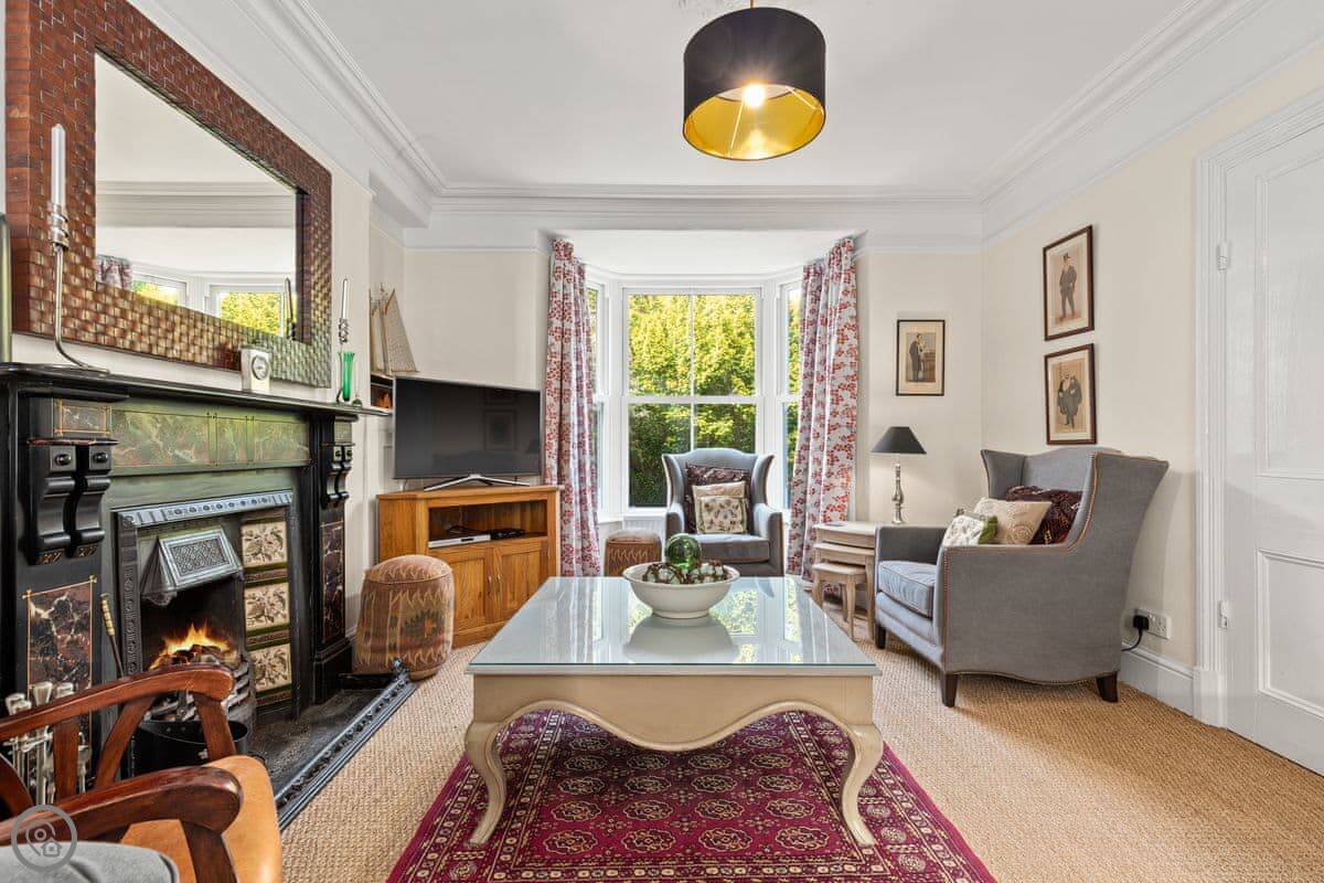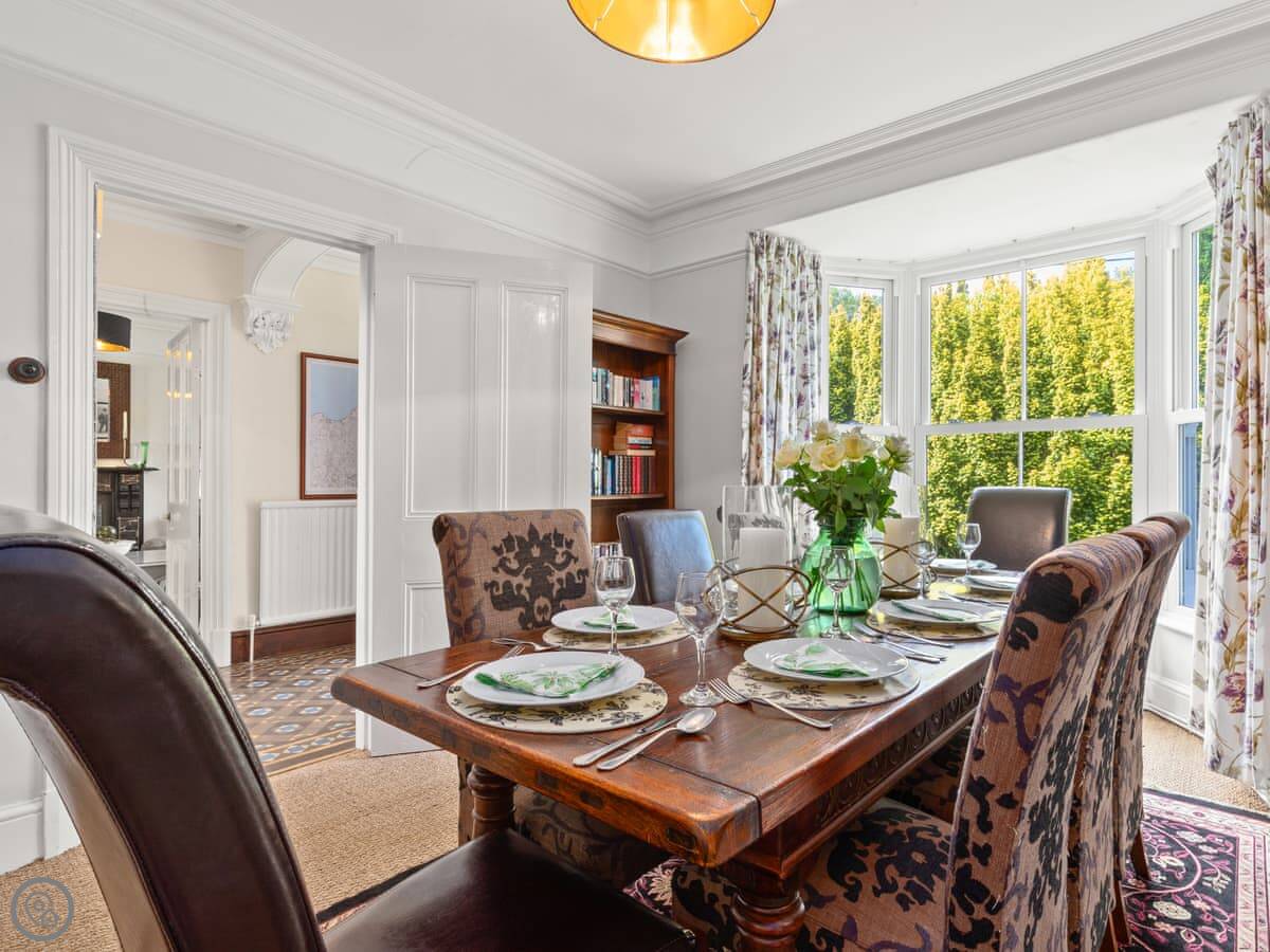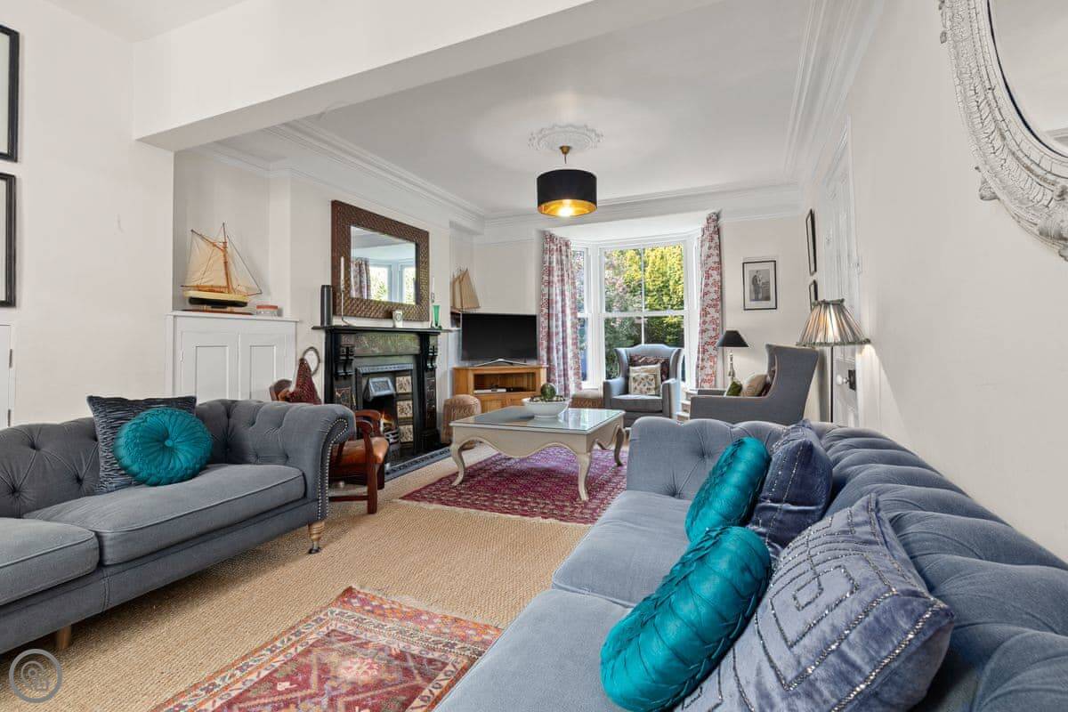 It's a 5 Star place, which means it's done up well. The work kept a lot of the old features like the fireplaces and the tiled floors, but it's got a new kitchen and comfy furniture. The rooms are big and light. The dining room has a table for ten by the bay window.
