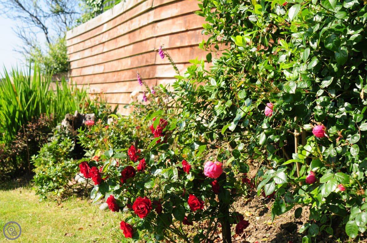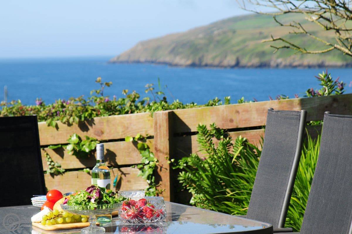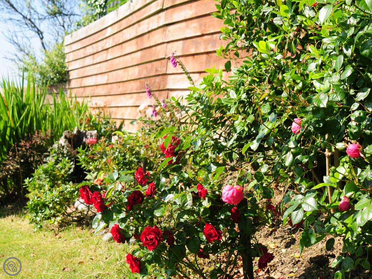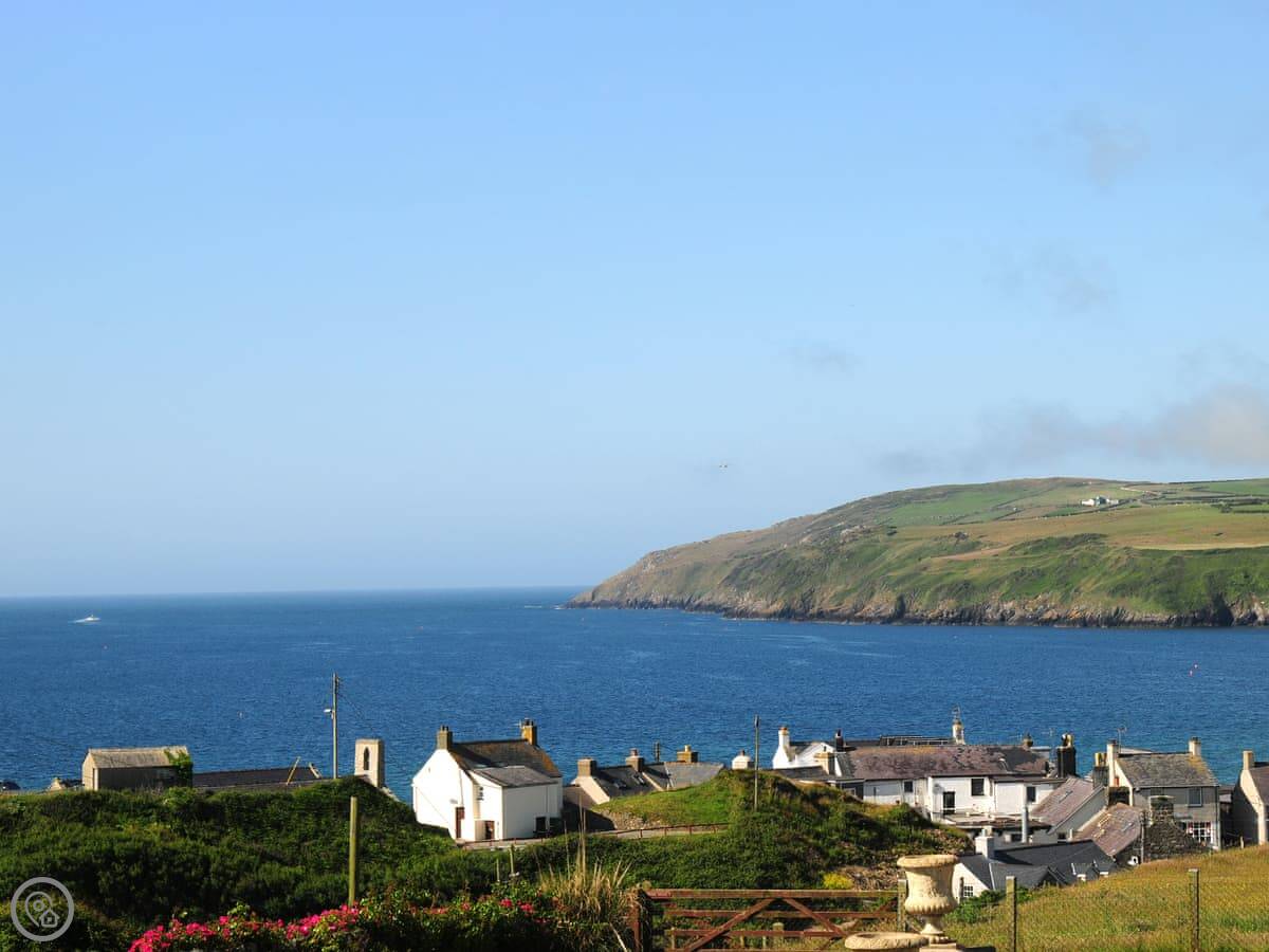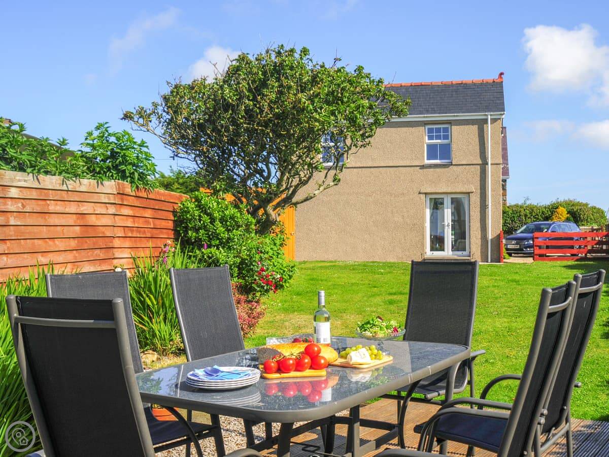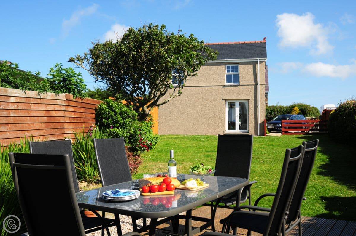 The garden is fully enclosed, which is good if you're bringing dogs. We allow up to three. There's a decked area with a view over the fields to the sea. The sunsets from there are very good.