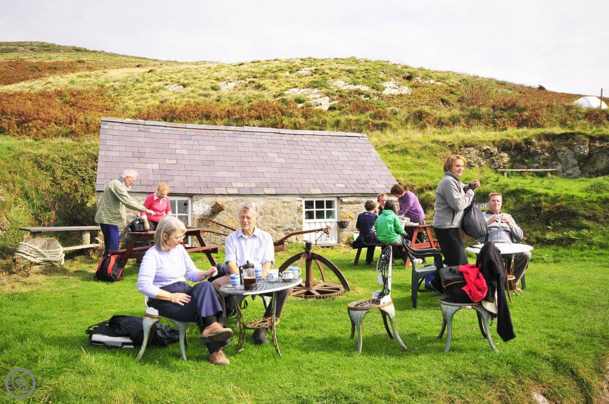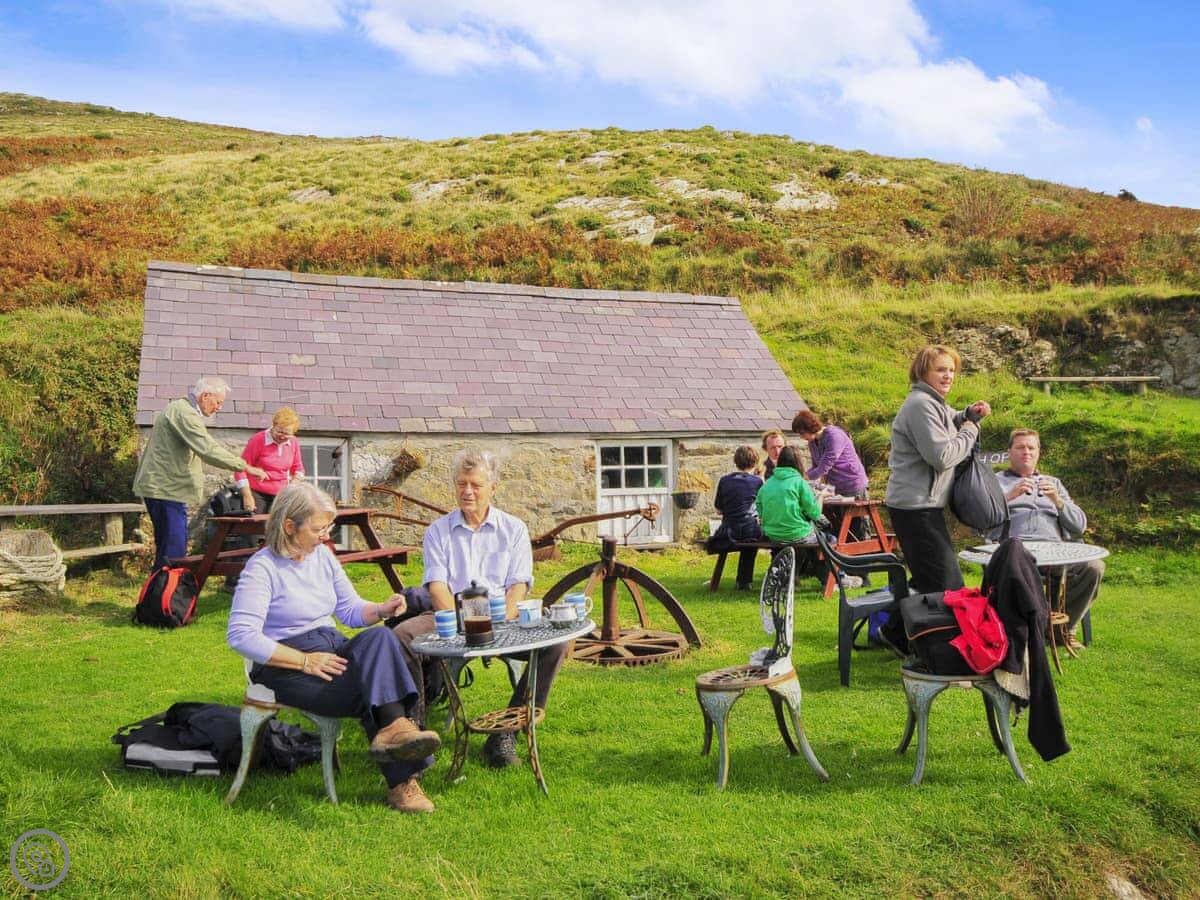 Aberdaron itself is a five-minute walk. You've got two hotels that do meals, a couple of tea rooms, a chip shop, a bakery, and a shop for basics. The beach is right there. The National Trust has a visitor centre in the village. A short walk through their car park takes you to a wood-fired beach sauna, if that's your thing.