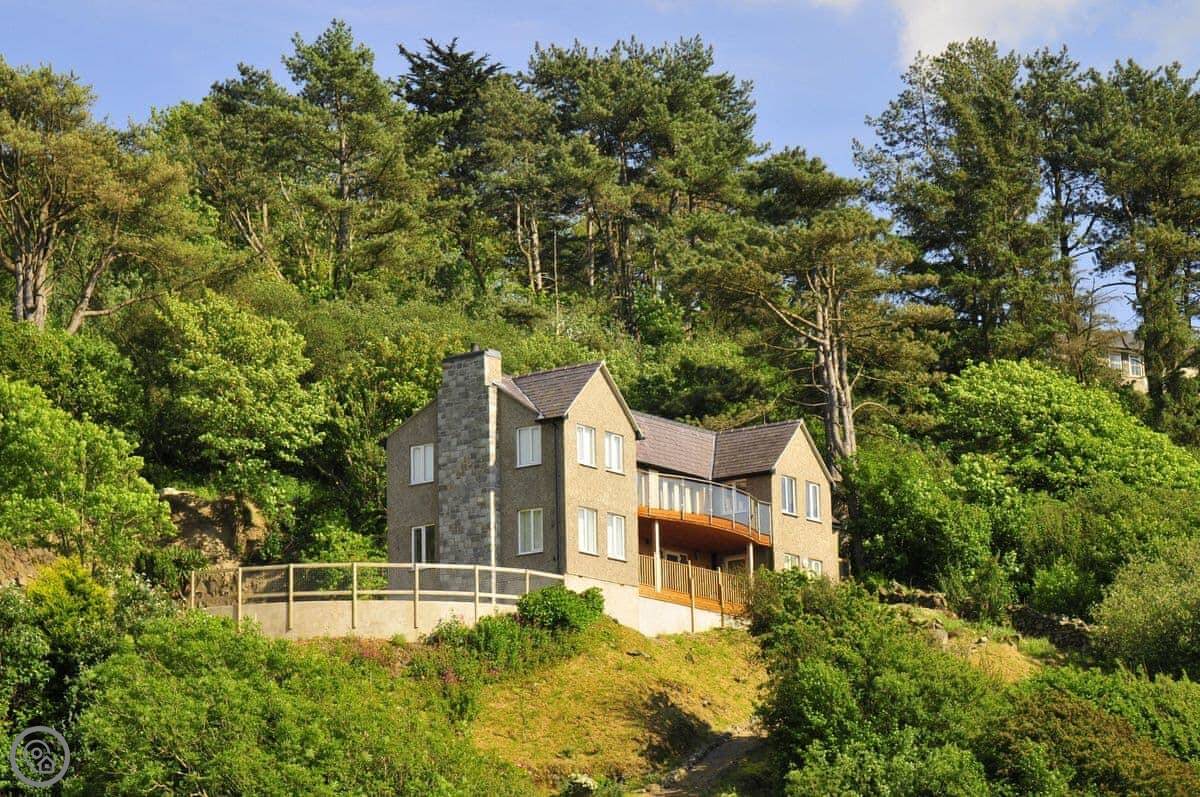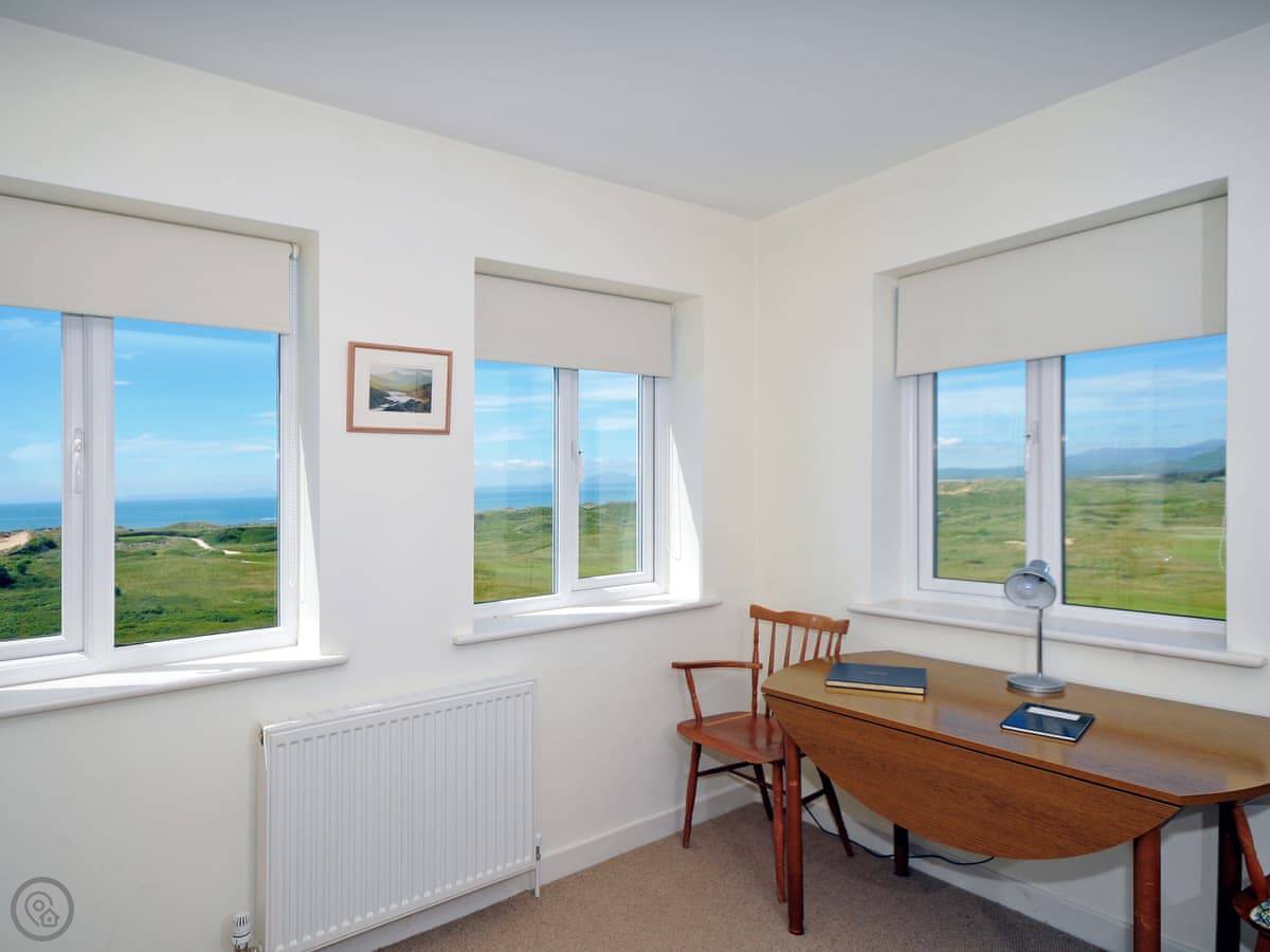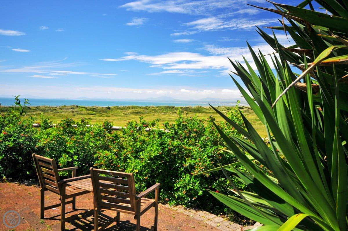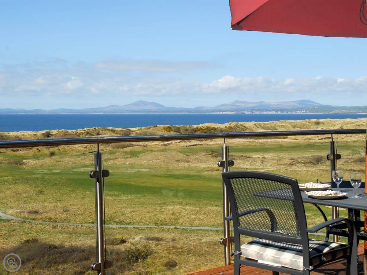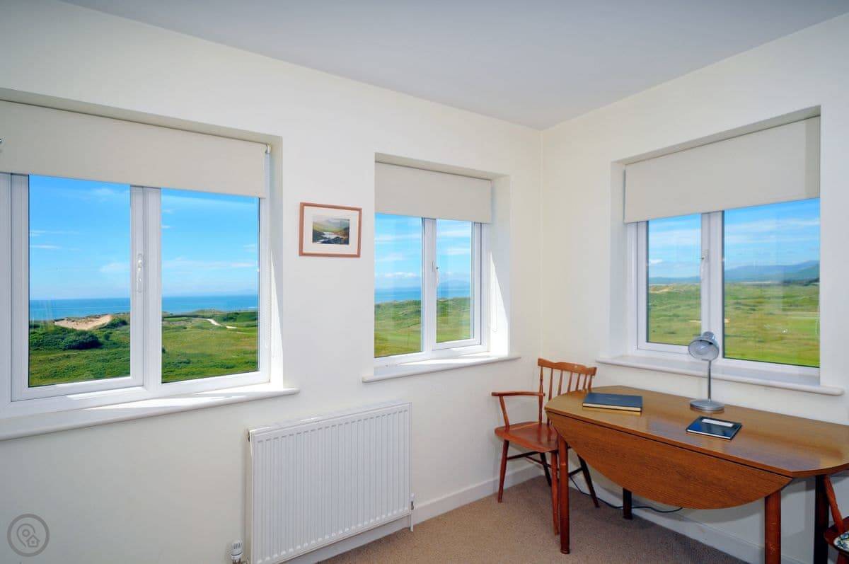 Tir Gafr is on the outskirts of Harlech. It's a modern house, detached, built into the hill. The front looks out over the golf course to the sea. The view is the main thing. You can see all the way from Snowdon, across the bay to Shell Island.