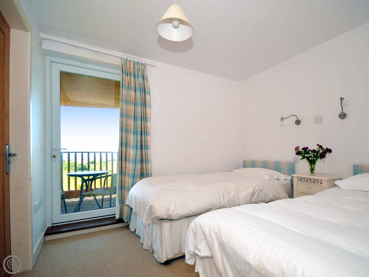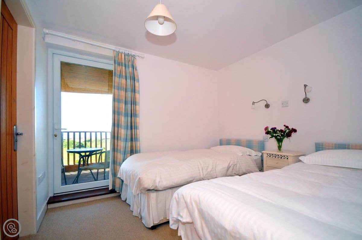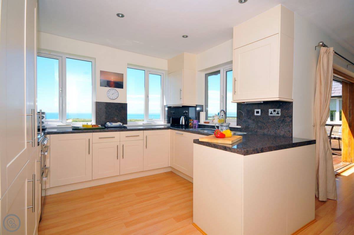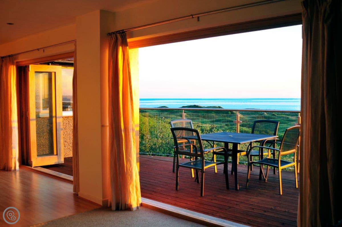 The living area is upstairs. Kitchen, dining, and sitting room all together, with big sliding doors out to a balcony. You'll eat out there if the weather's any good. Downstairs, three of the bedrooms have their own doors to a lower terrace.