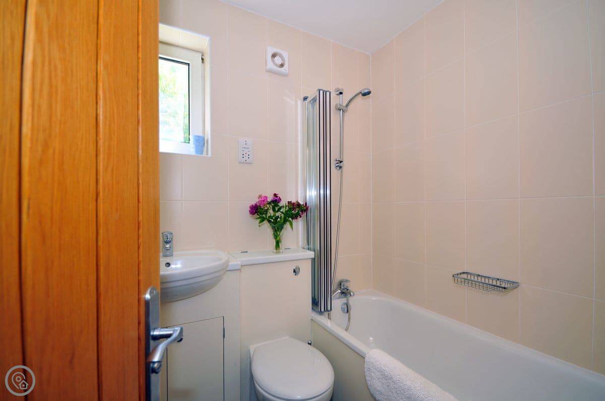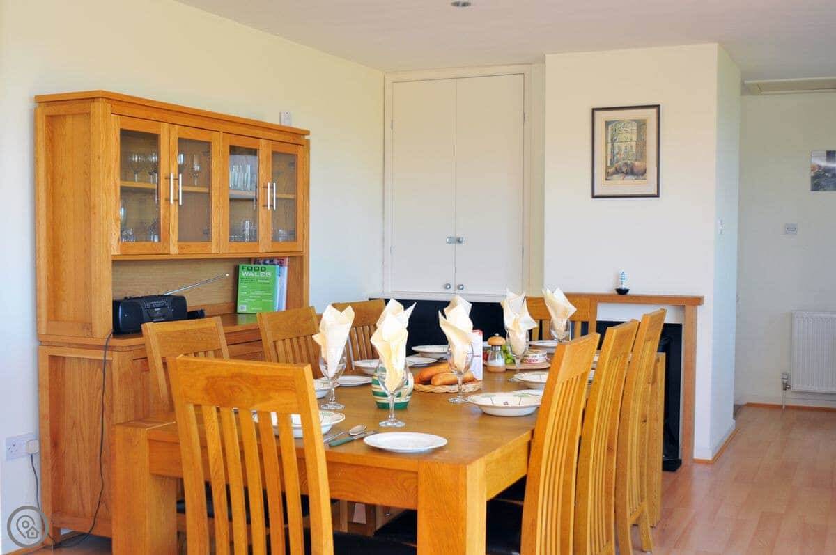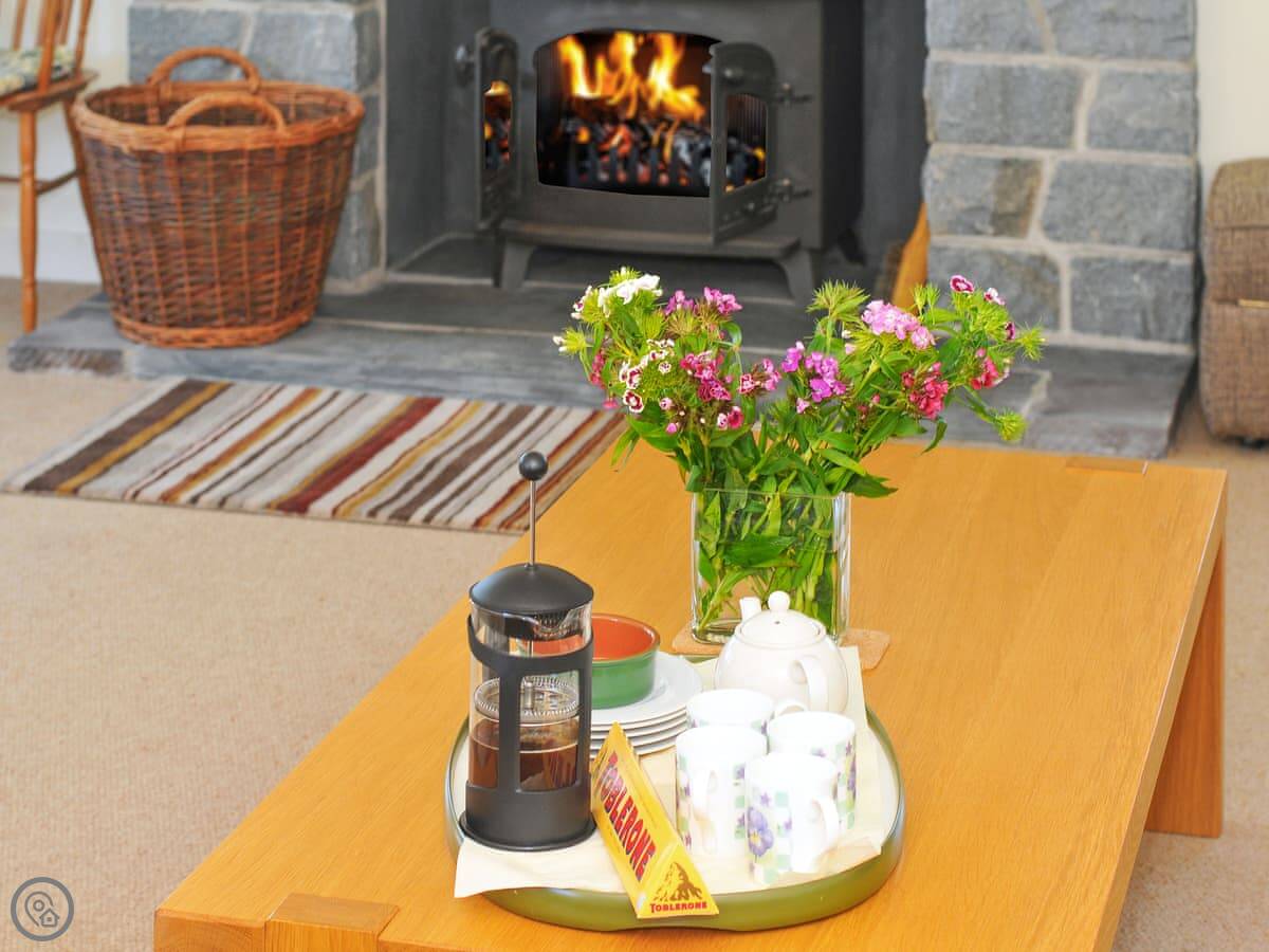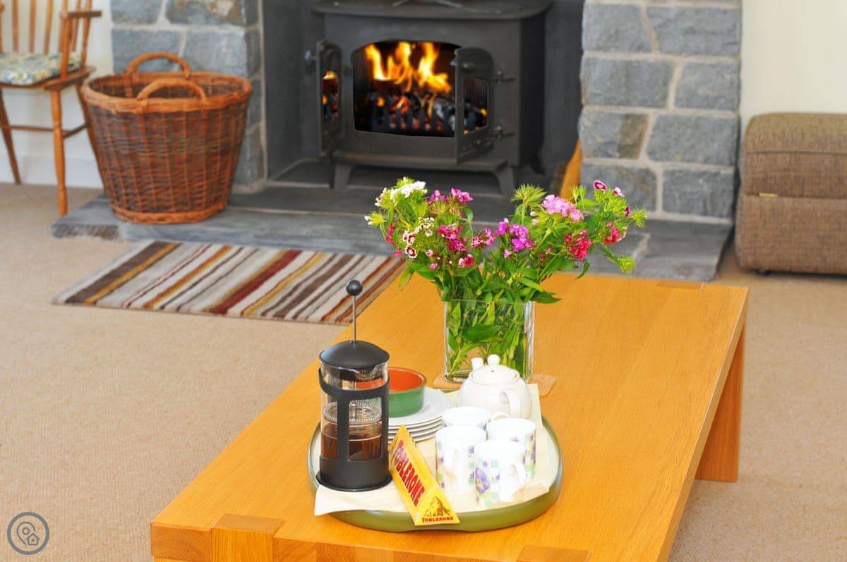 Inside, it's got what you'd expect: washing machine, dishwasher, WiFi, TV. There's a wood burner for cooler evenings. Parking for a couple of cars on the drive. There's an electric vehicle charger now.