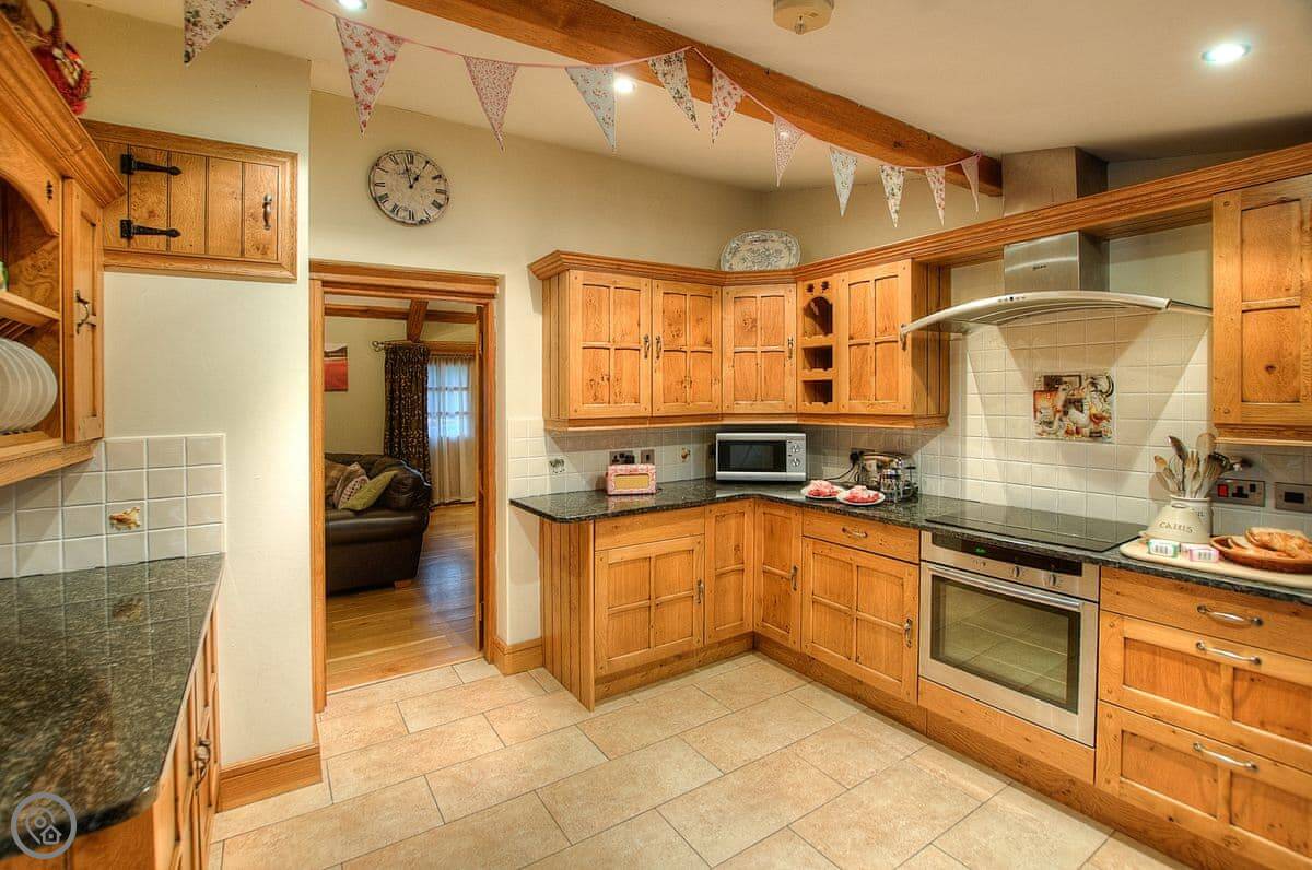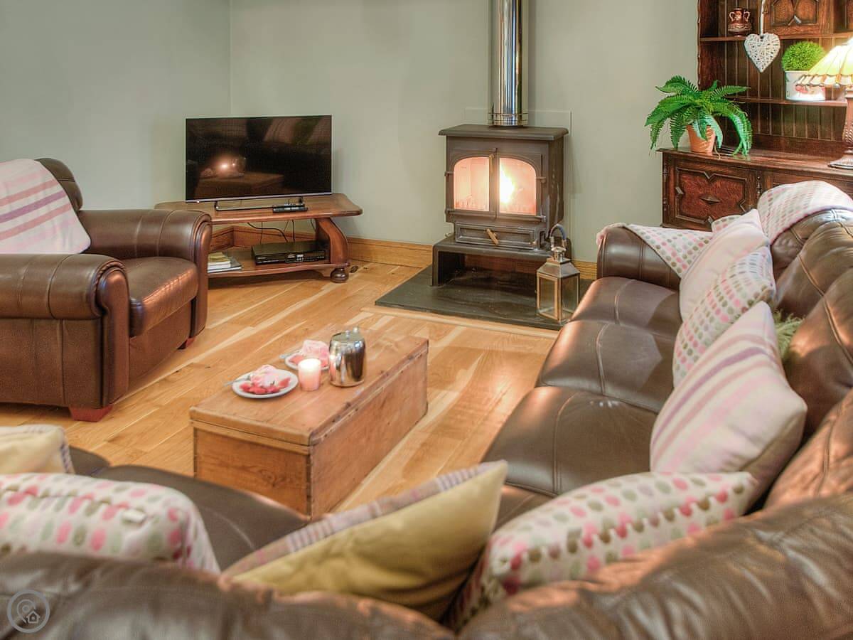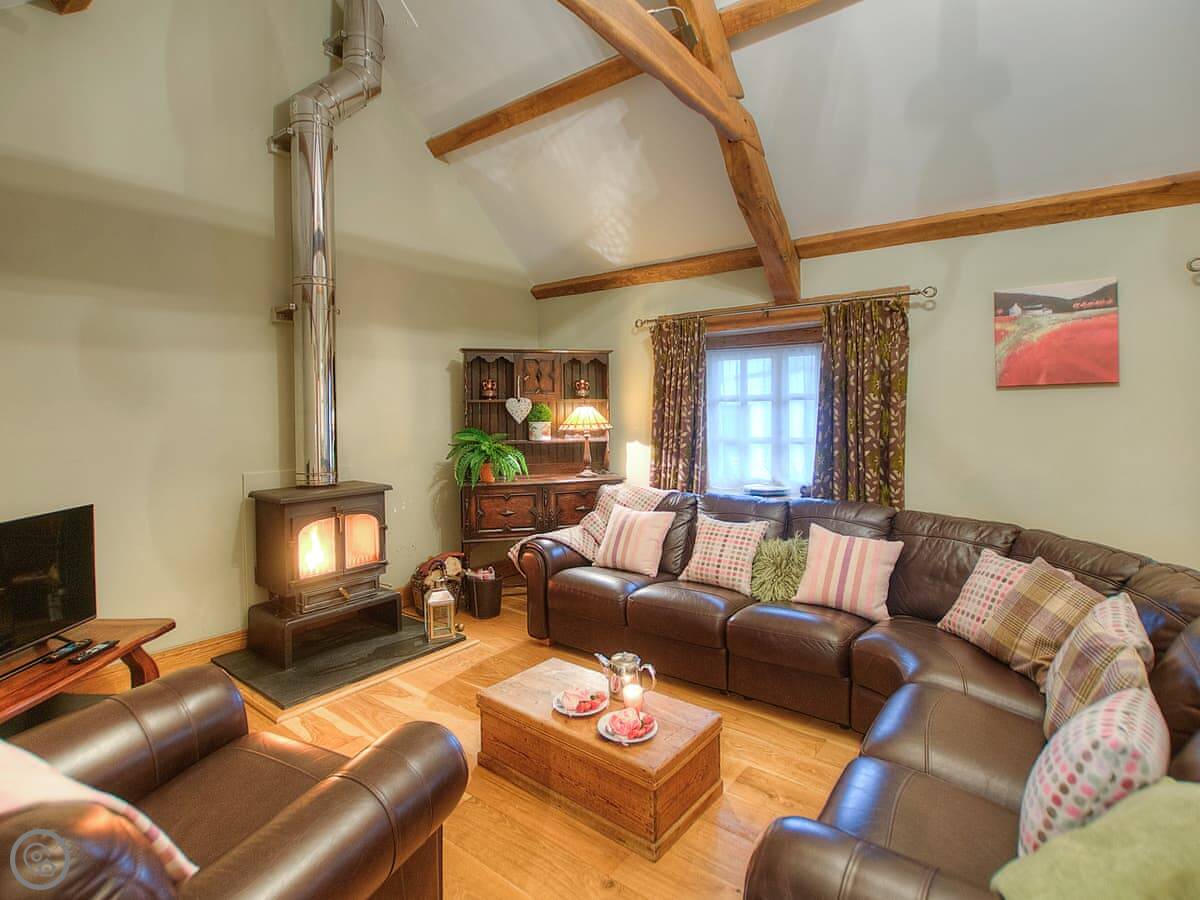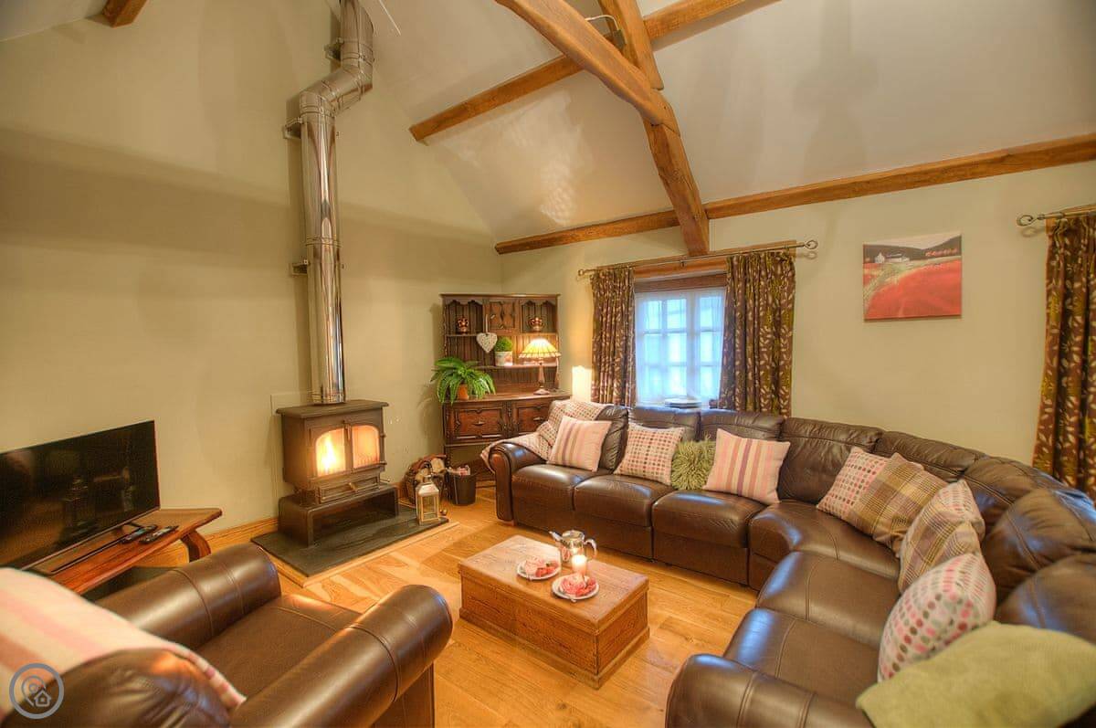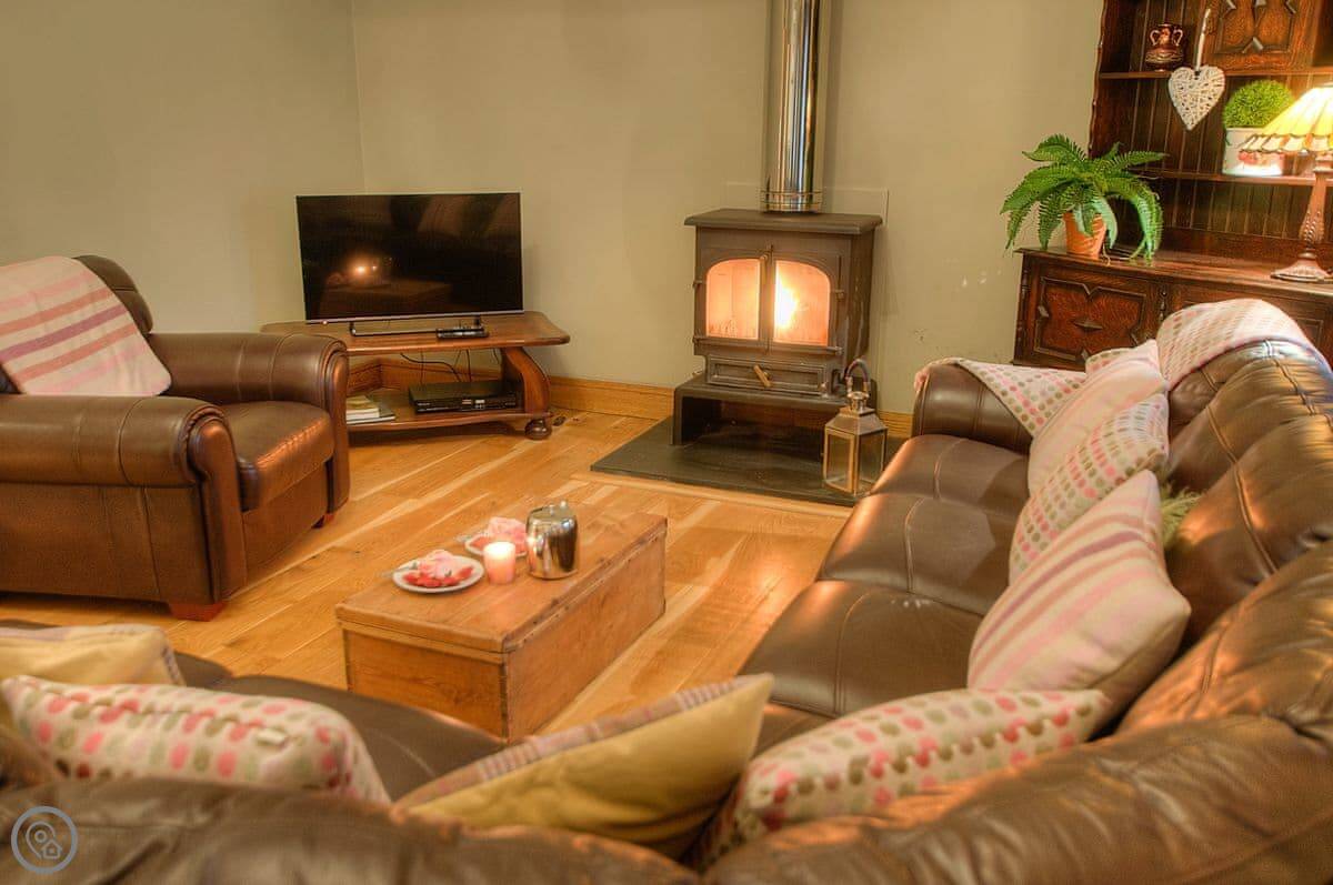 The main room is big, with a high ceiling and a wood burner. There's a leather sofa, TV, WiFi. We've put in a dishwasher and a washing machine. Bedding and towels are included. The entrance is wheelchair accessible, and there's parking right outside.
