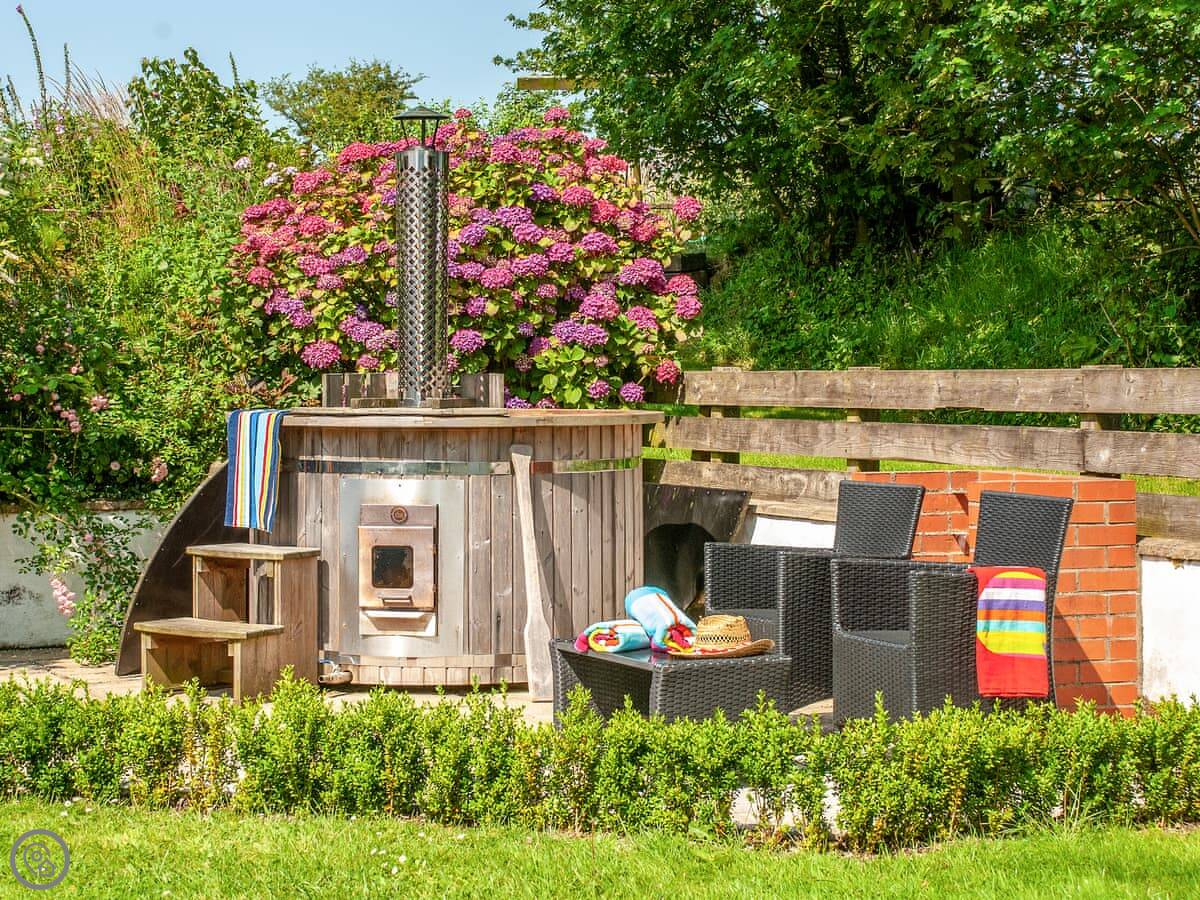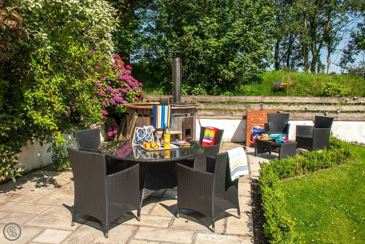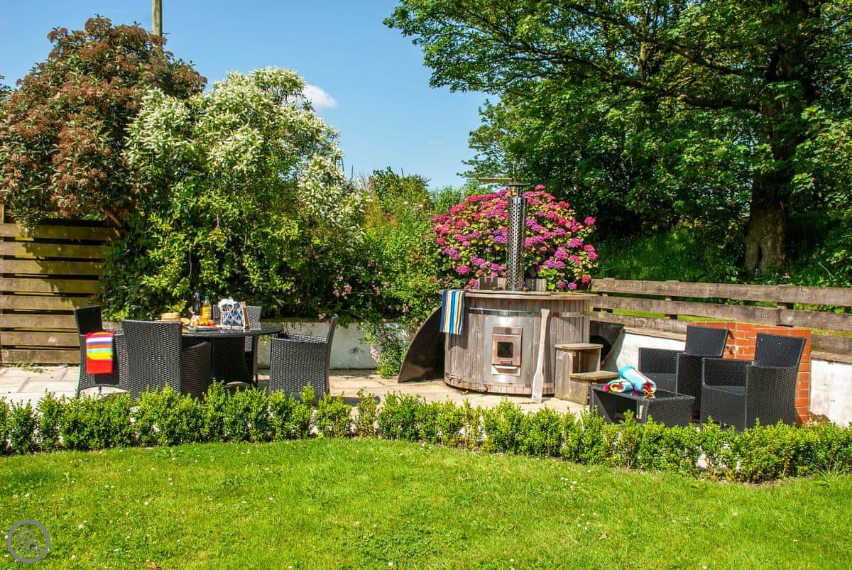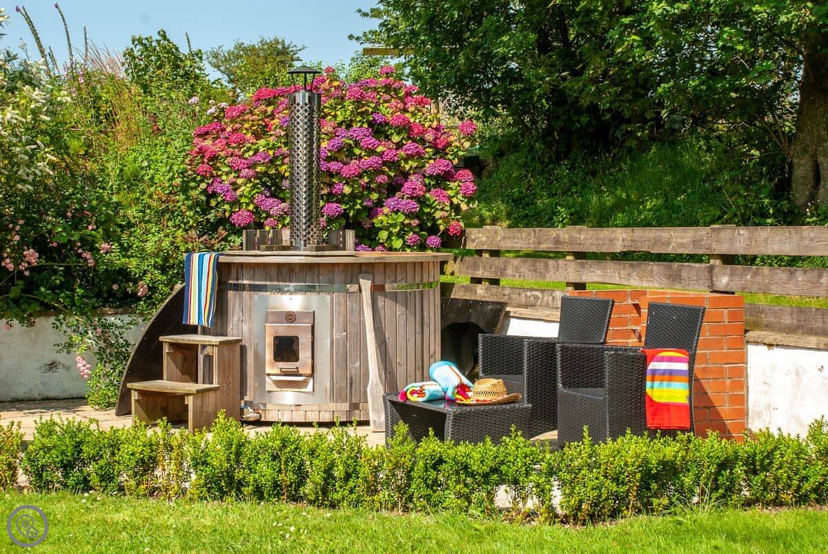 Outside, there's a wood-fired hot tub. You have to light it yourself, it takes a few hours to heat. It's under the open sky. There's also a BBQ.