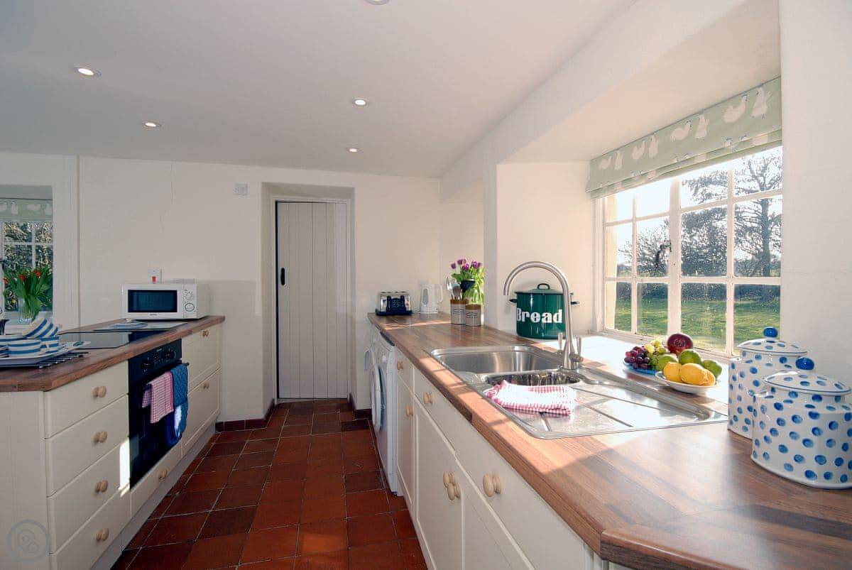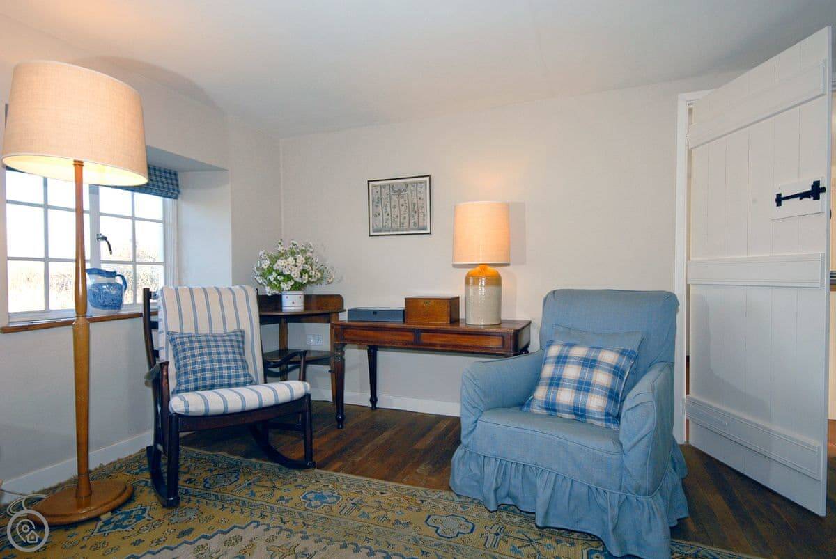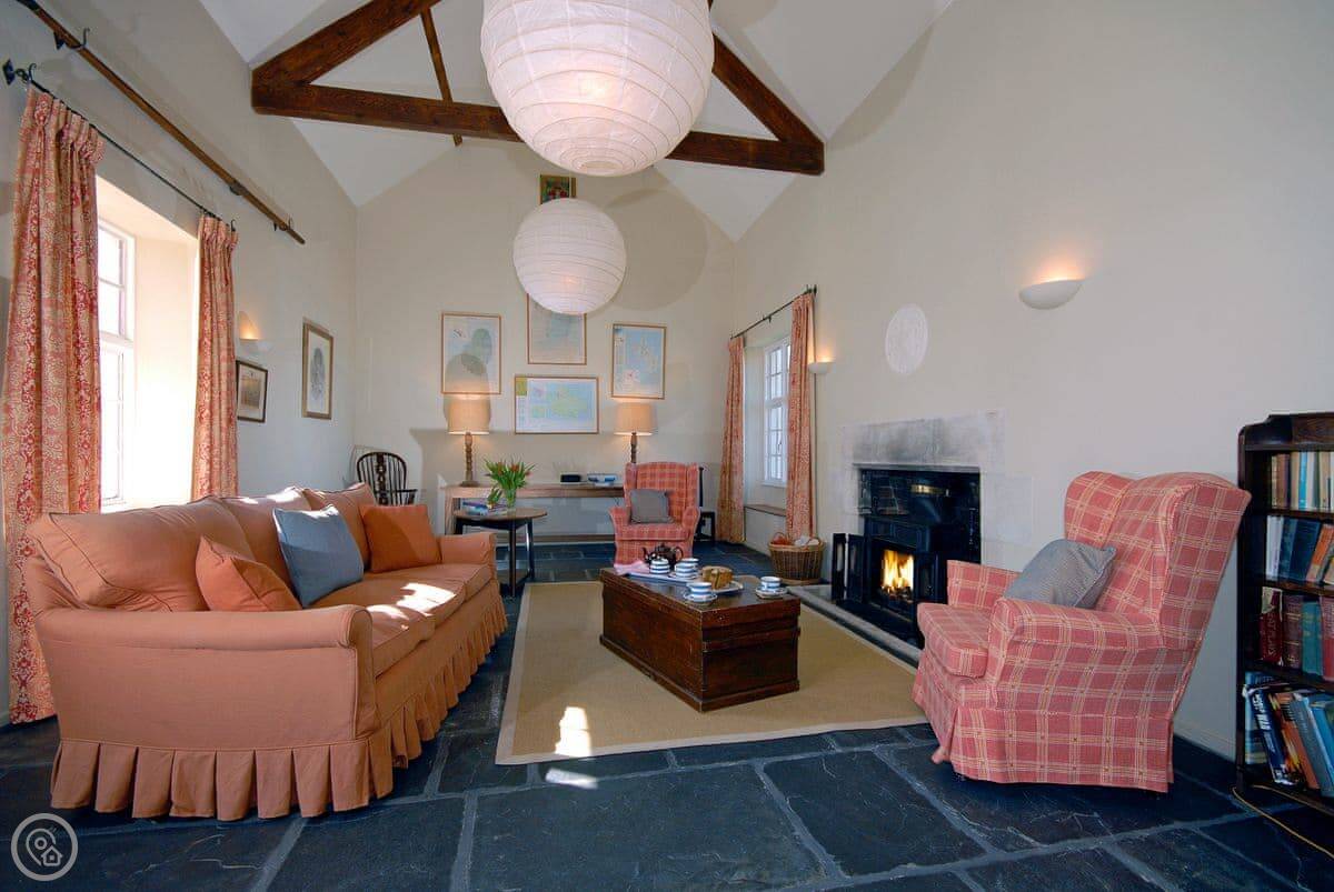 Set back from the Fishguard to St Davids road and designed by one of the last practicing architects of the Arts & Craft movement, the house has been completely refurbished and renovated, preserving its distinctive heritage within a comfortable, delightful house. The spacious sitting room is designed in the style of a medieval hall with a slate floor, splendid high beamed ceiling, large log burning stove. The elm wall panelling is decorated with carved wooden figures on a former ’minstrel’s gallery’ and underfloor heating ensures that it is a truly warm and restful space. In the older part of the house, the ’parlour’ is a cosy room with comfortable sofas, a large stone fireplace and low beamed ceiling.
