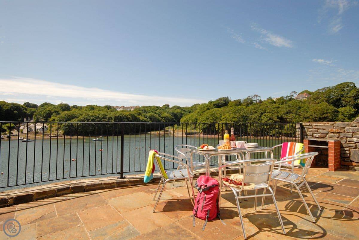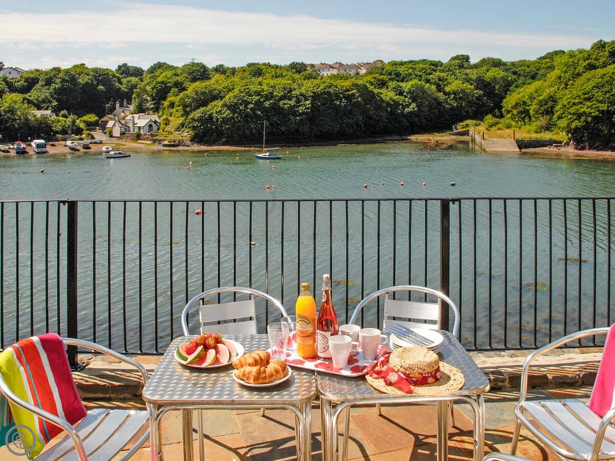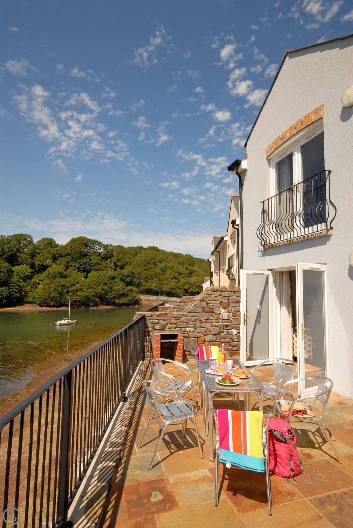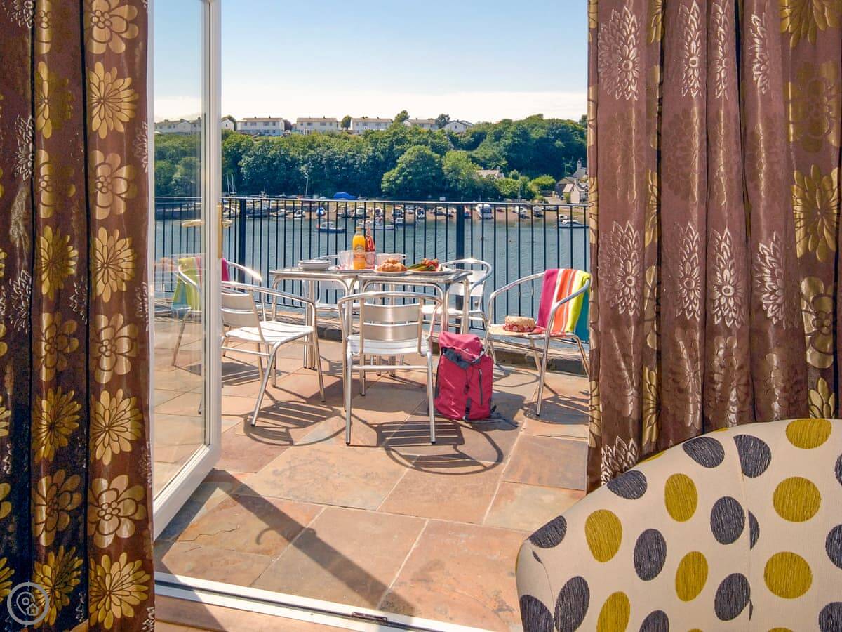The main living area is open plan, with patio doors that open onto the terrace. It's a good spot to sit and watch the tide go in and out. There are steps down from the garden to the waterline, so if you've got kayaks or like poking around on the shore, you're sorted.