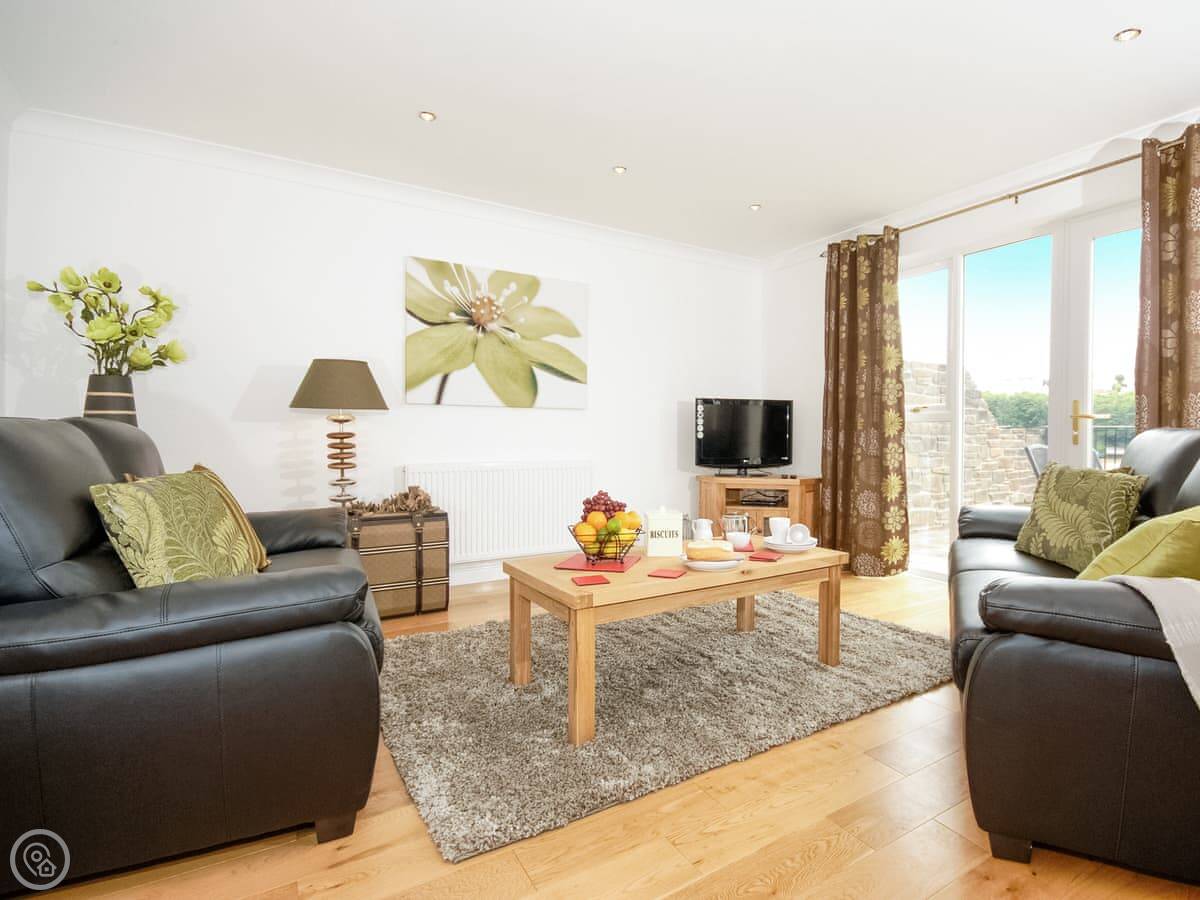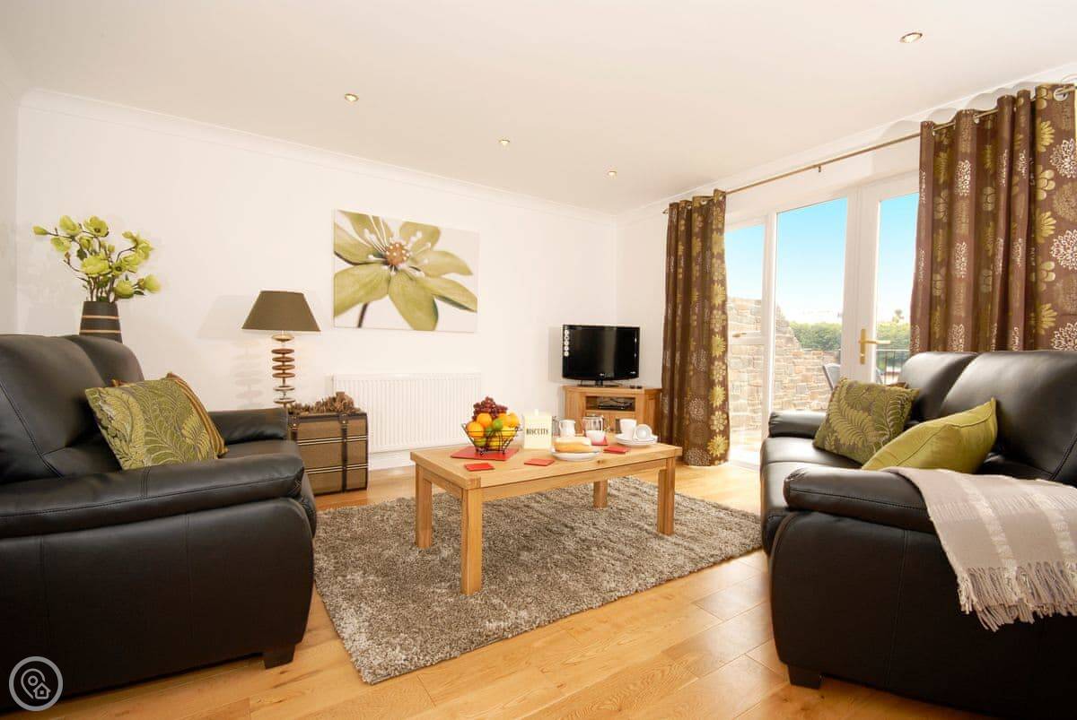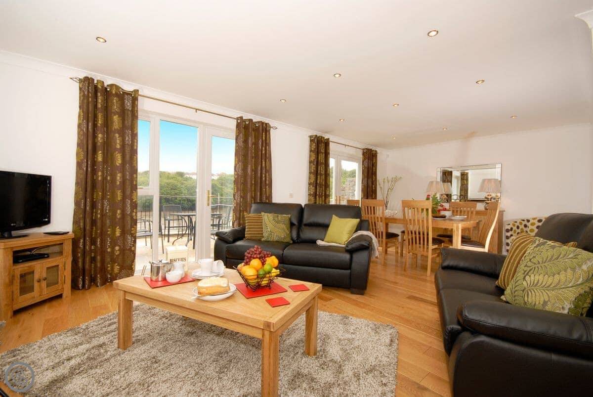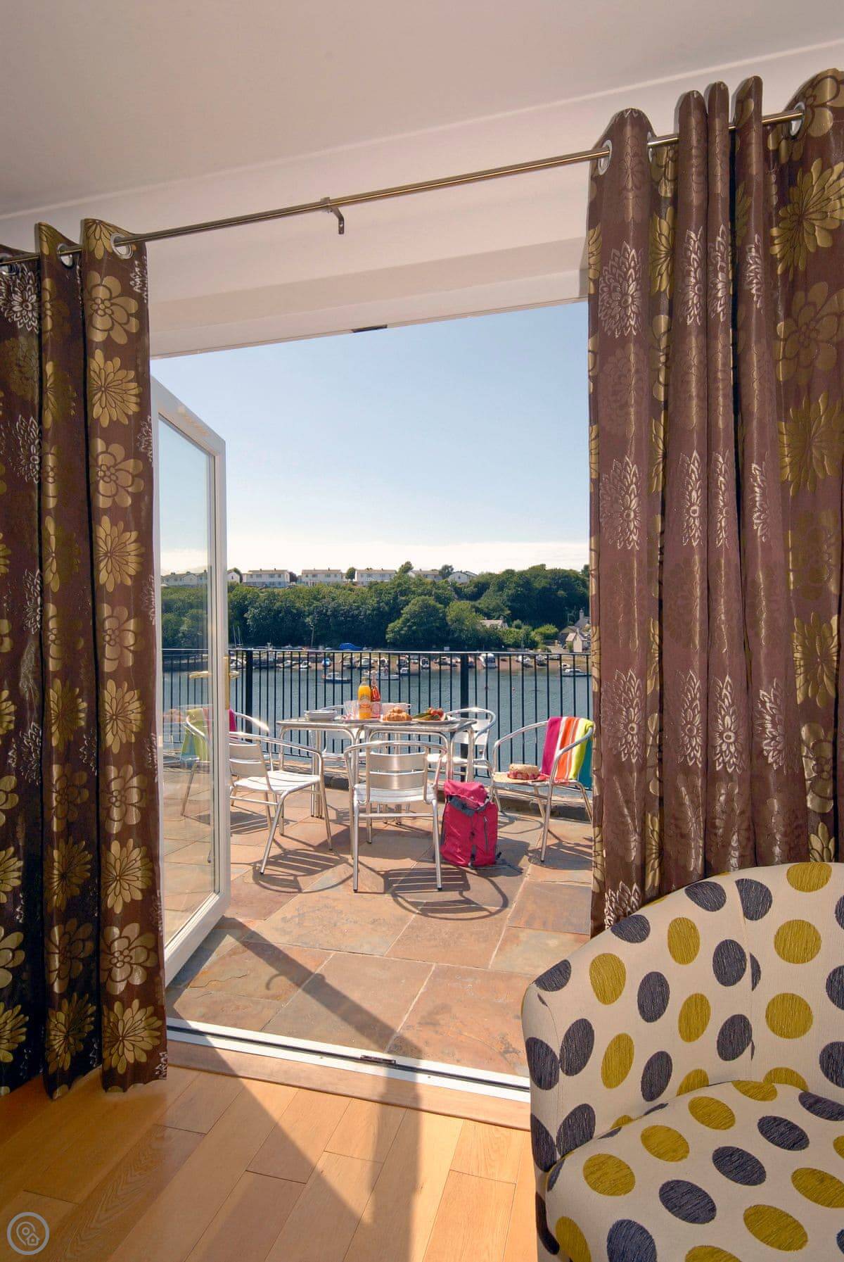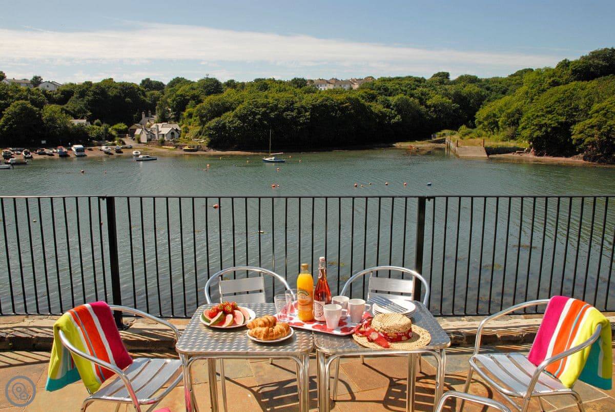 The main living area is open plan, with patio doors that open onto the terrace. It's a good spot to sit and watch the tide go in and out. There are steps down from the garden to the waterline, so if you've got kayaks or like poking around on the shore, you're sorted.